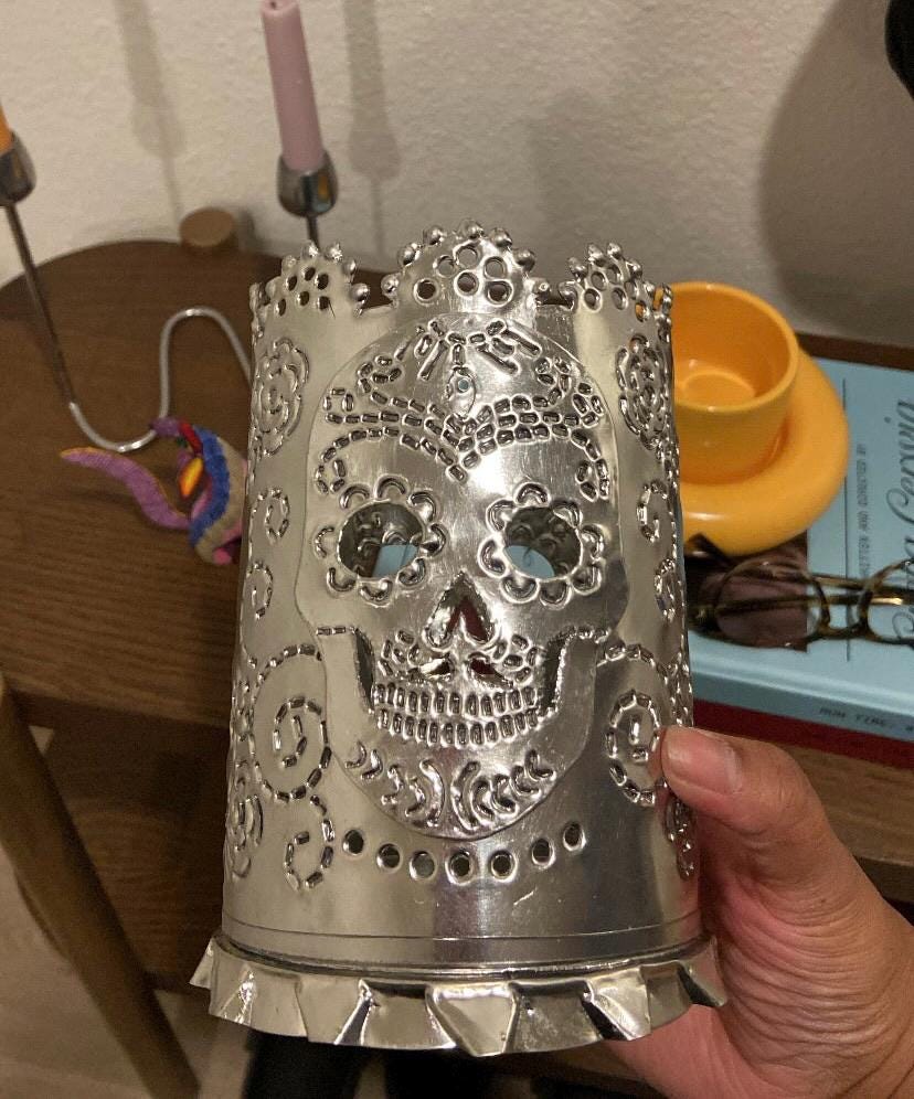 SET of 2 Charming punched tin luminarias with Day of the Dead skull on both sides.