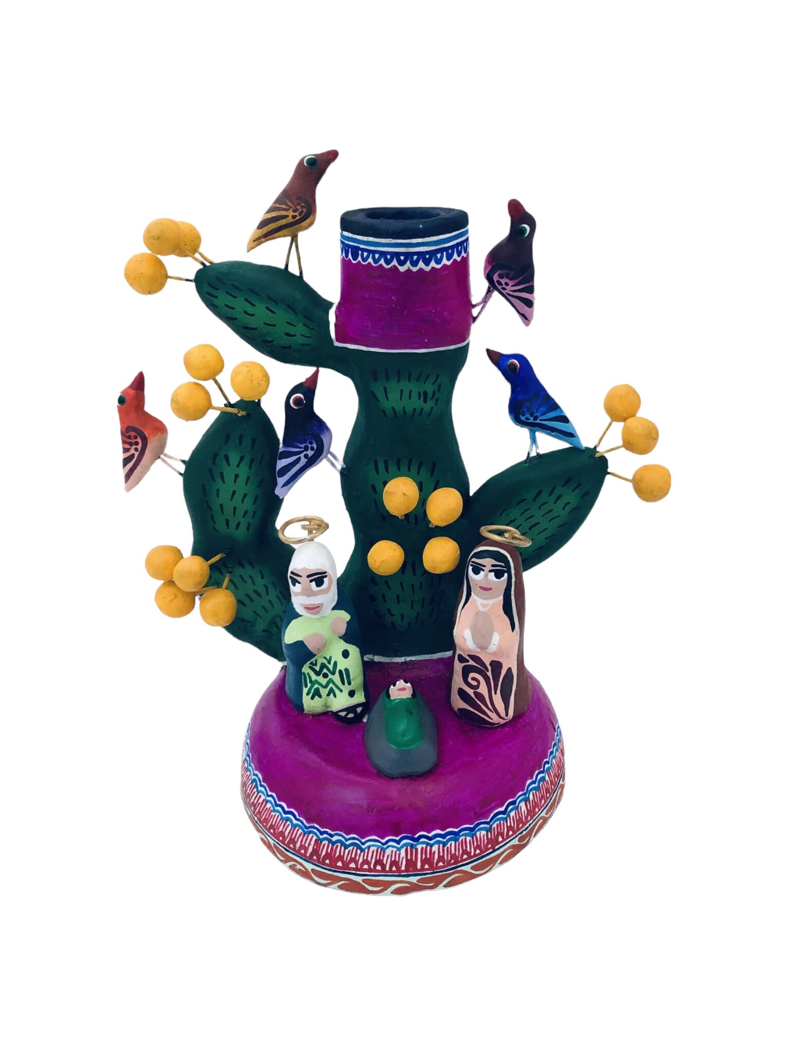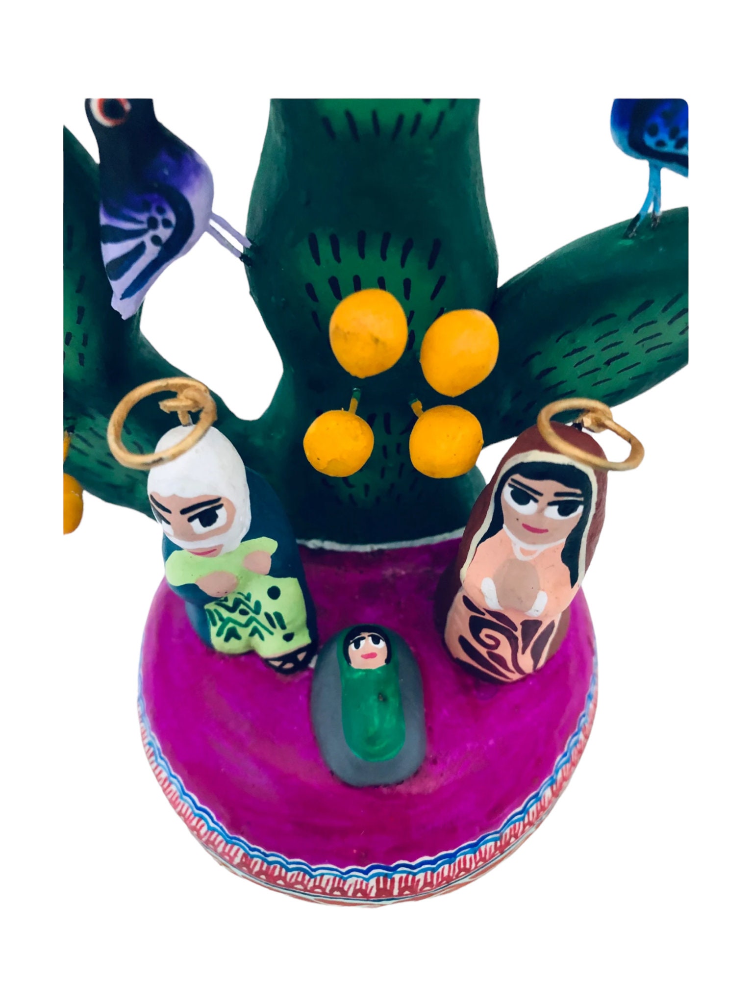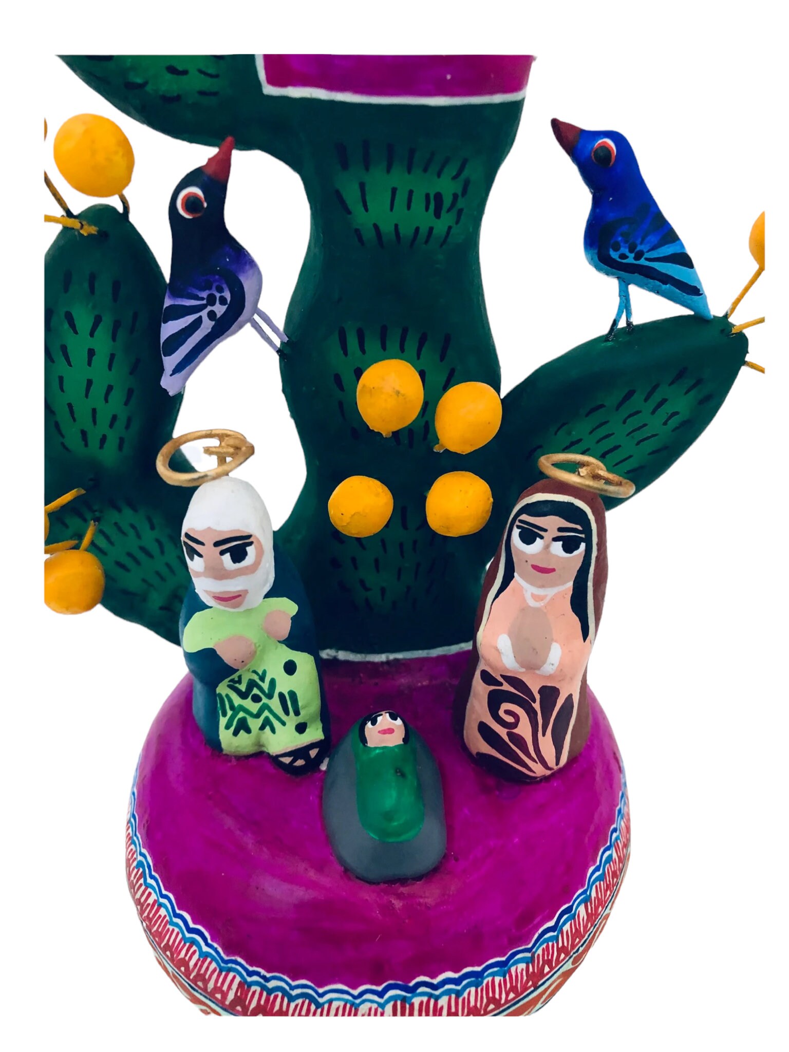 Joseph, Mary and baby Jesus at the base of the Cactus which is decorated with birds on wire that extend out.