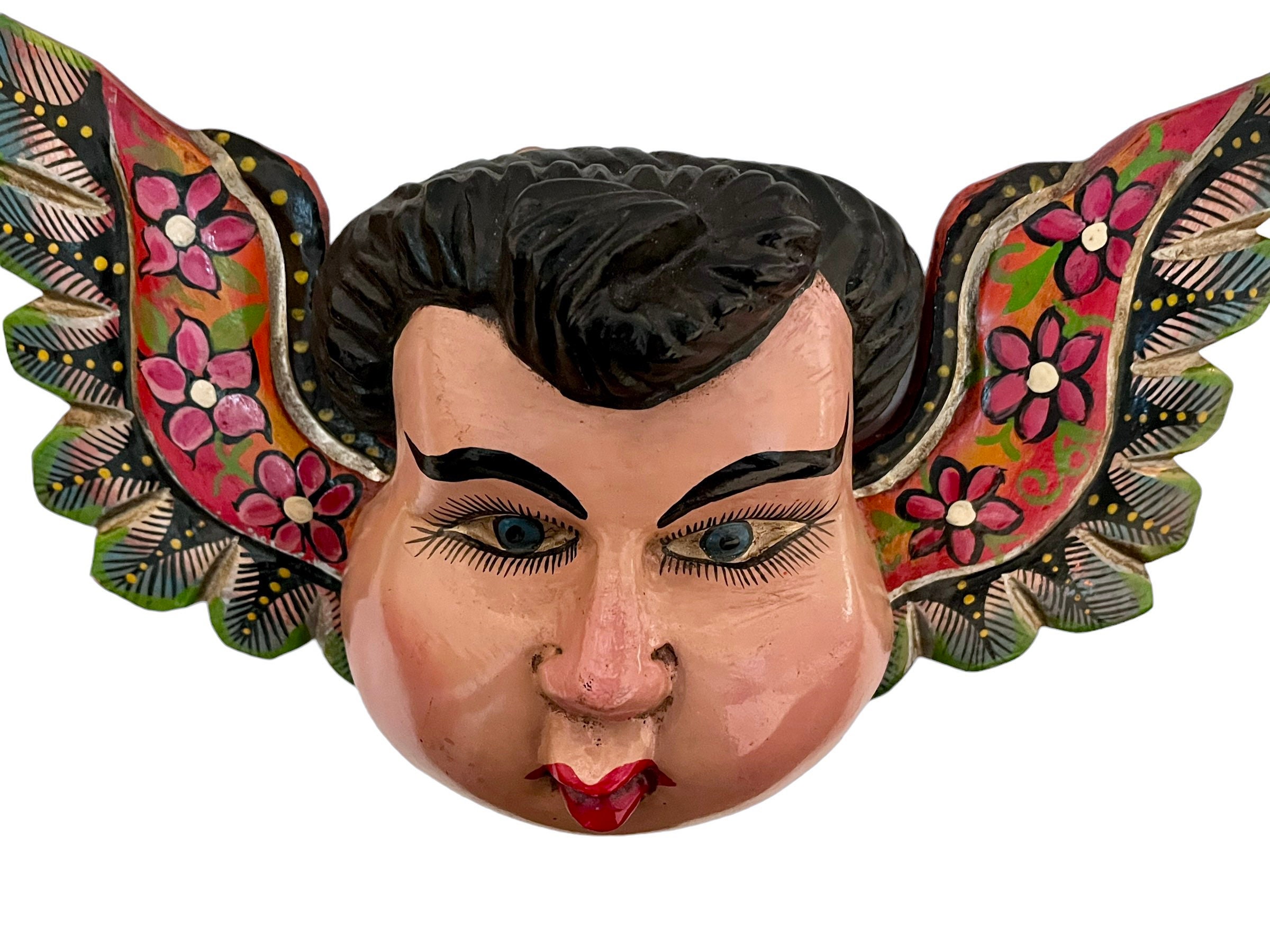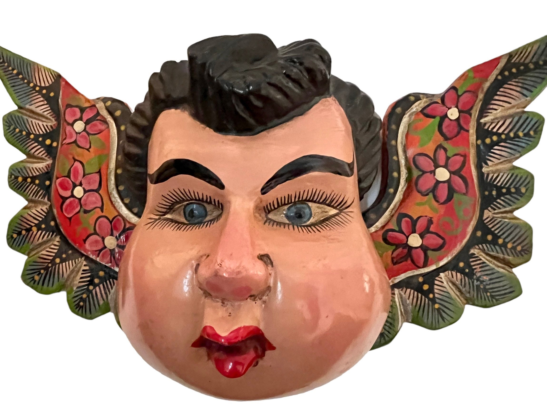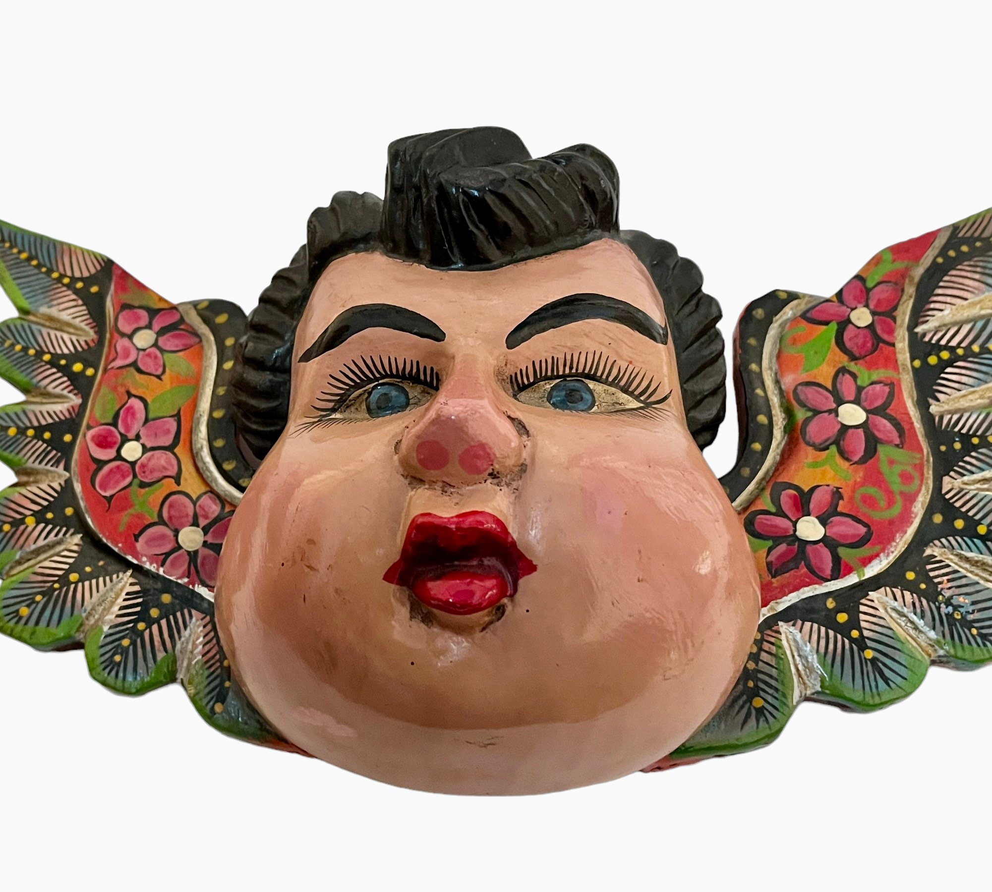 Sweet carving with chubby cheeks, beautiful blue eyes and bright red puckered lips.