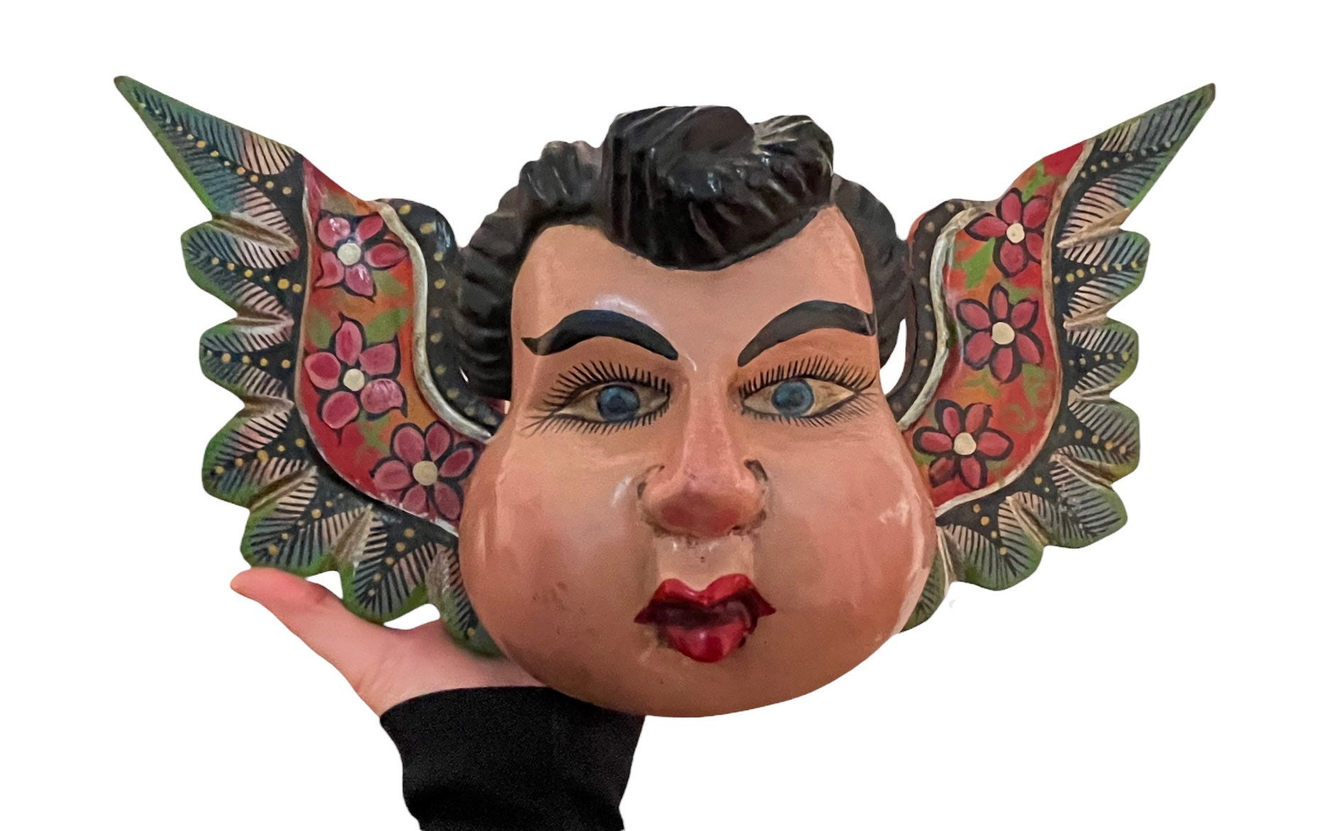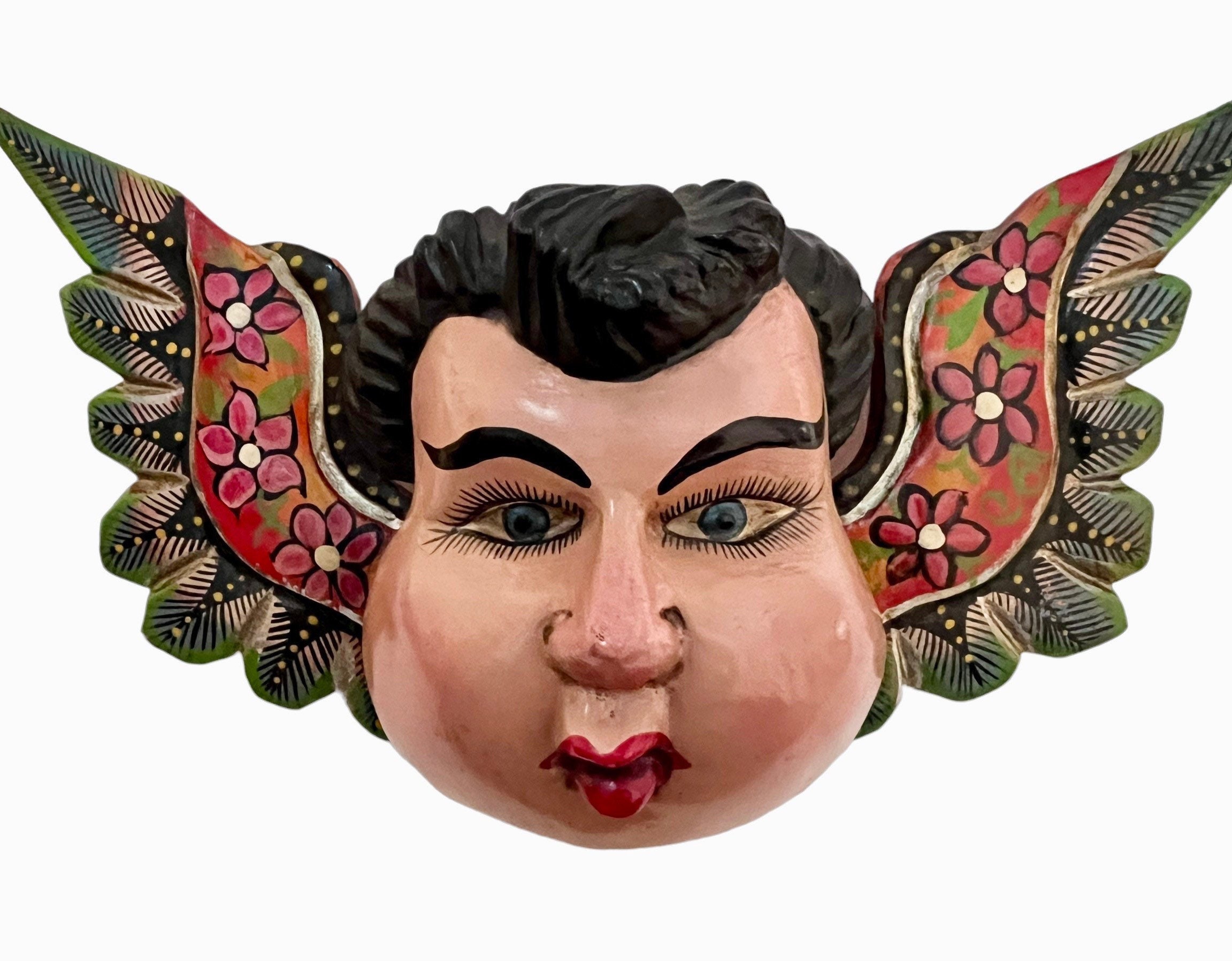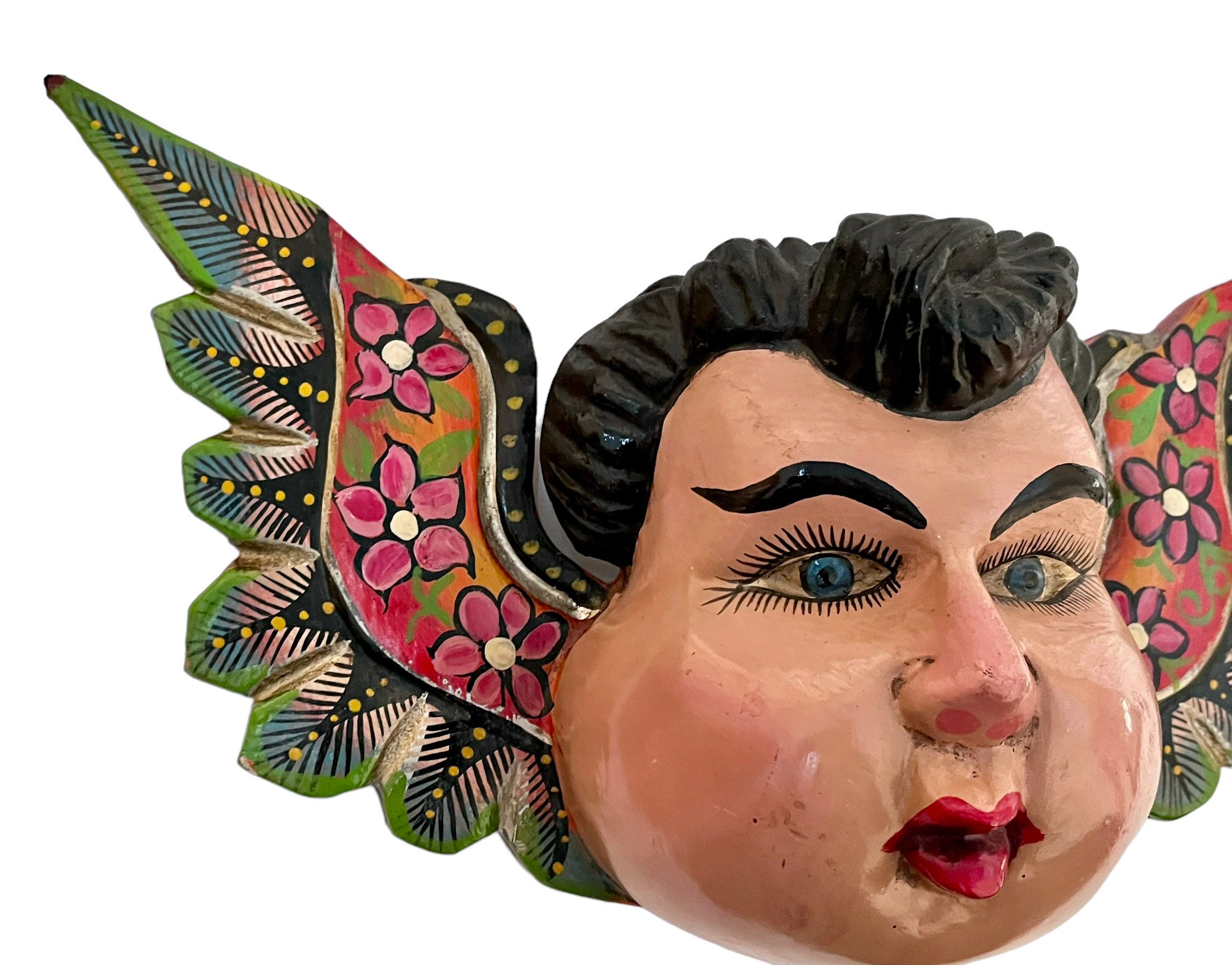 Sweet carving with chubby cheeks, beautiful blue eyes and bright red puckered lips.