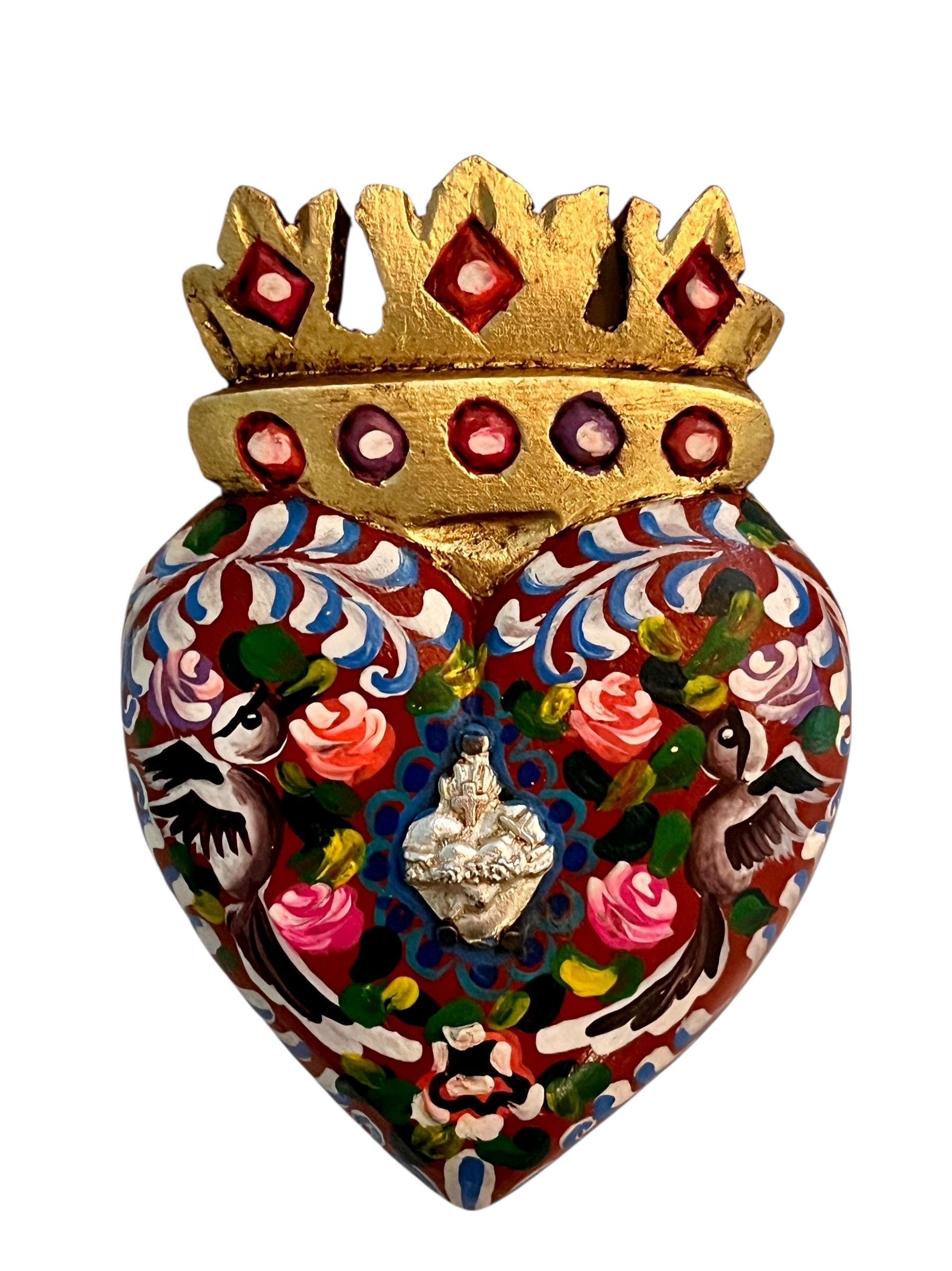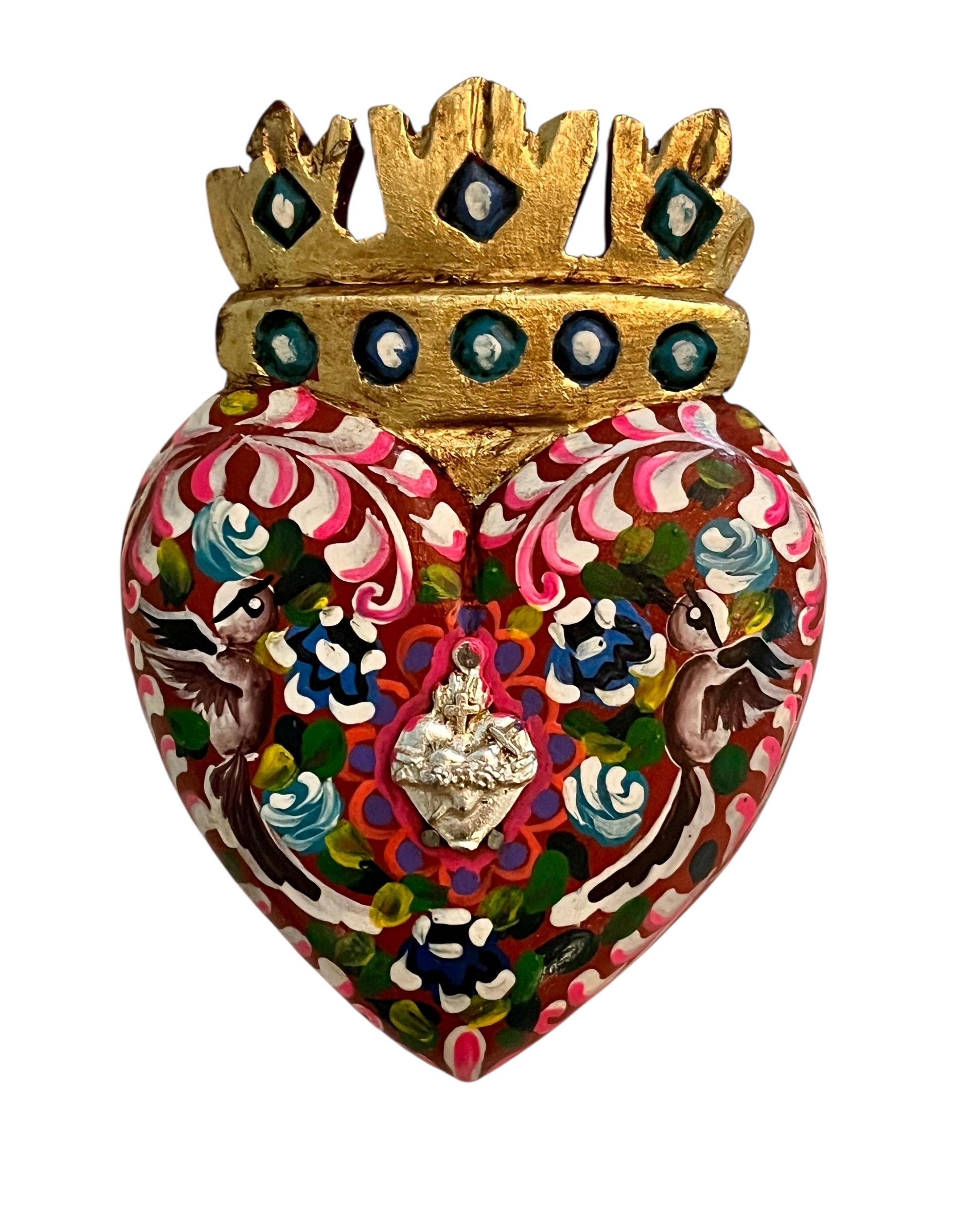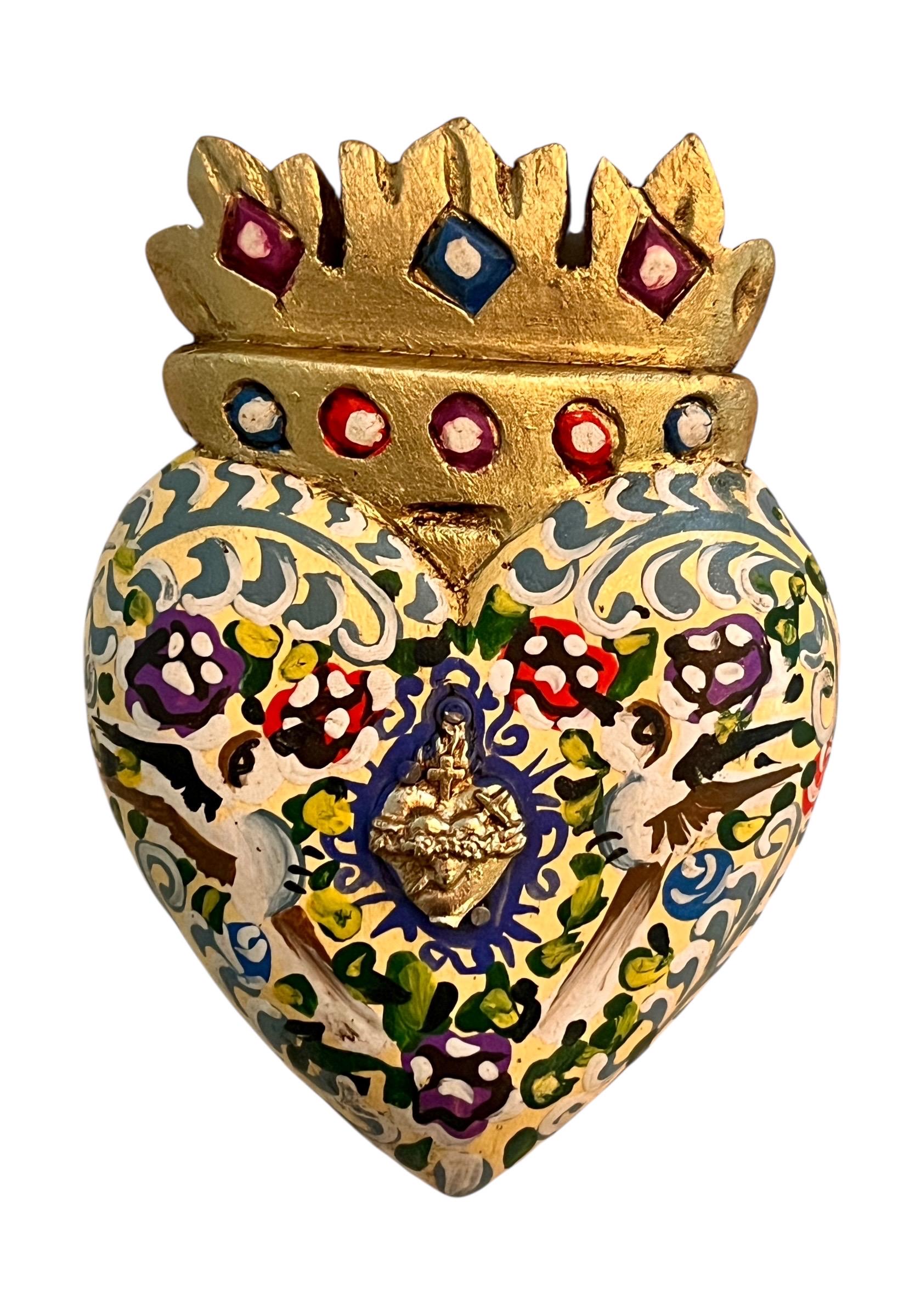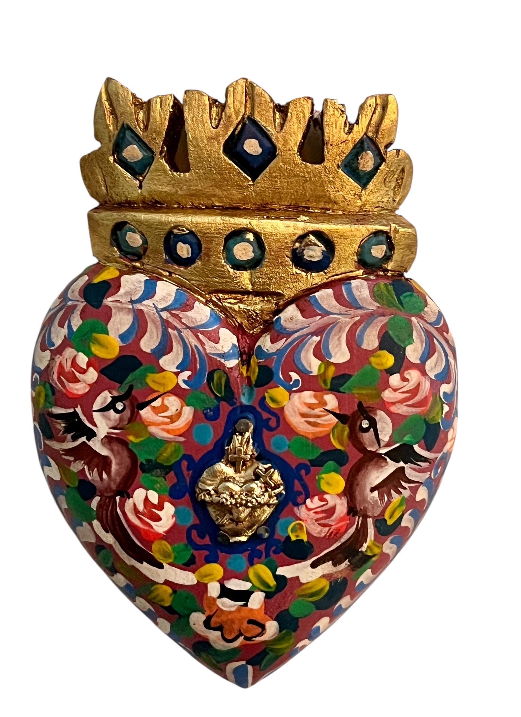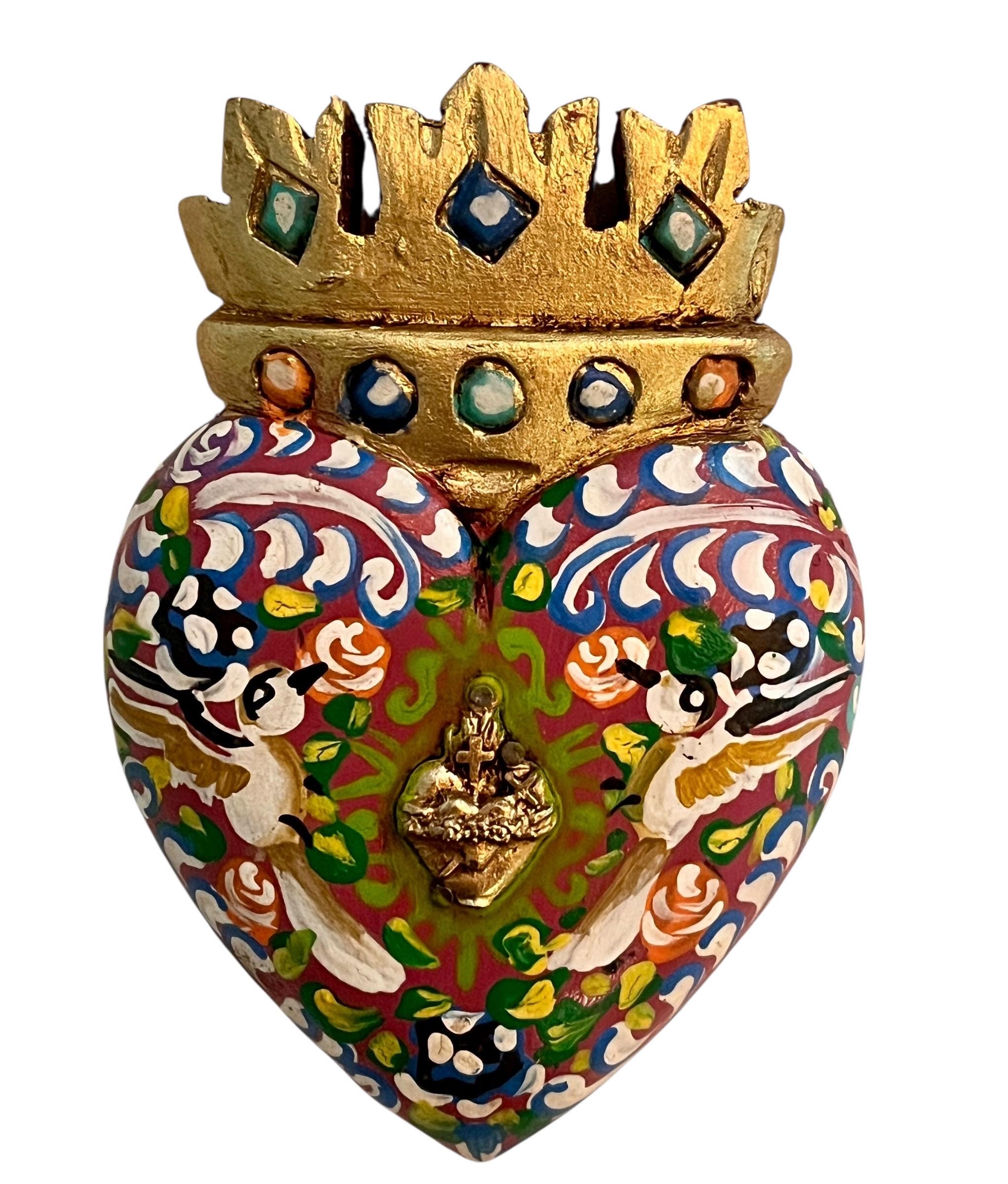 Small wood heart with Crown flame painted in a colorful floral design with doves and a Sacred Heart charm in the center.