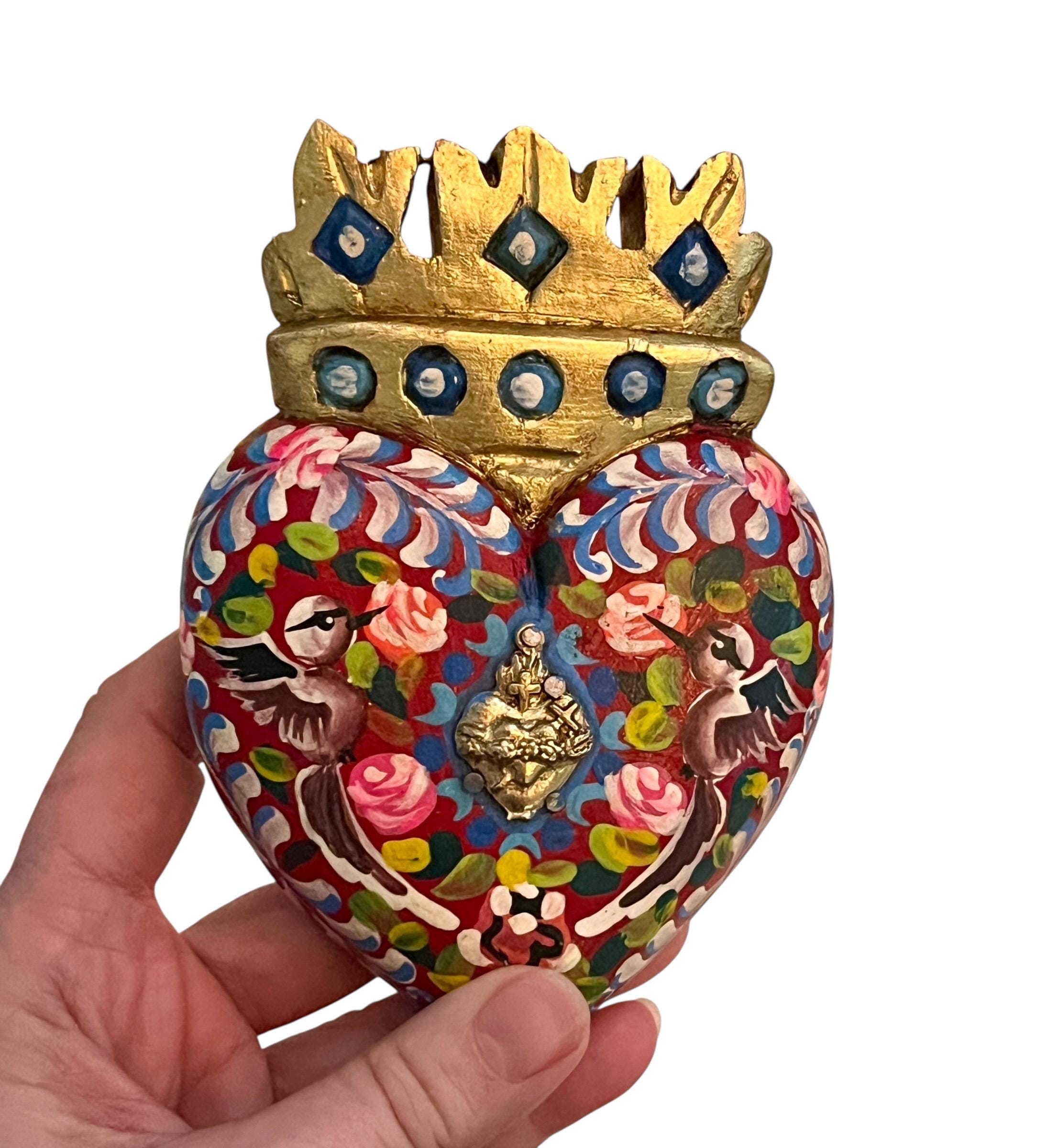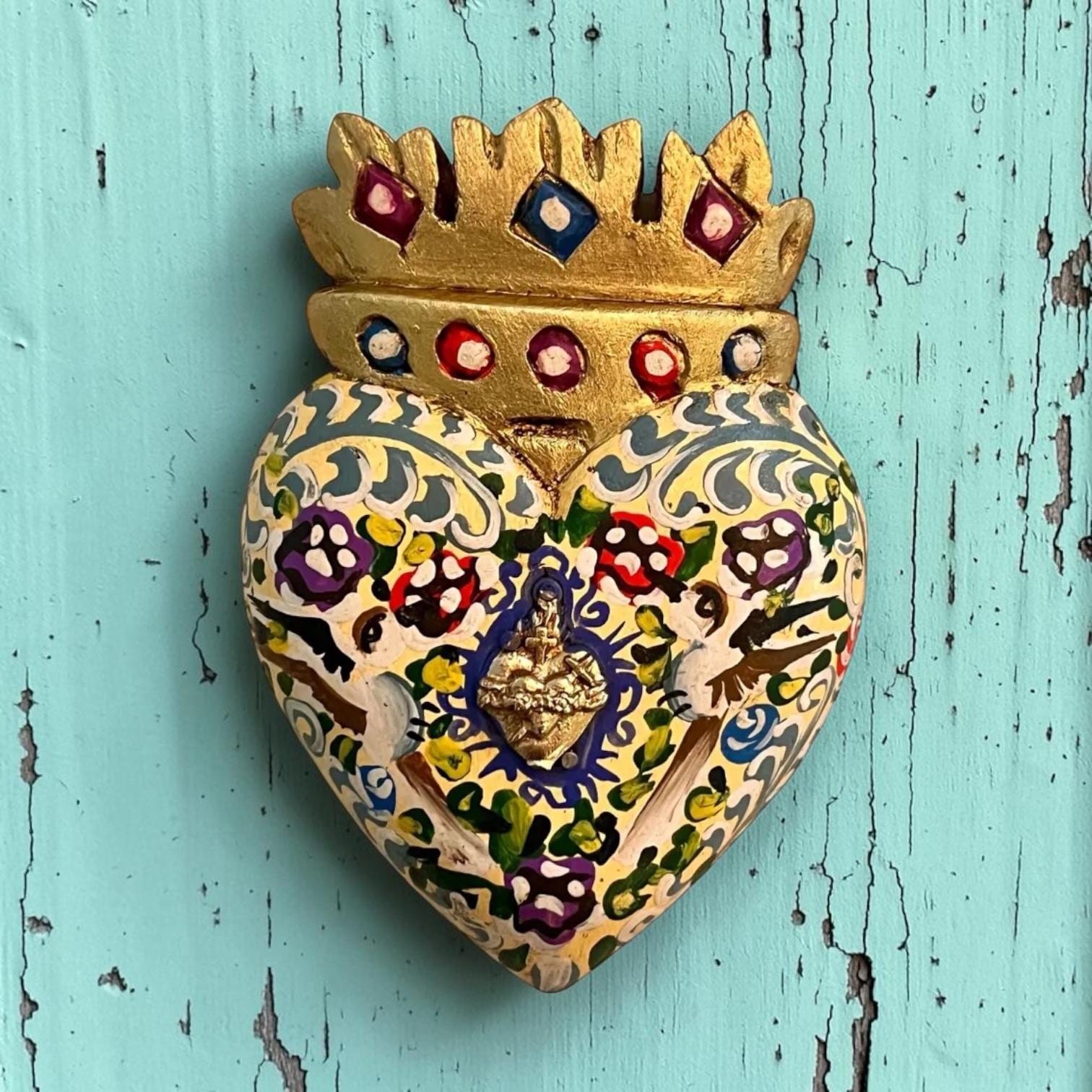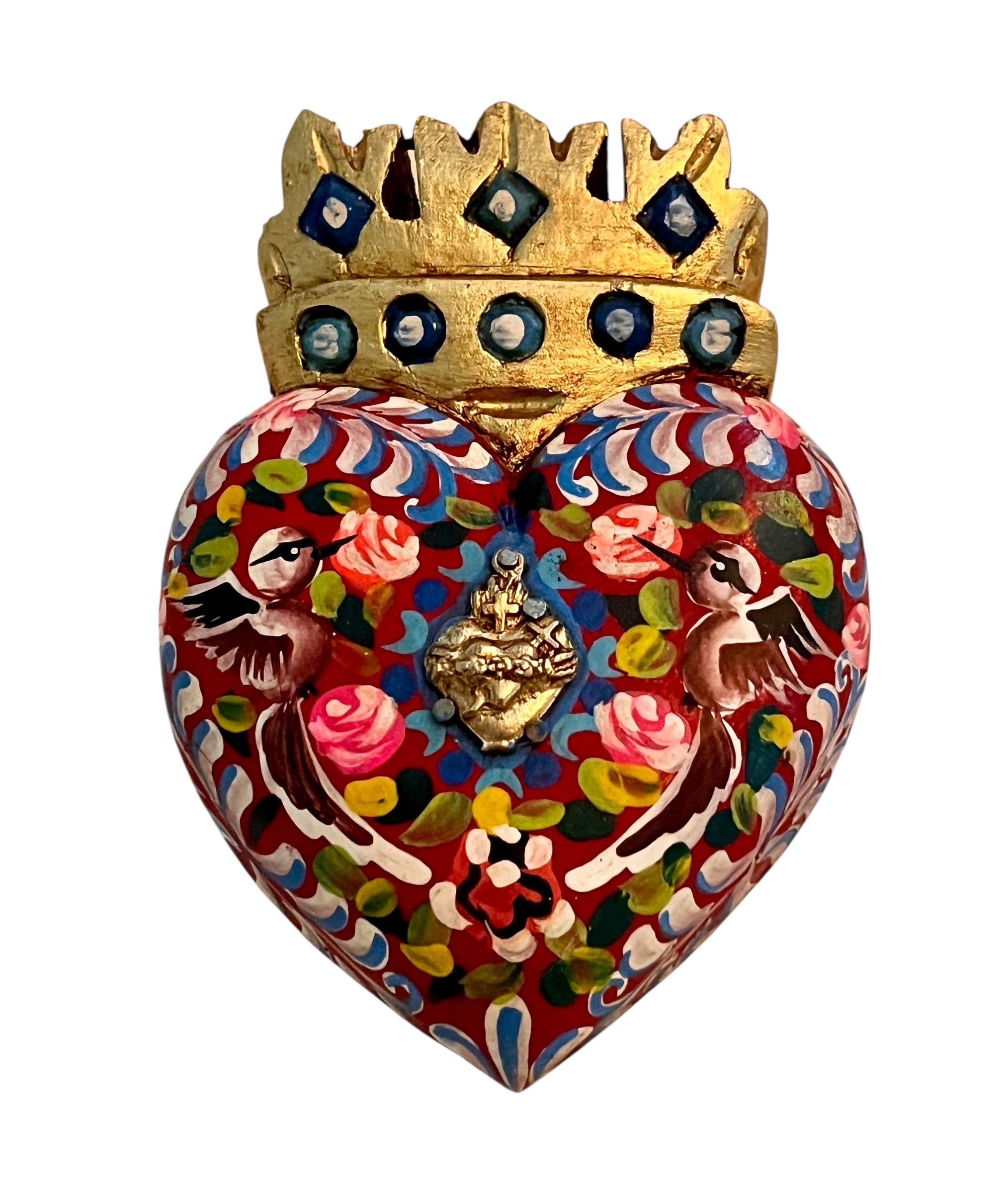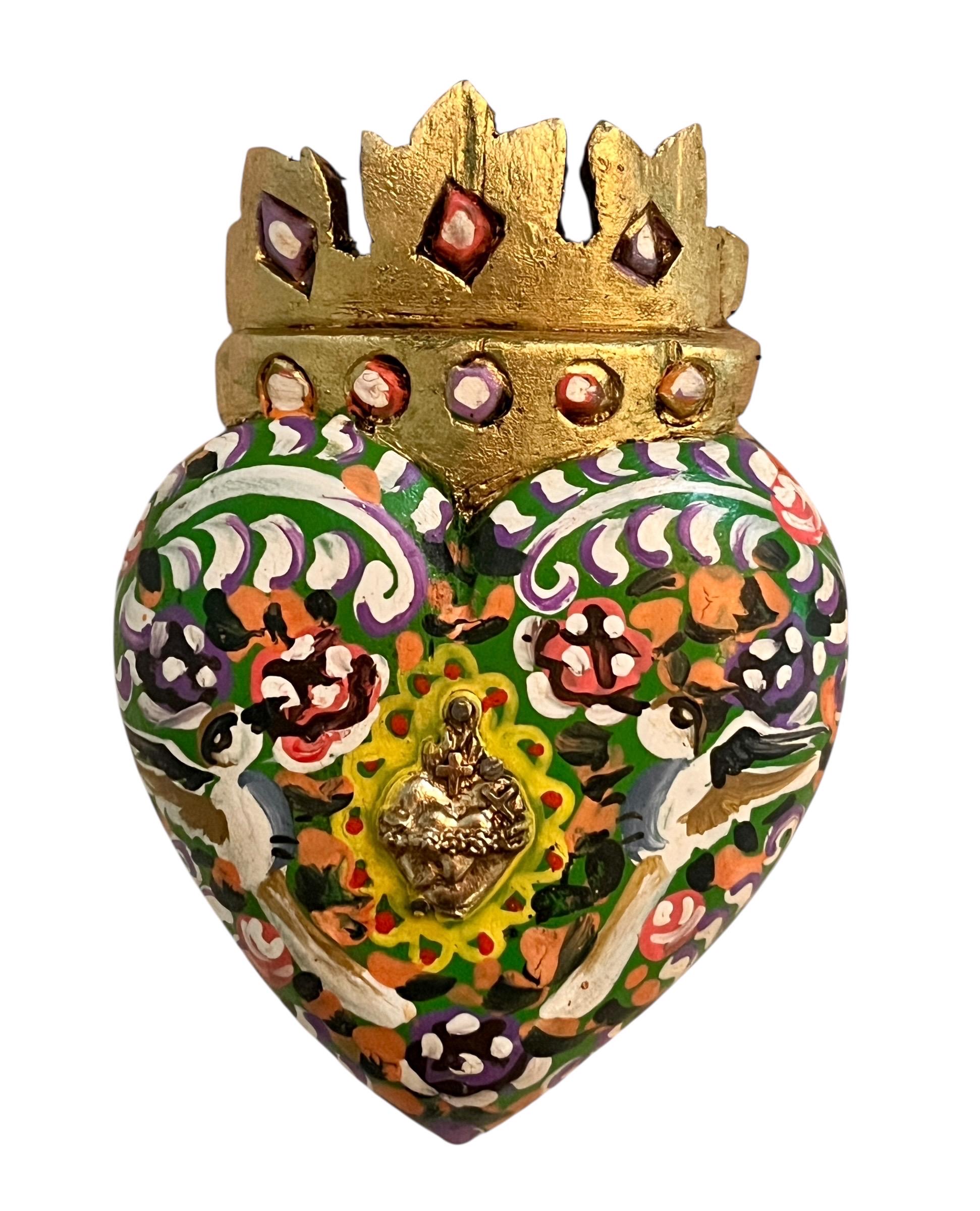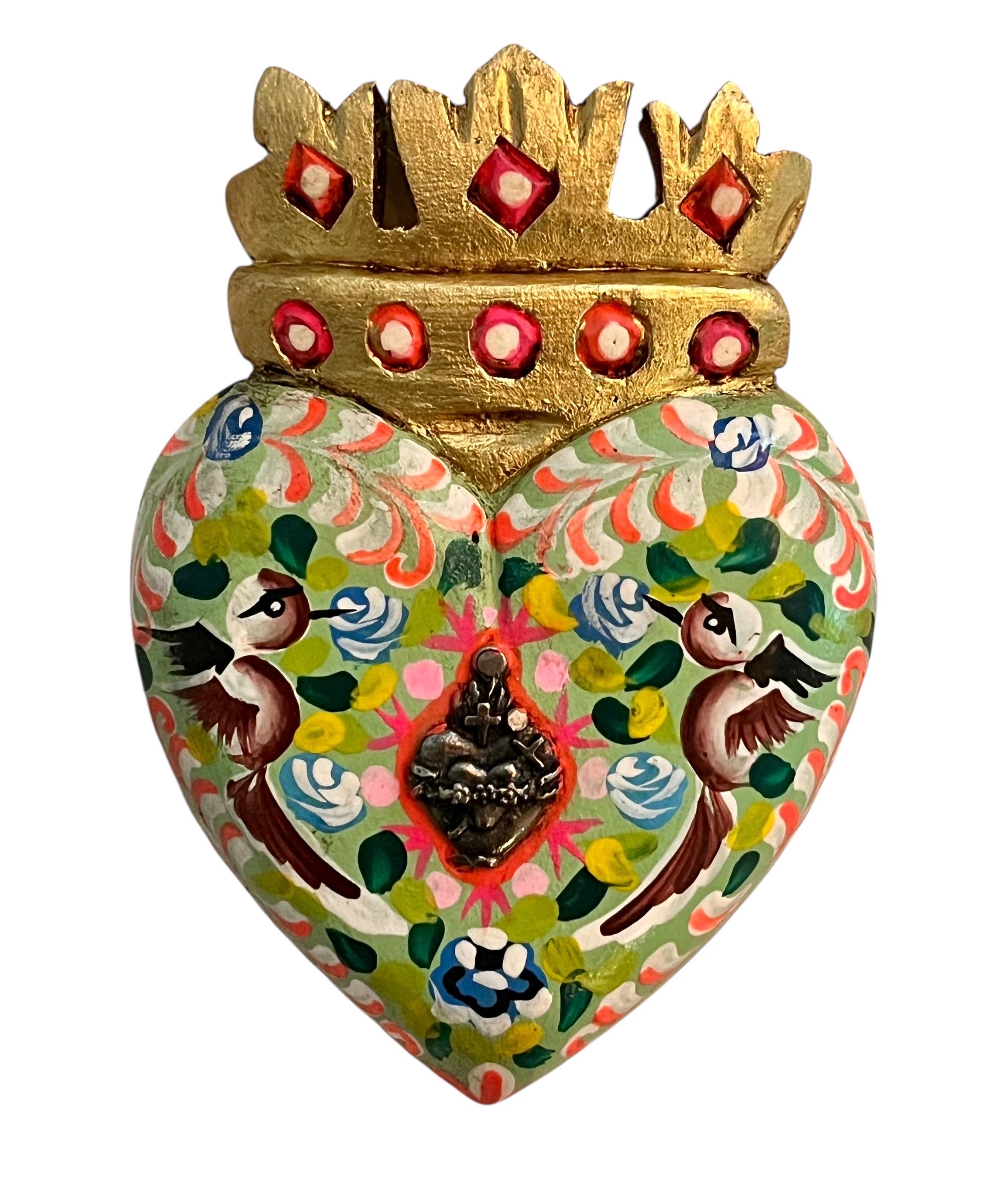 Small wood heart with Crown flame painted in a colorful floral design with doves and a Sacred Heart charm in the center.