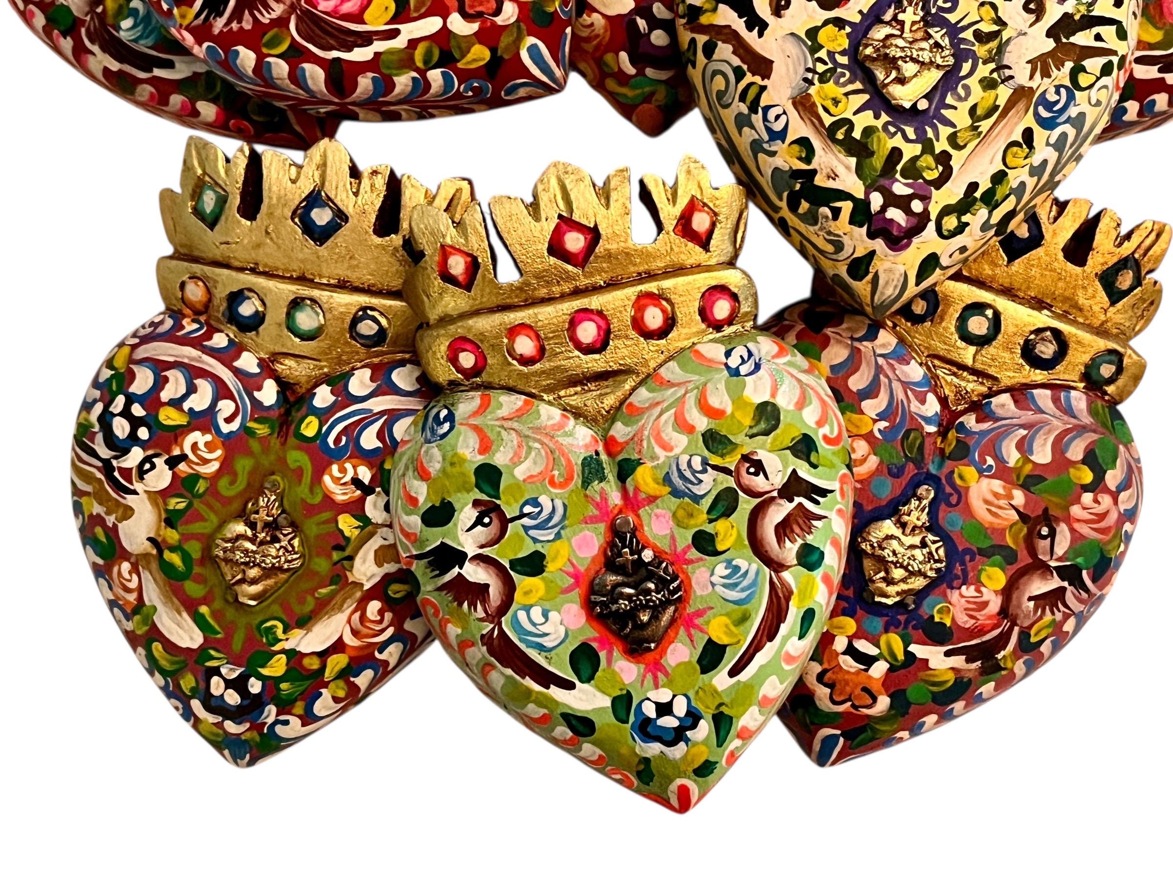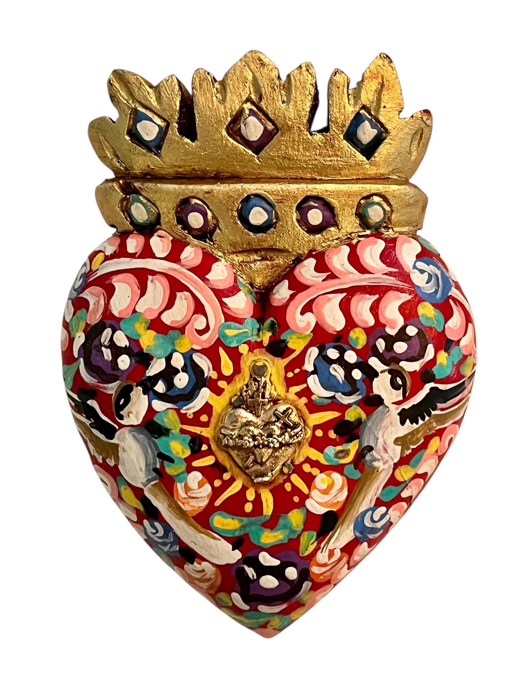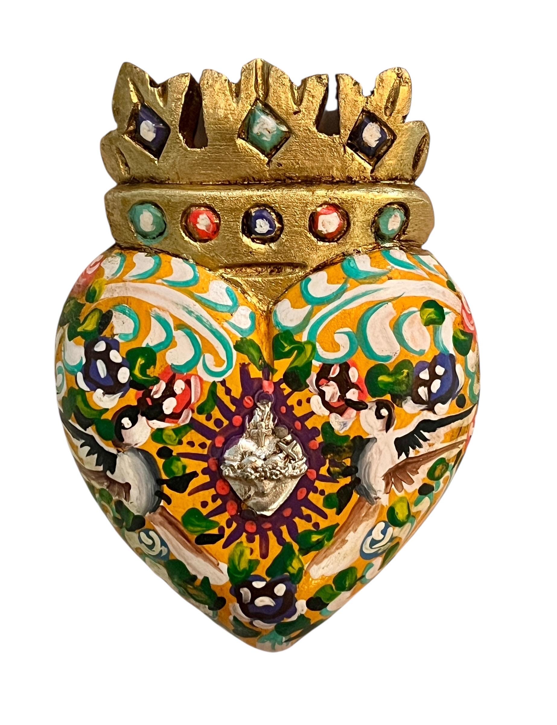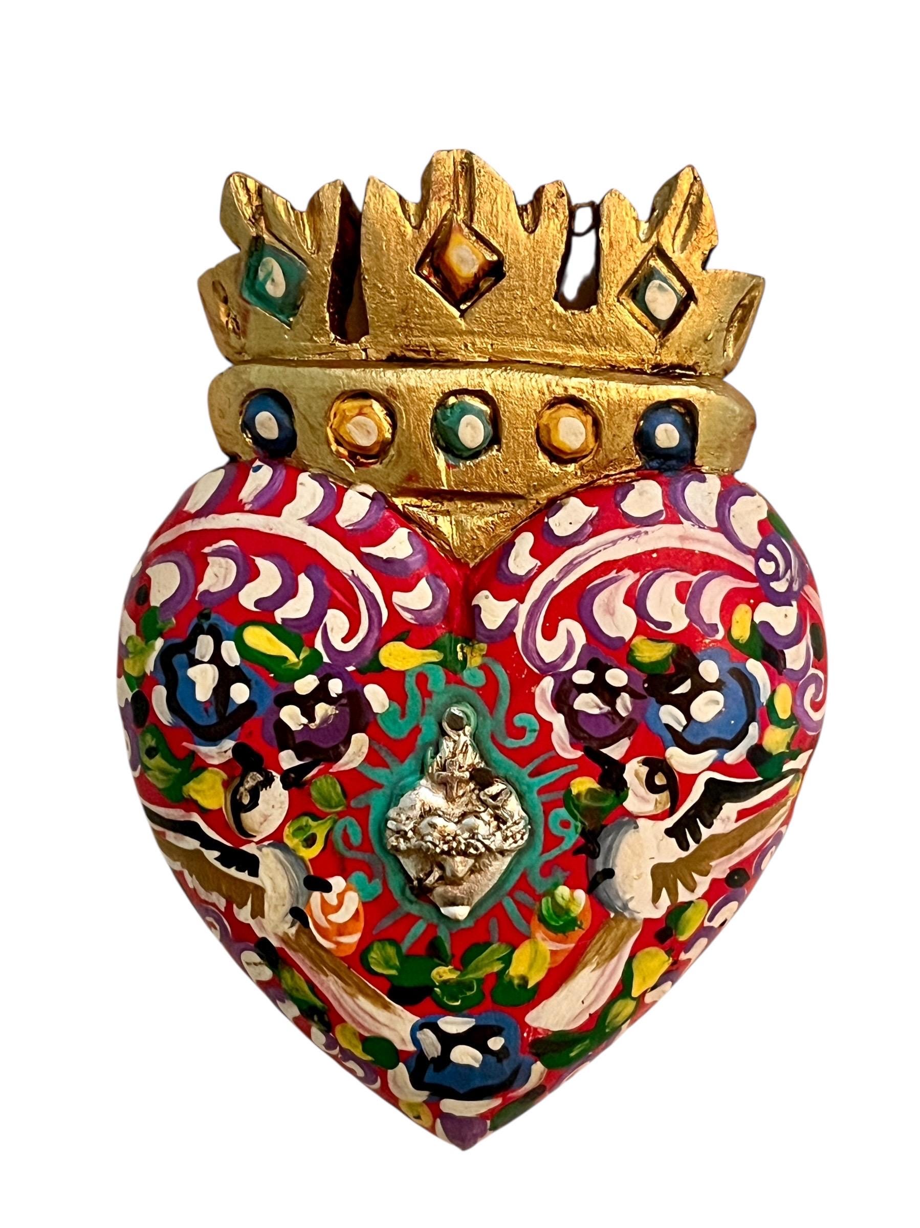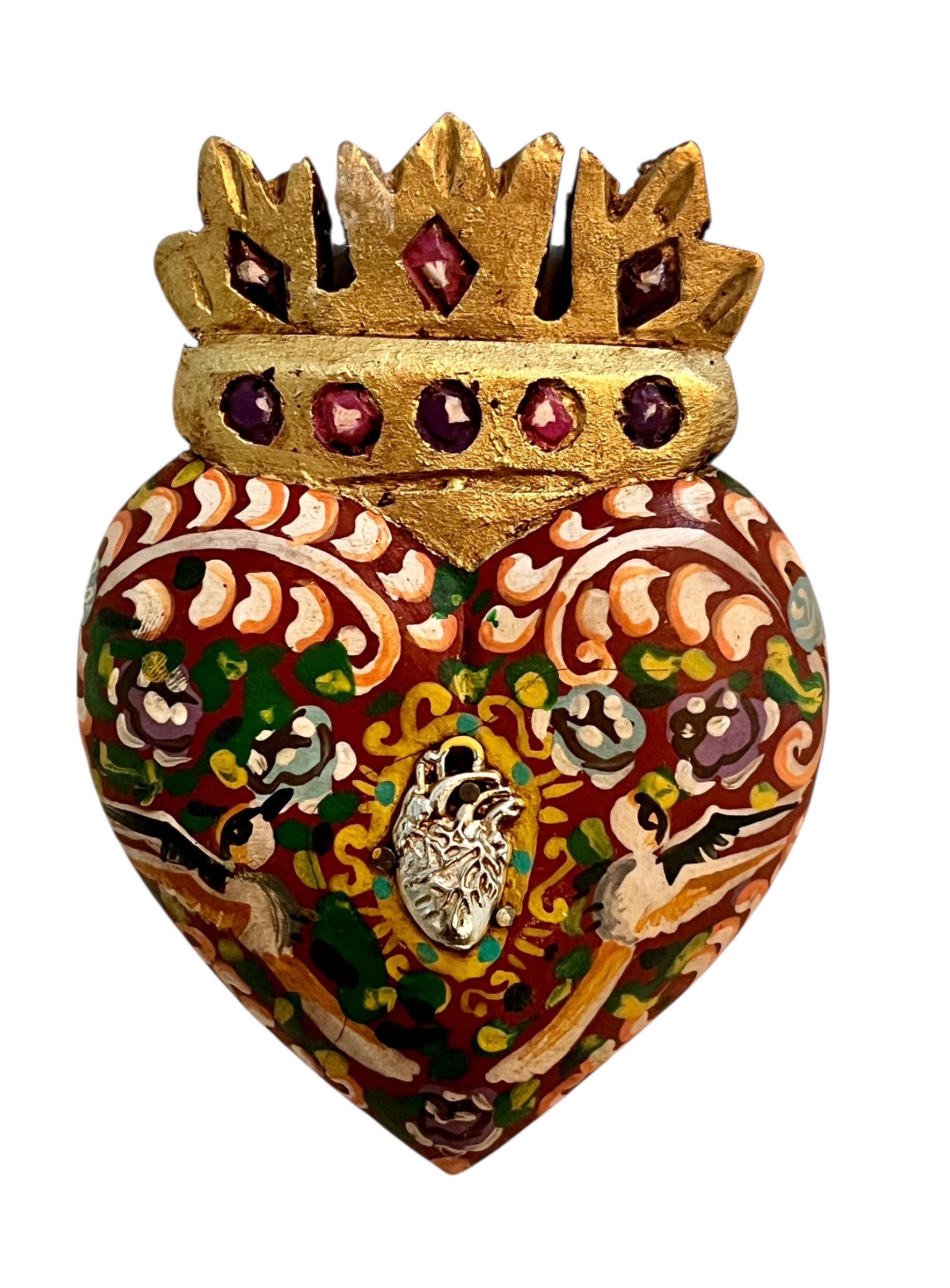 Small wood heart with Crown flame painted in a colorful floral design with doves and a Sacred Heart charm in the center.