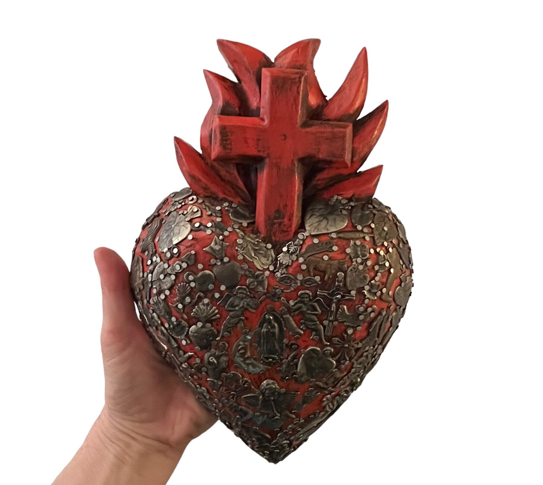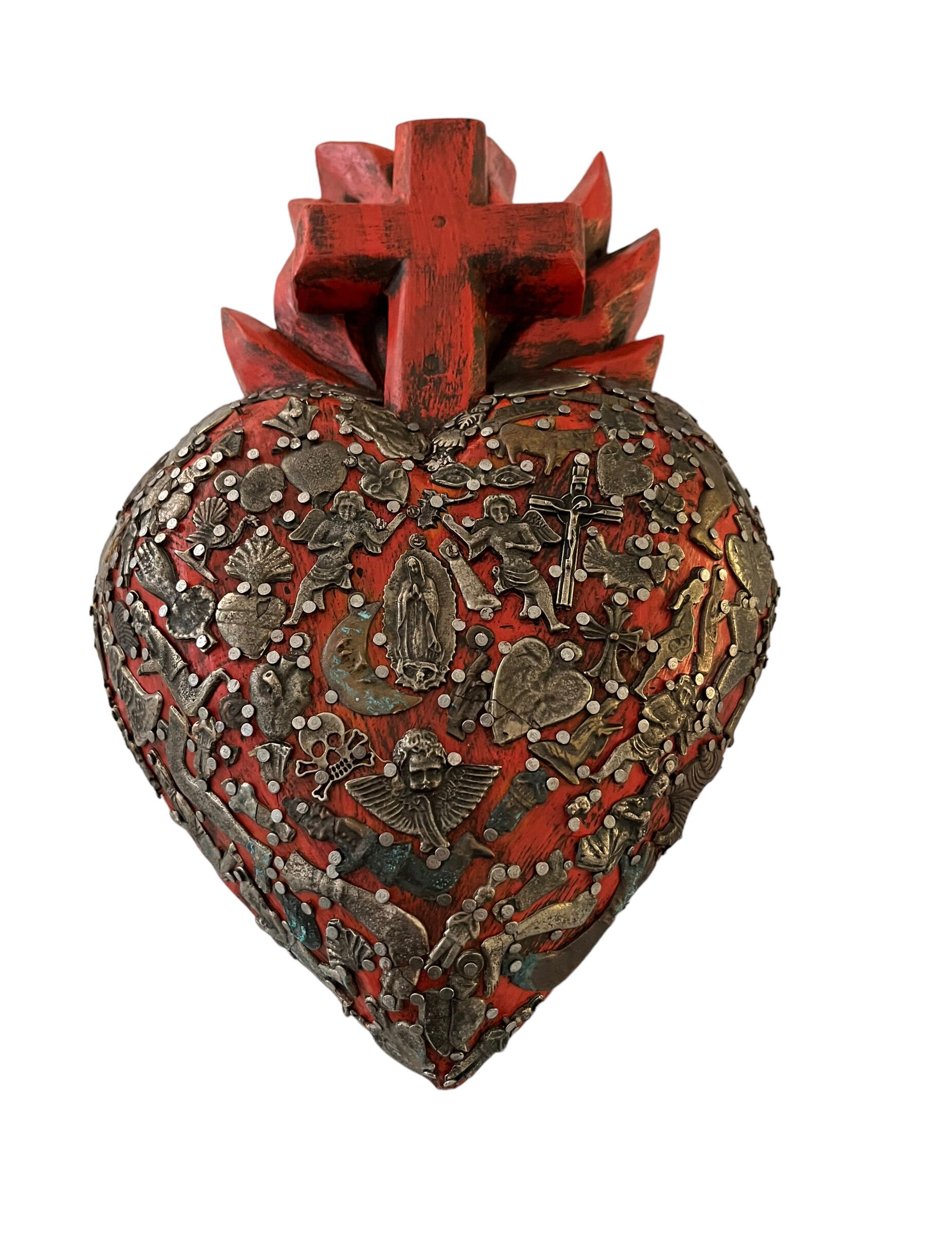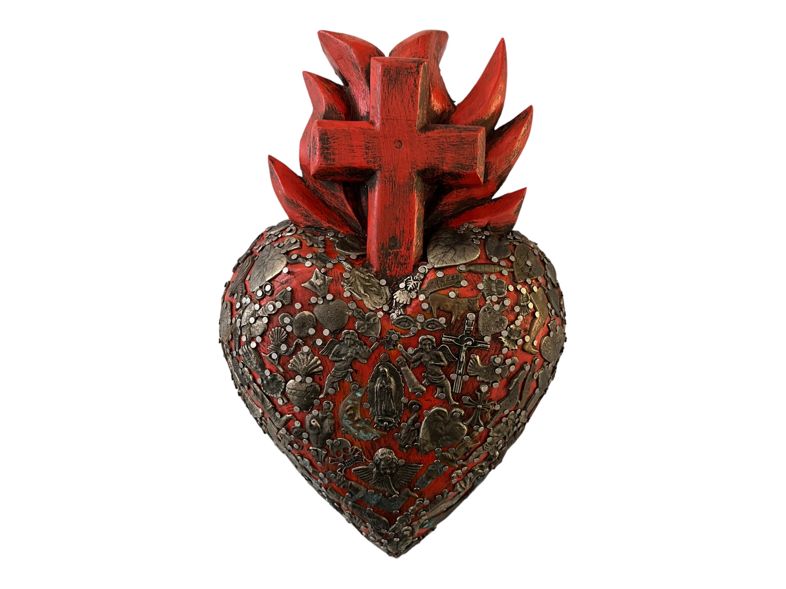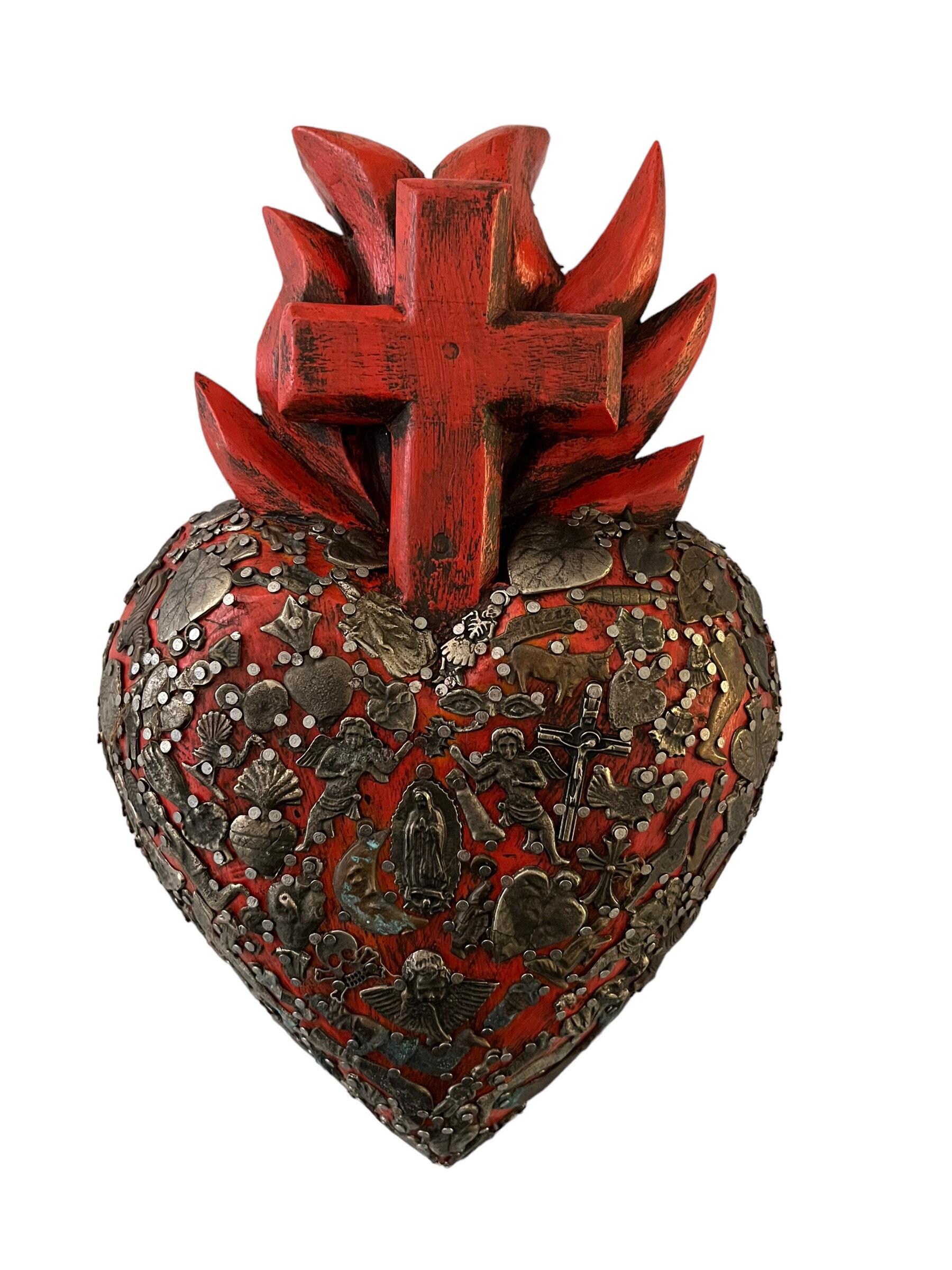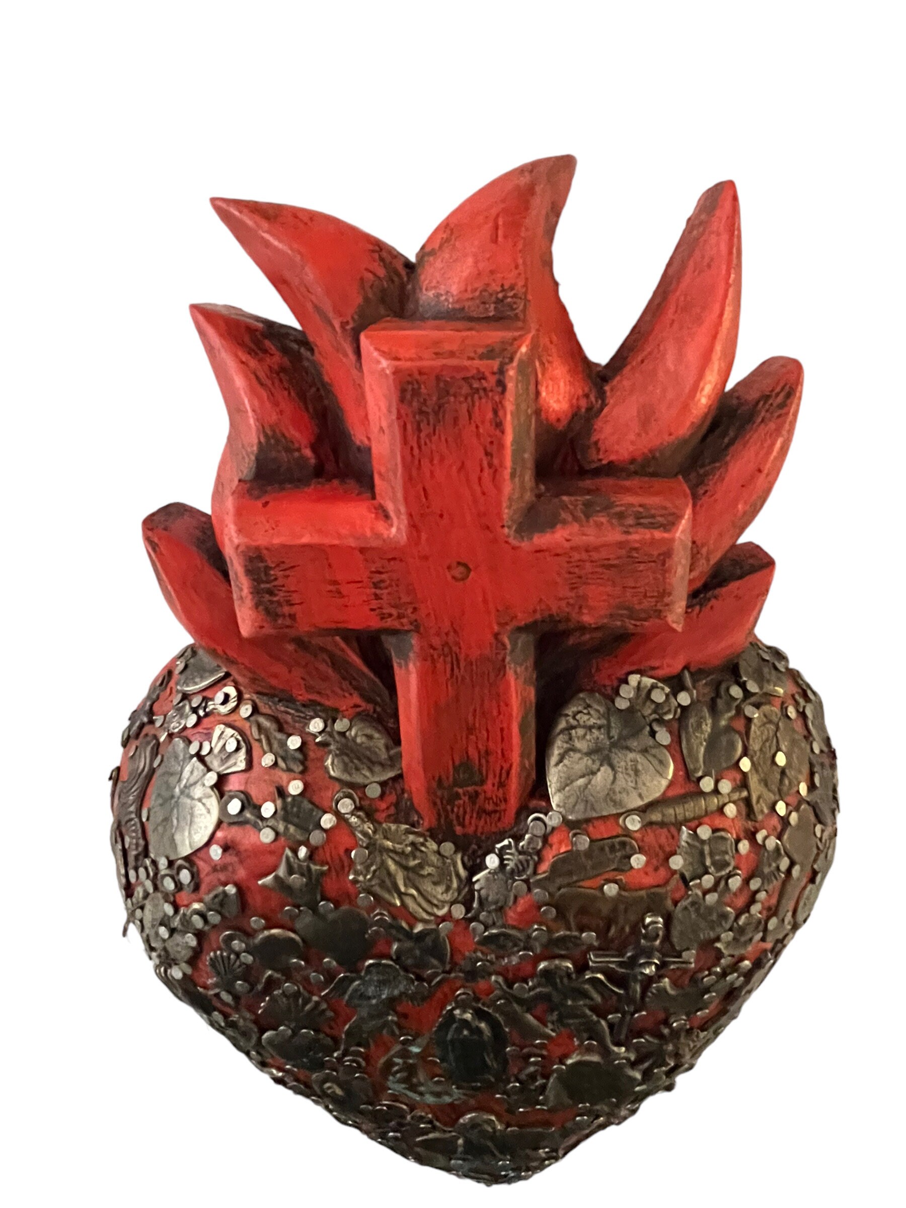 Beautiful wood heart with carved flames and Cross.