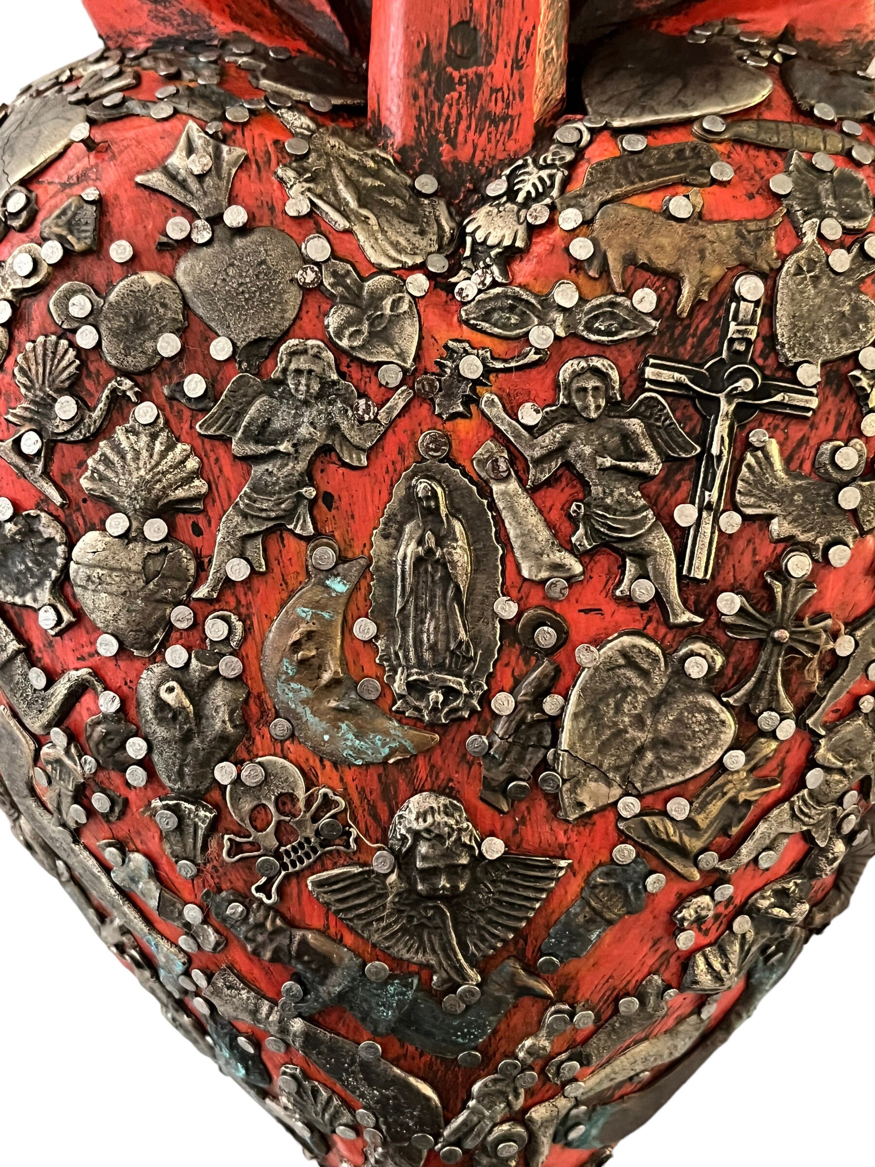 Heart is painted orange with red tones and adorned with dark toned charms.