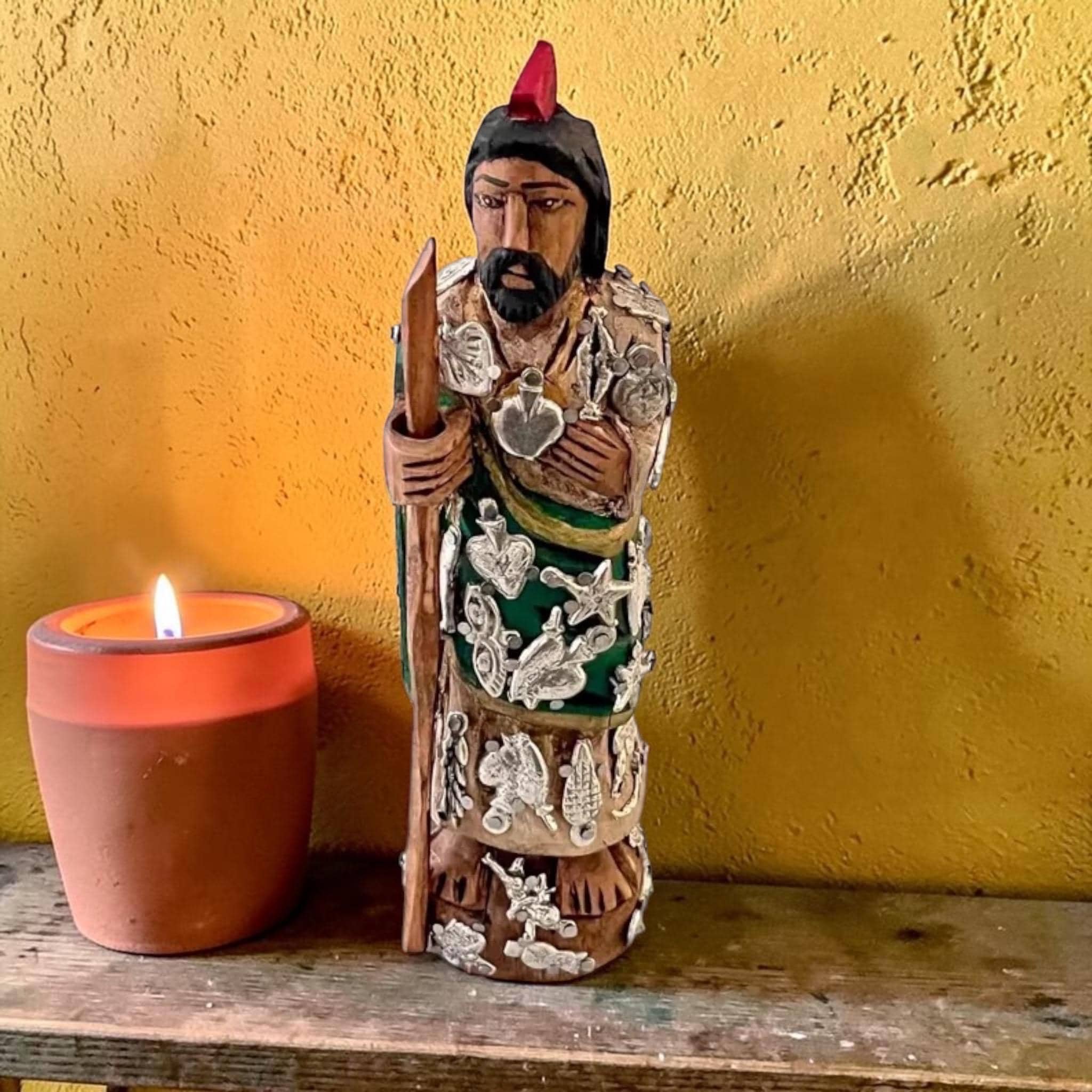 Figurine is carved from wood and is adorned with Milagro charms.