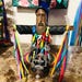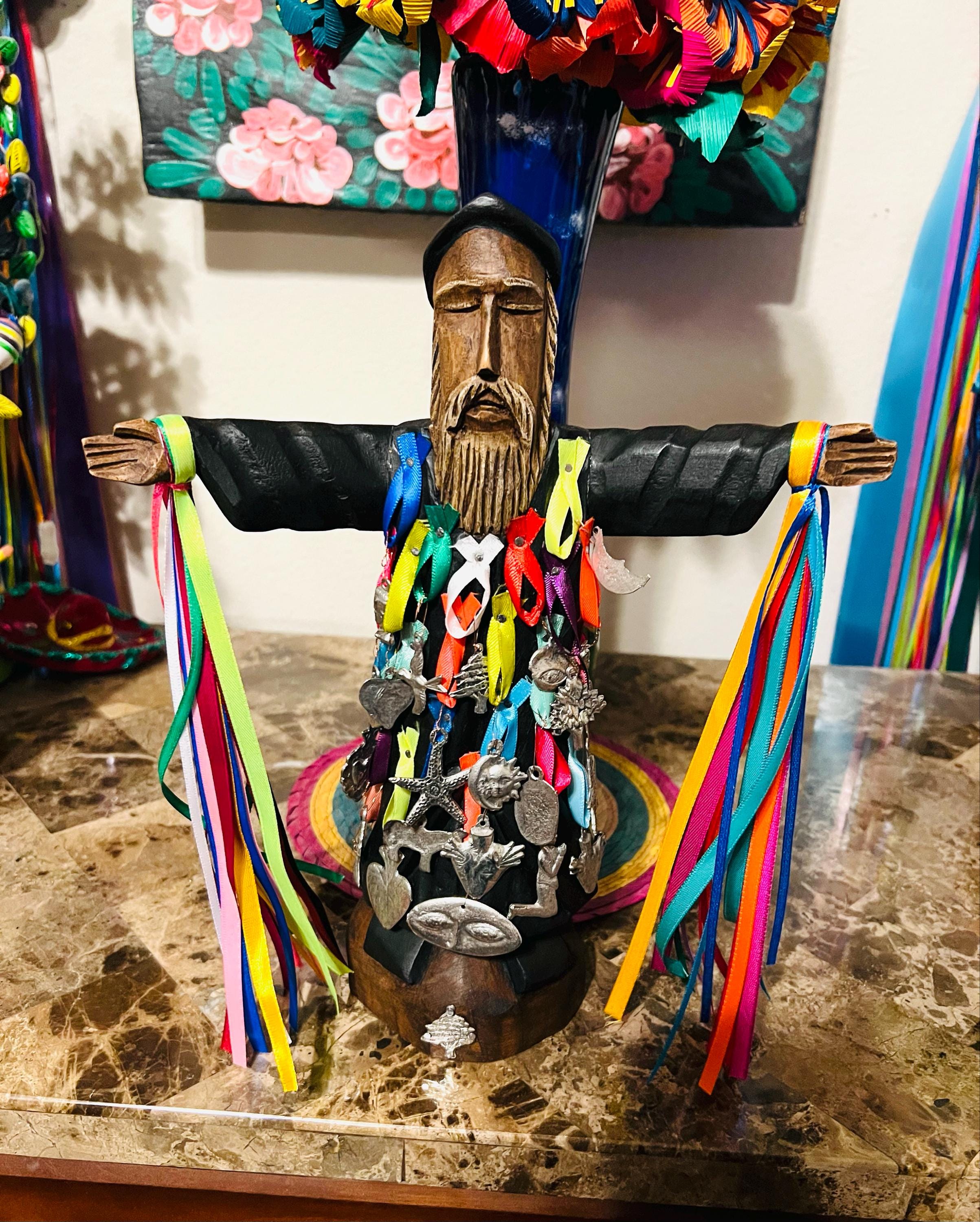 Figurine is carved from wood and is adorned with ribbons and Milagro charms.