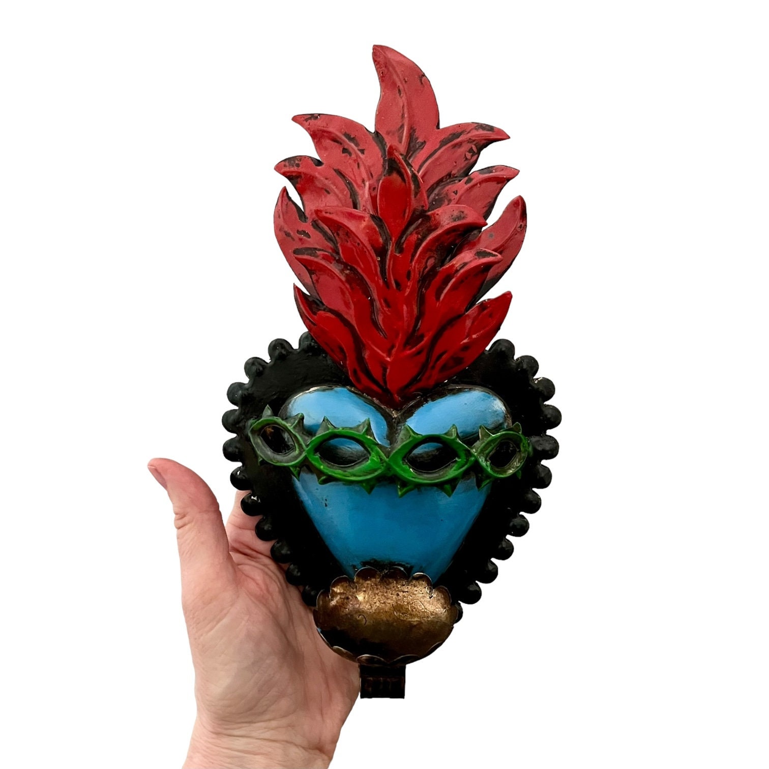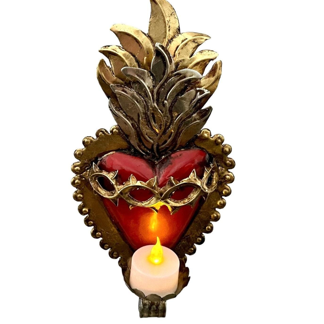 A band of thorns extends out from the heart. There is small tealight sized candle base.