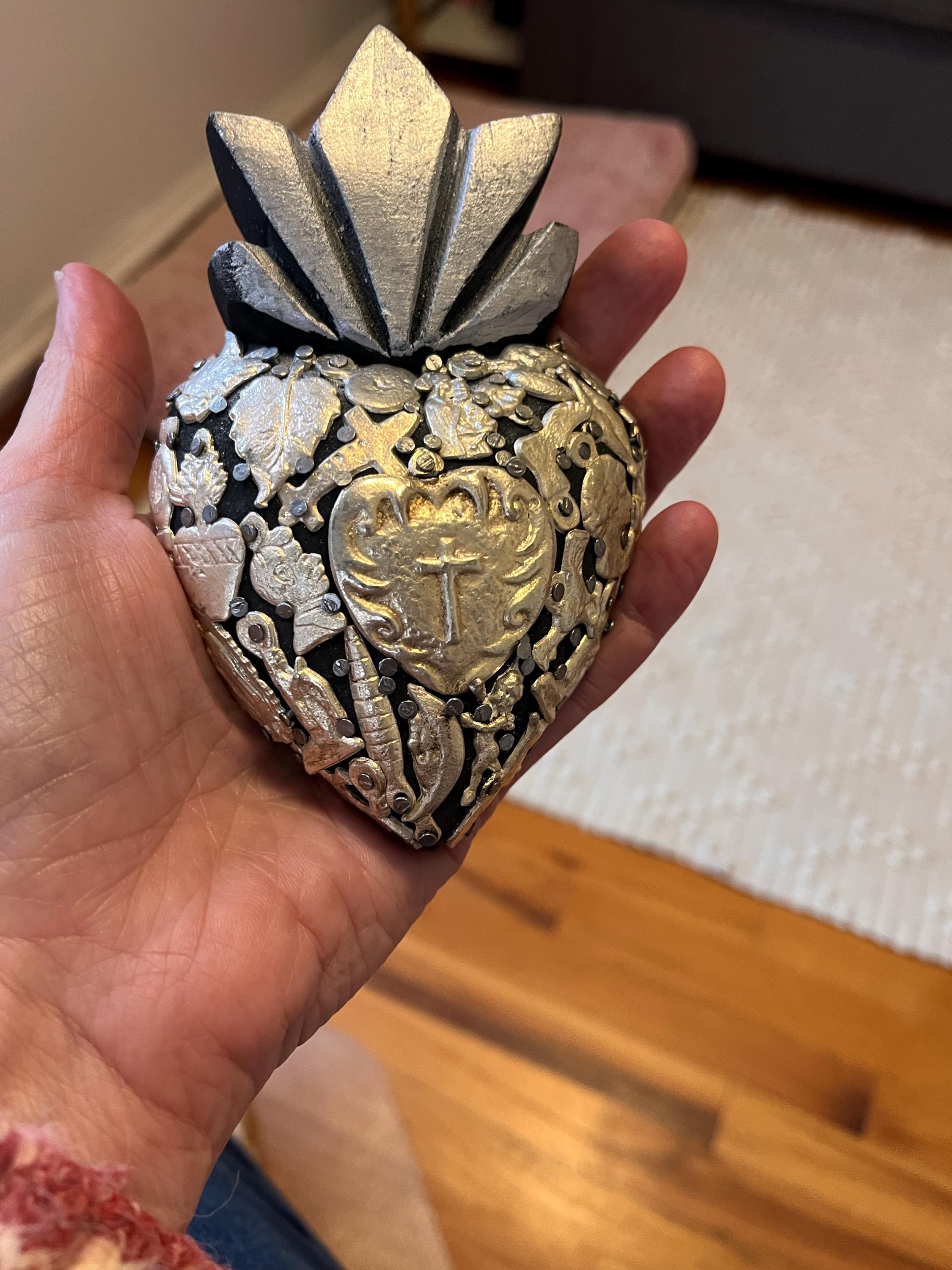 Small carved Wood heart with Milagro charms.