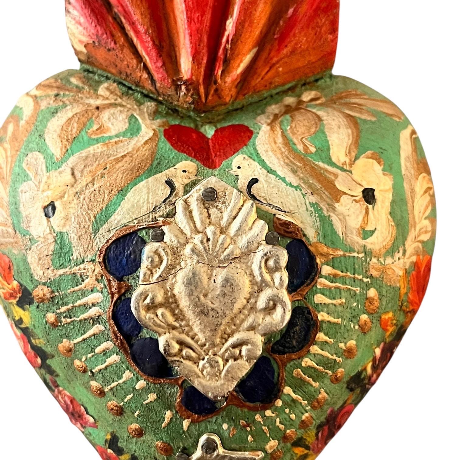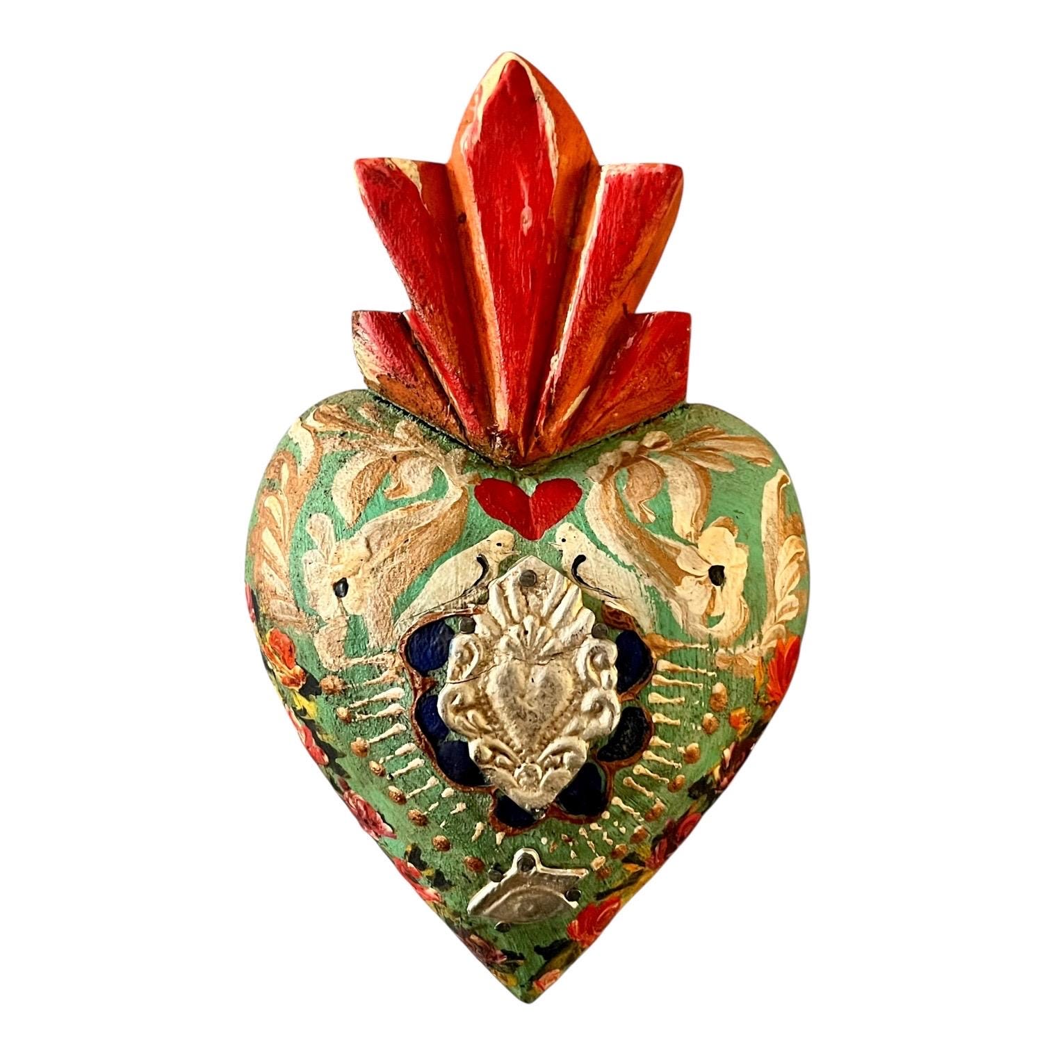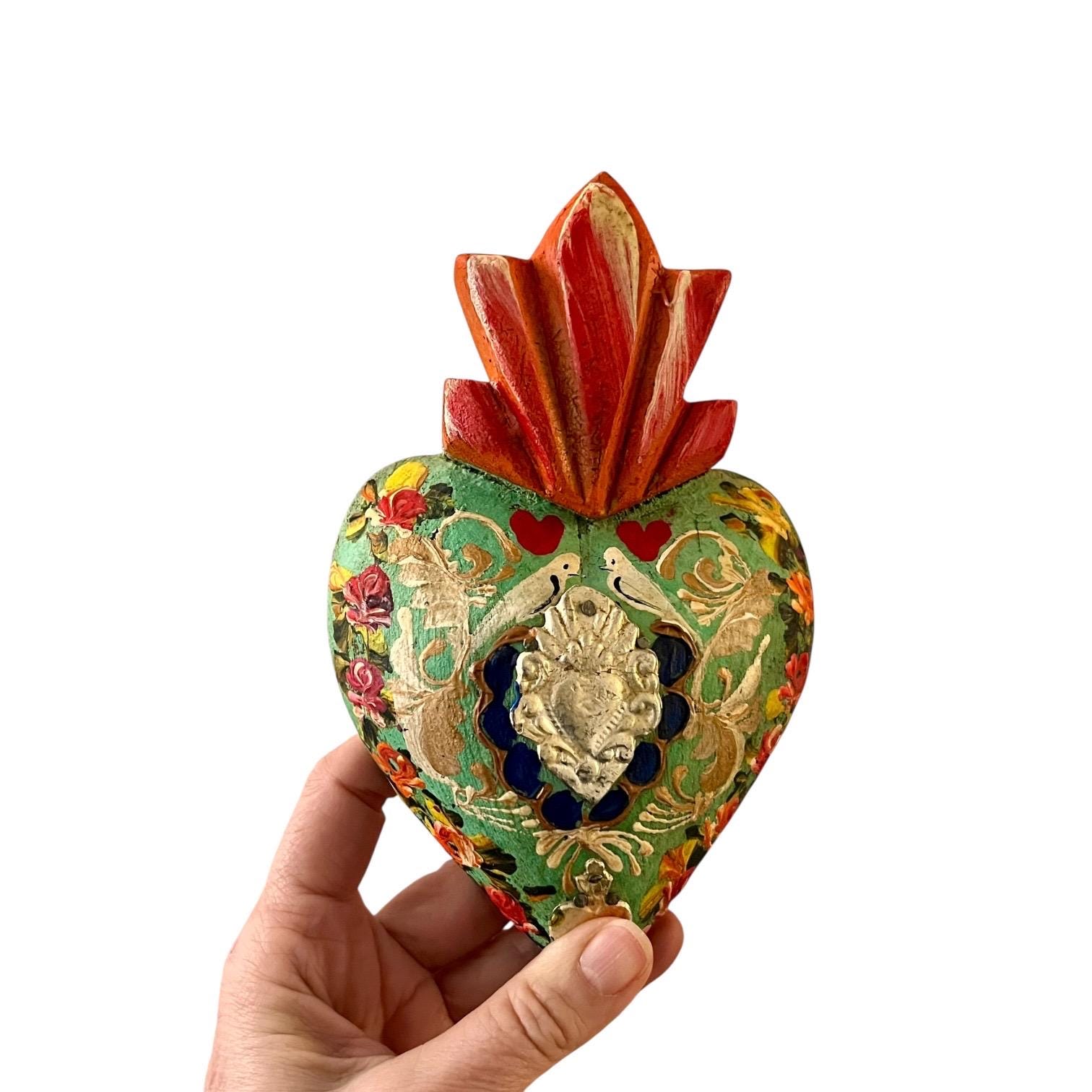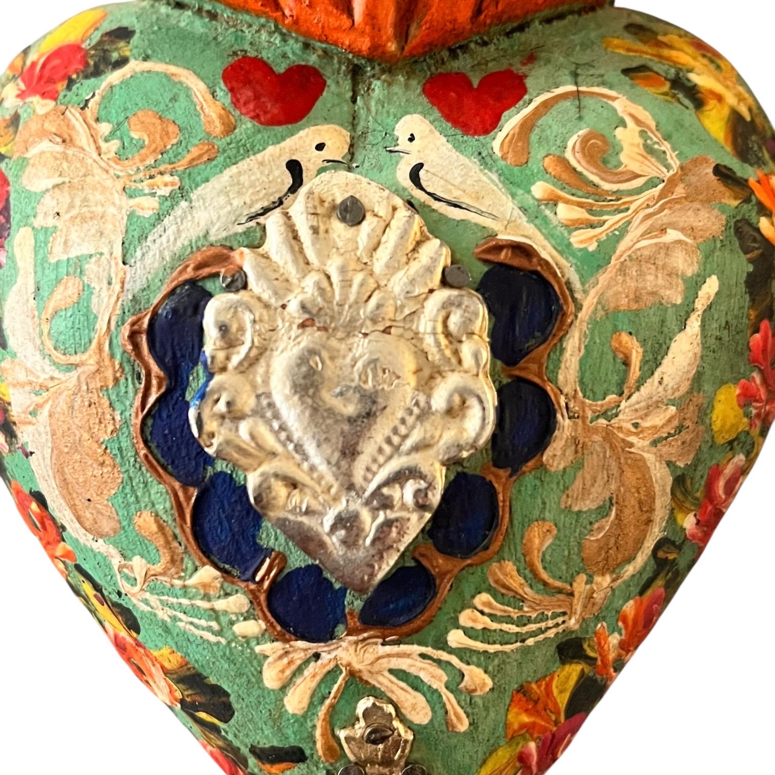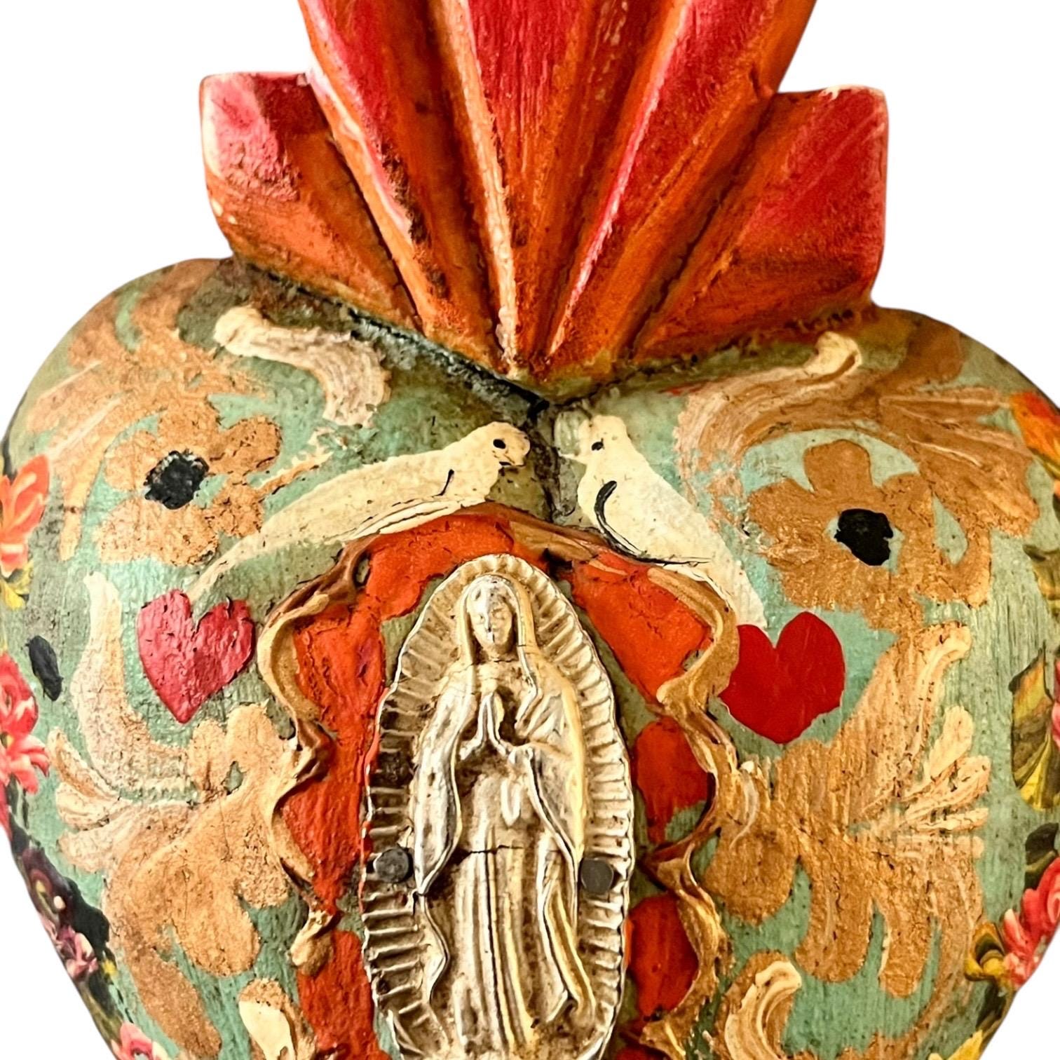 Charming painted heart - center has a Virgin Guadalupe or Sacred Heart Milagro framed with a beautiful floral design with doves.