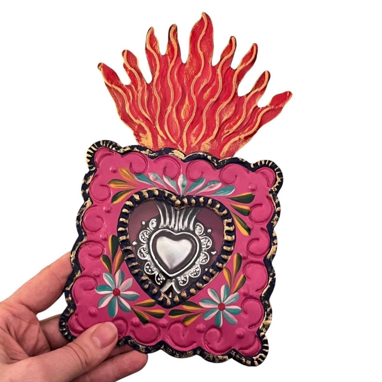 SACRED HEART Nicho, Mexican Tin Milagro Heart Frame, Sagrado Corazon, Pink