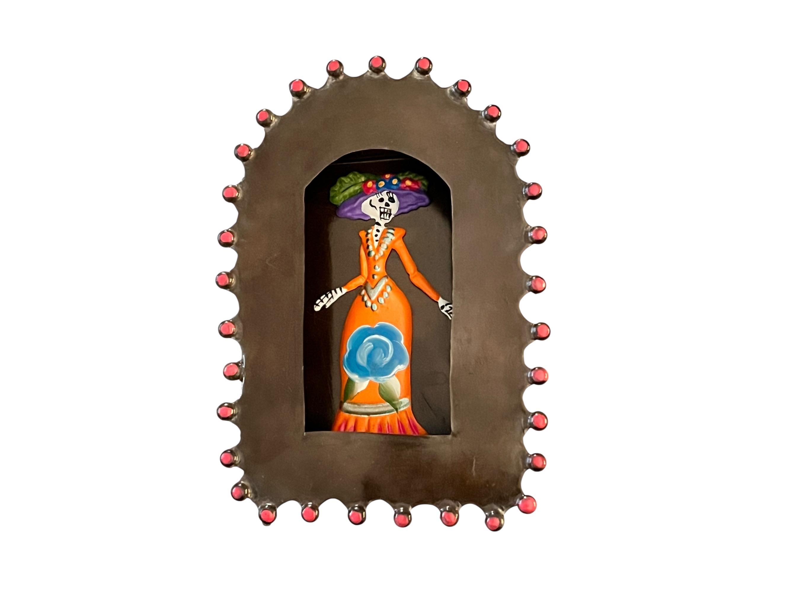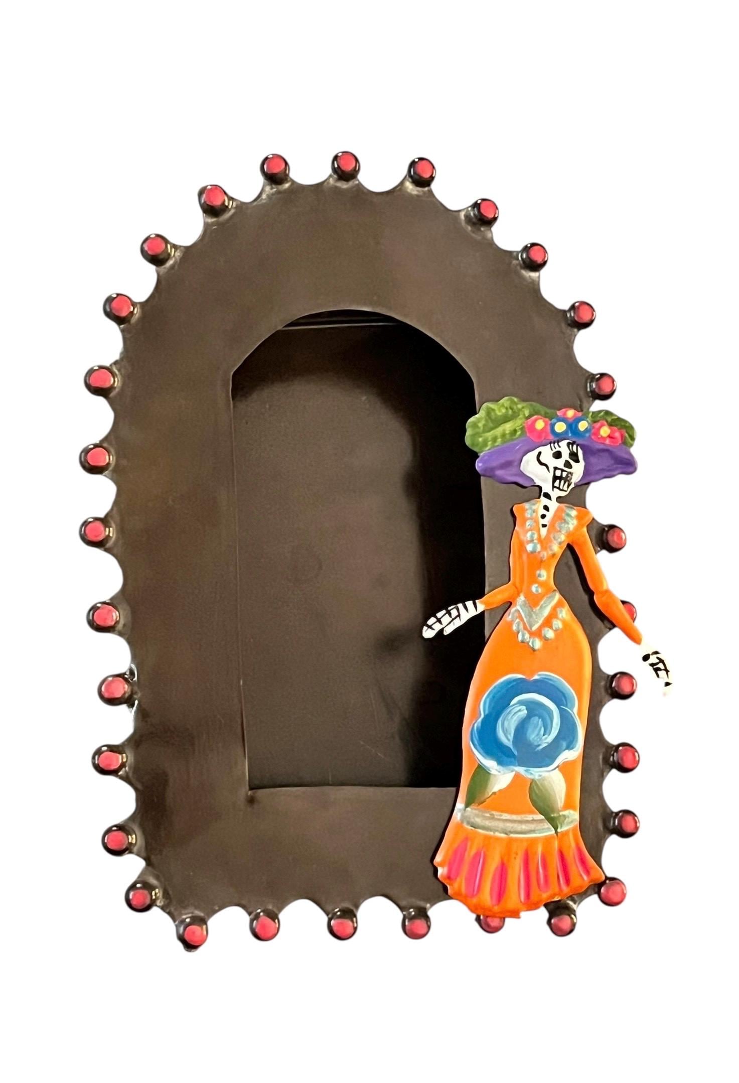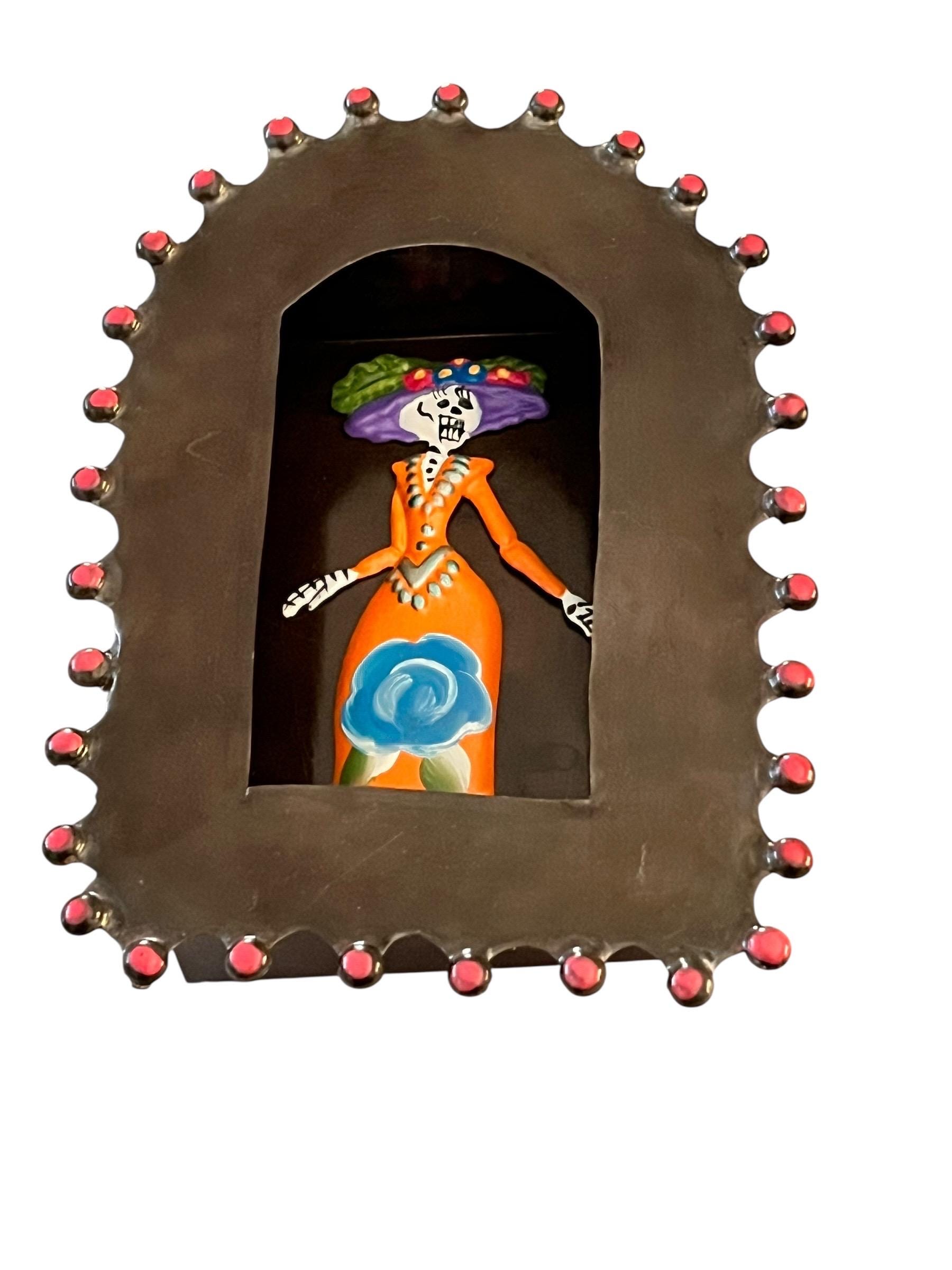 The Nicho has a hinged door - The door DOES NOT have glass, frame area is open - you could add your own image or trinkets.