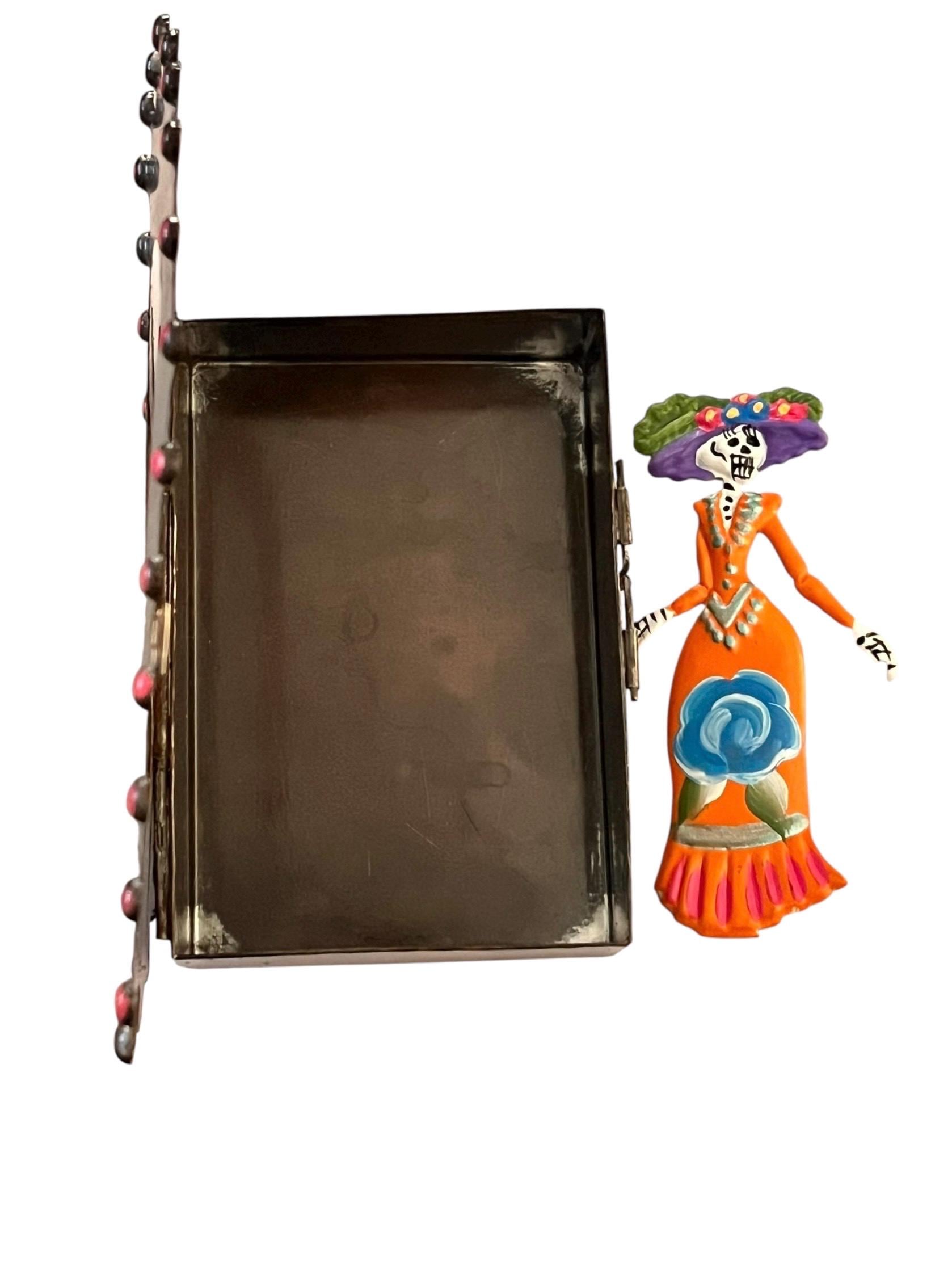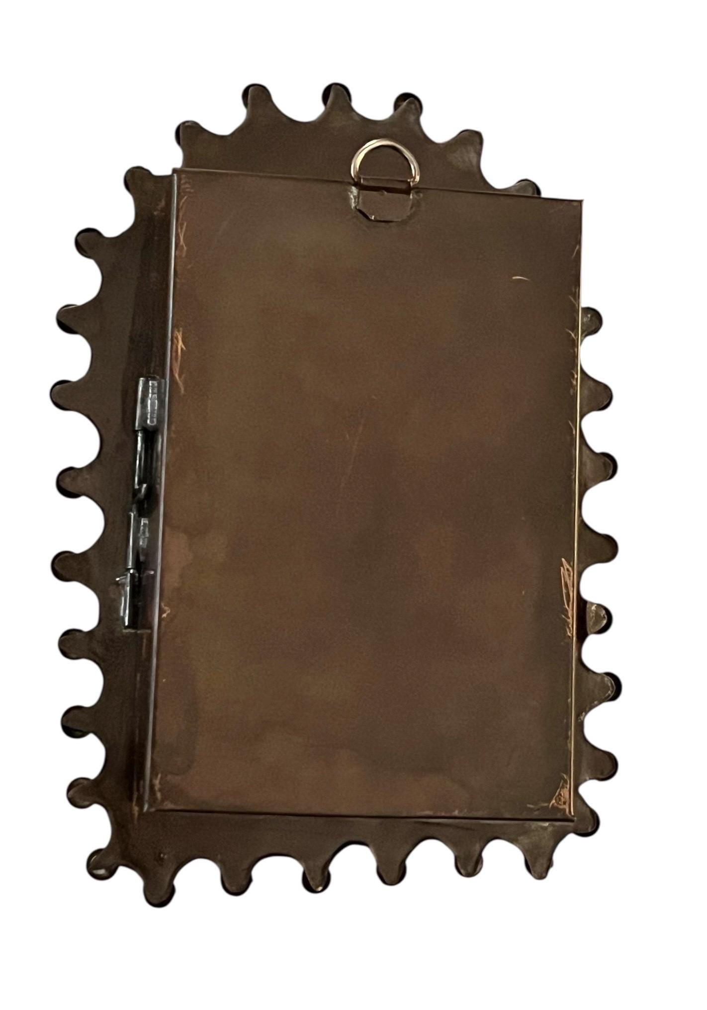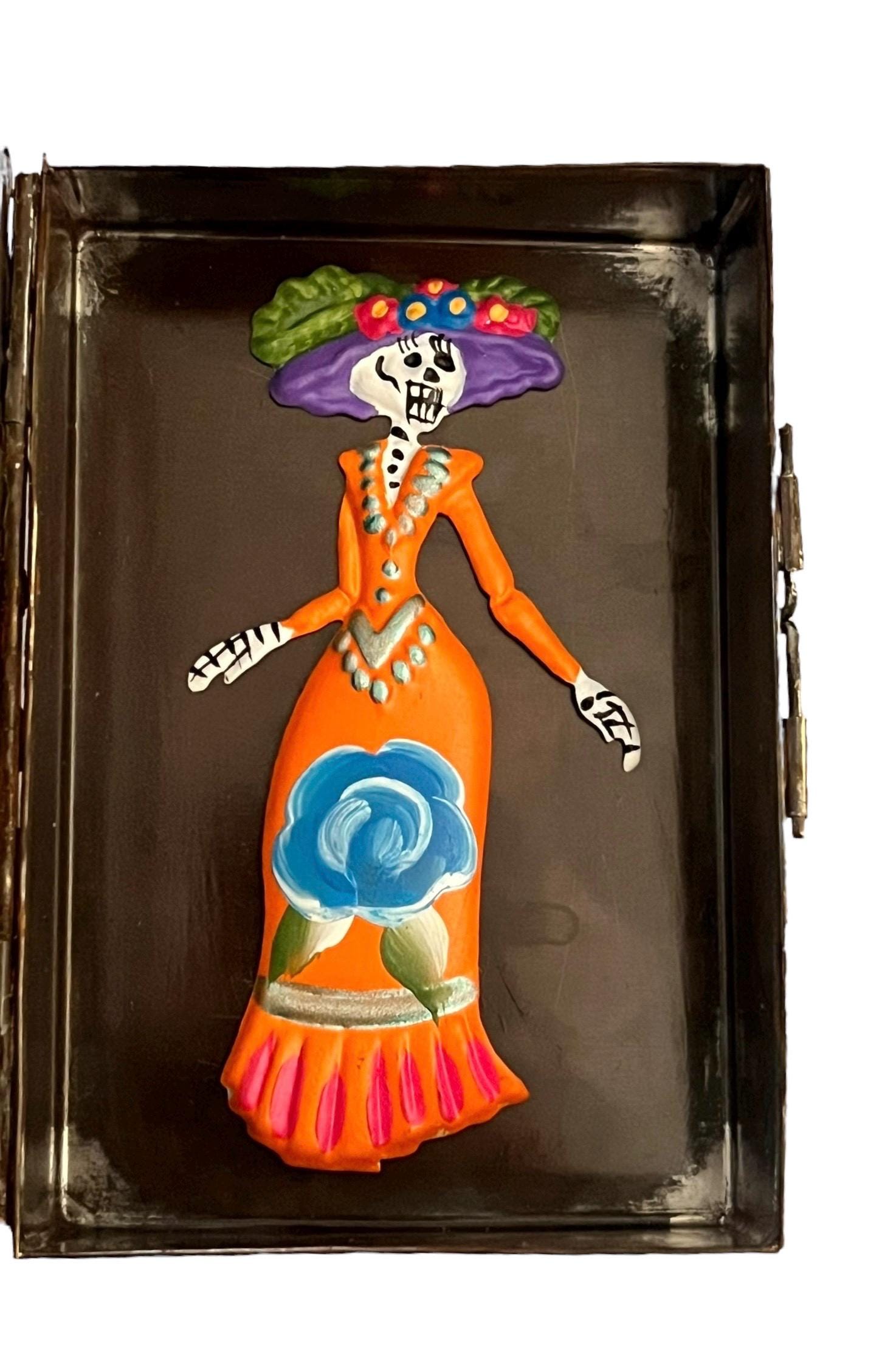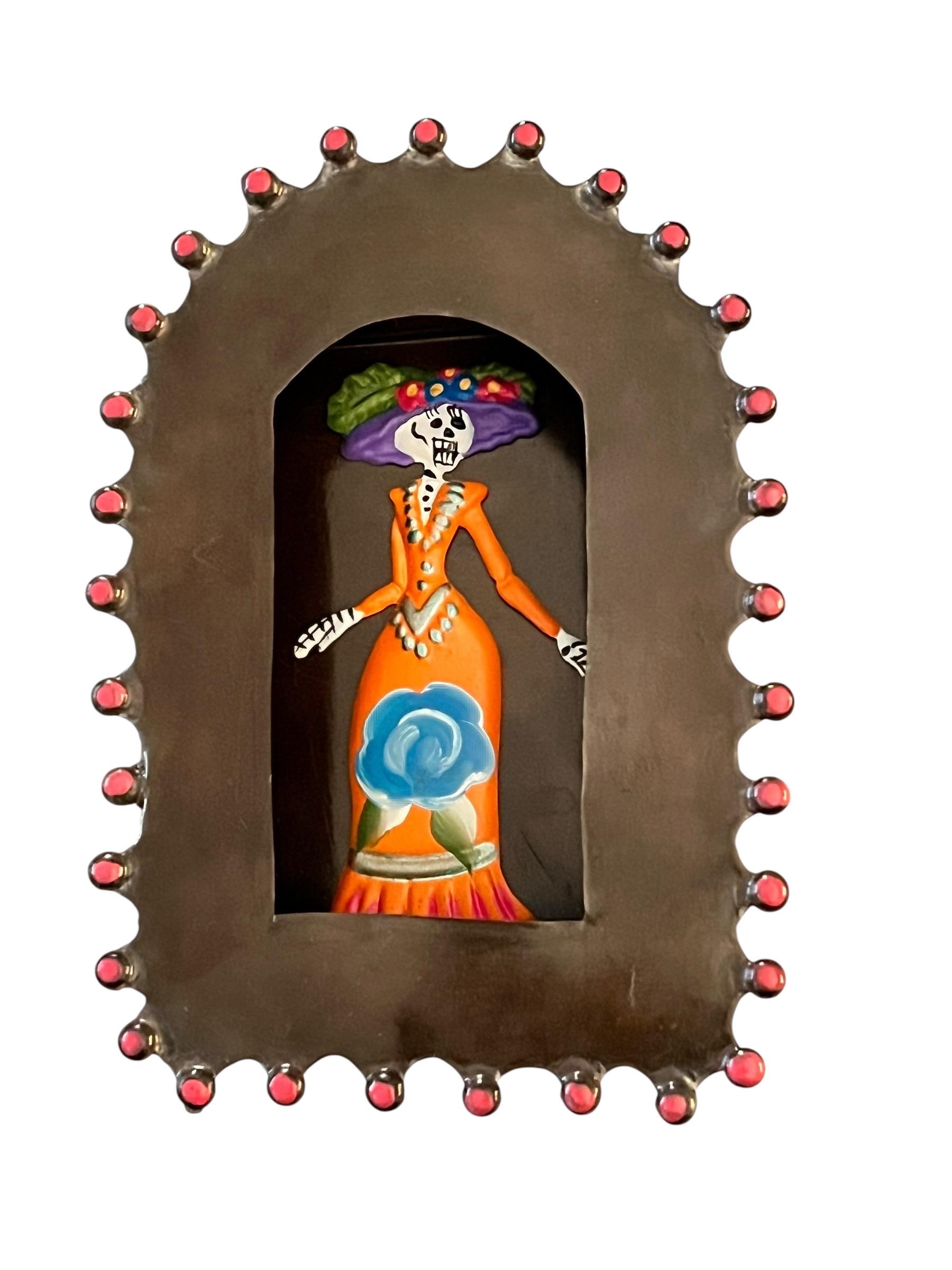 The Nicho has a hinged door - The door DOES NOT have glass, frame area is open - you could add your own image or trinkets.