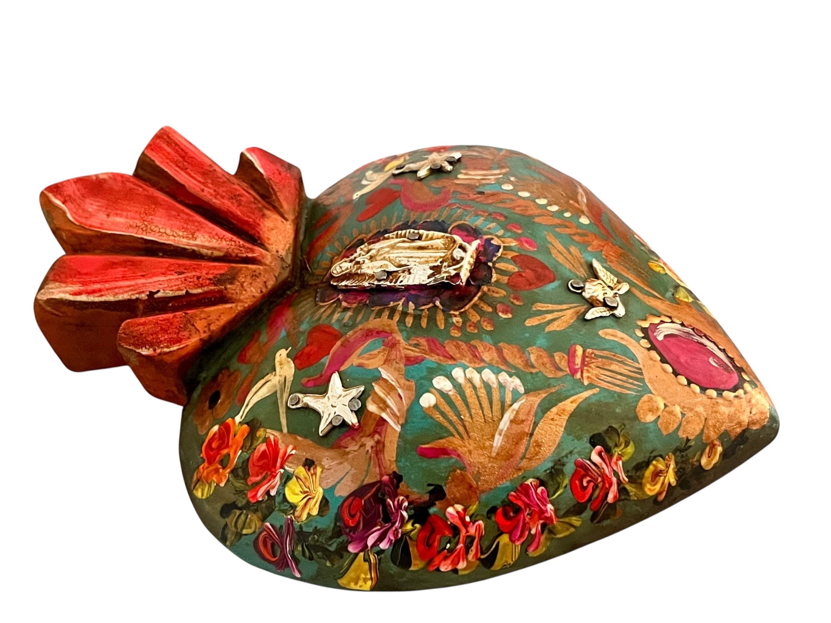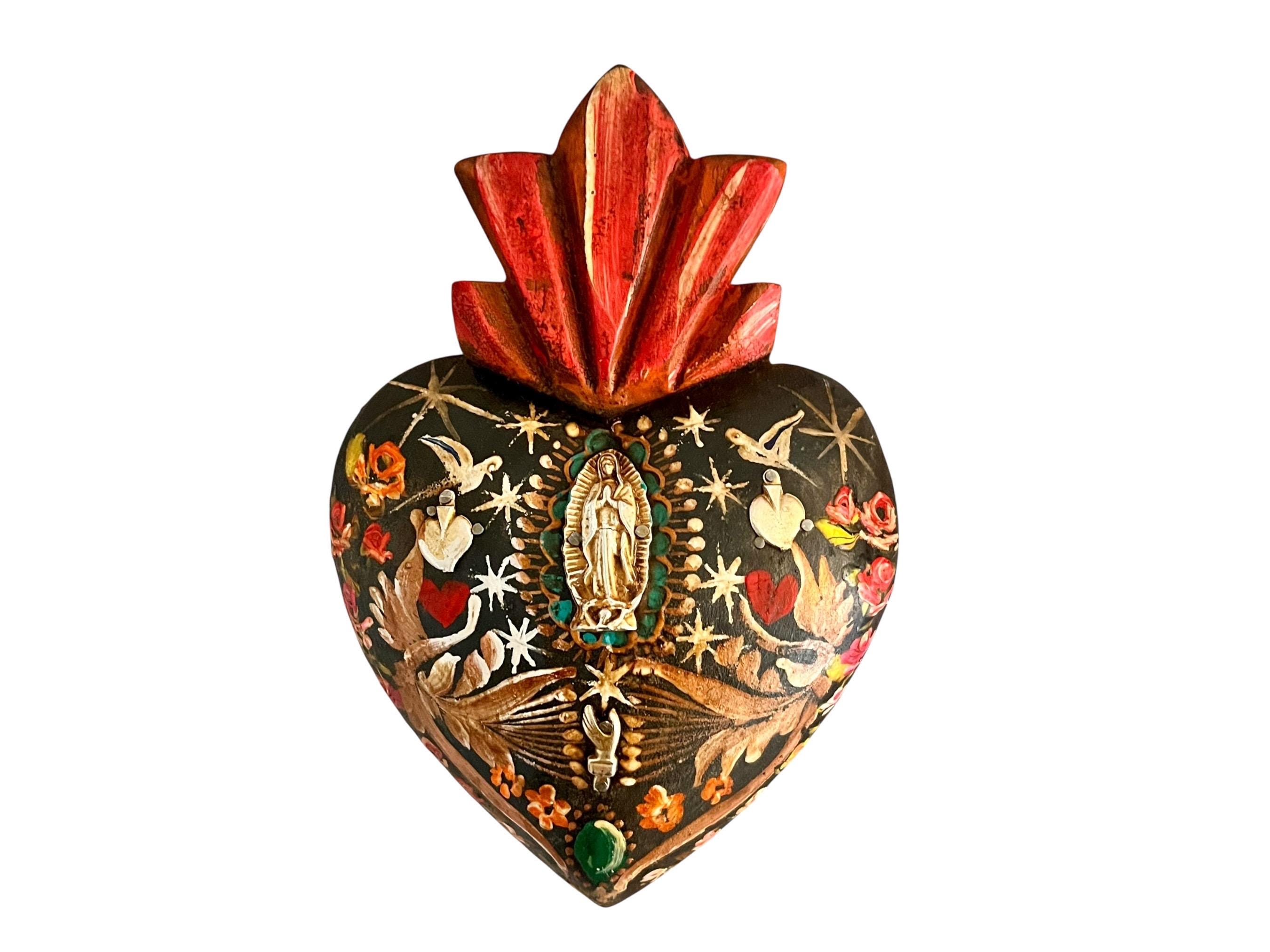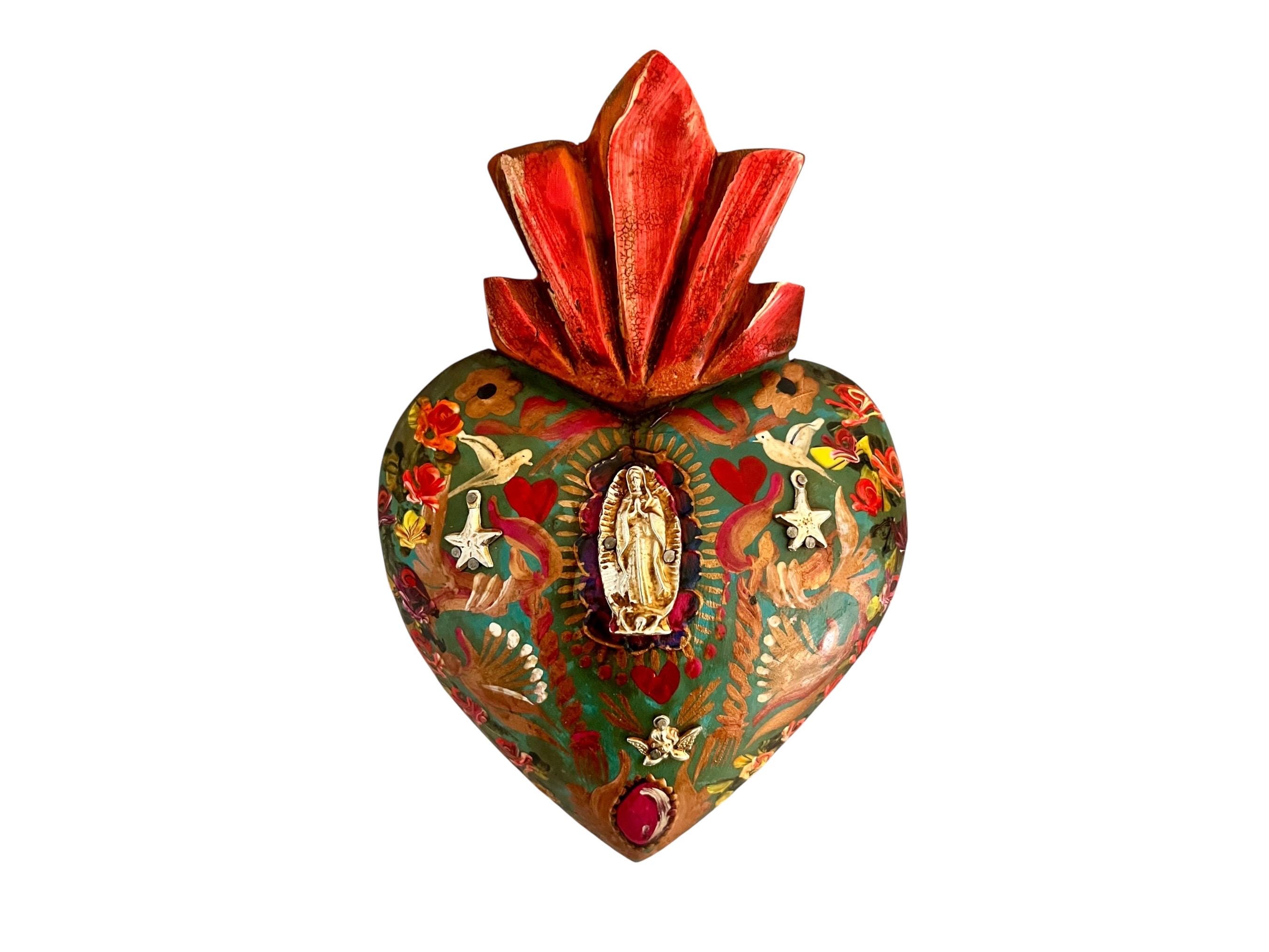 Charming painted heart - center has a VIRGIN GUADALUPE Milagro framed with a beautiful floral design with doves.