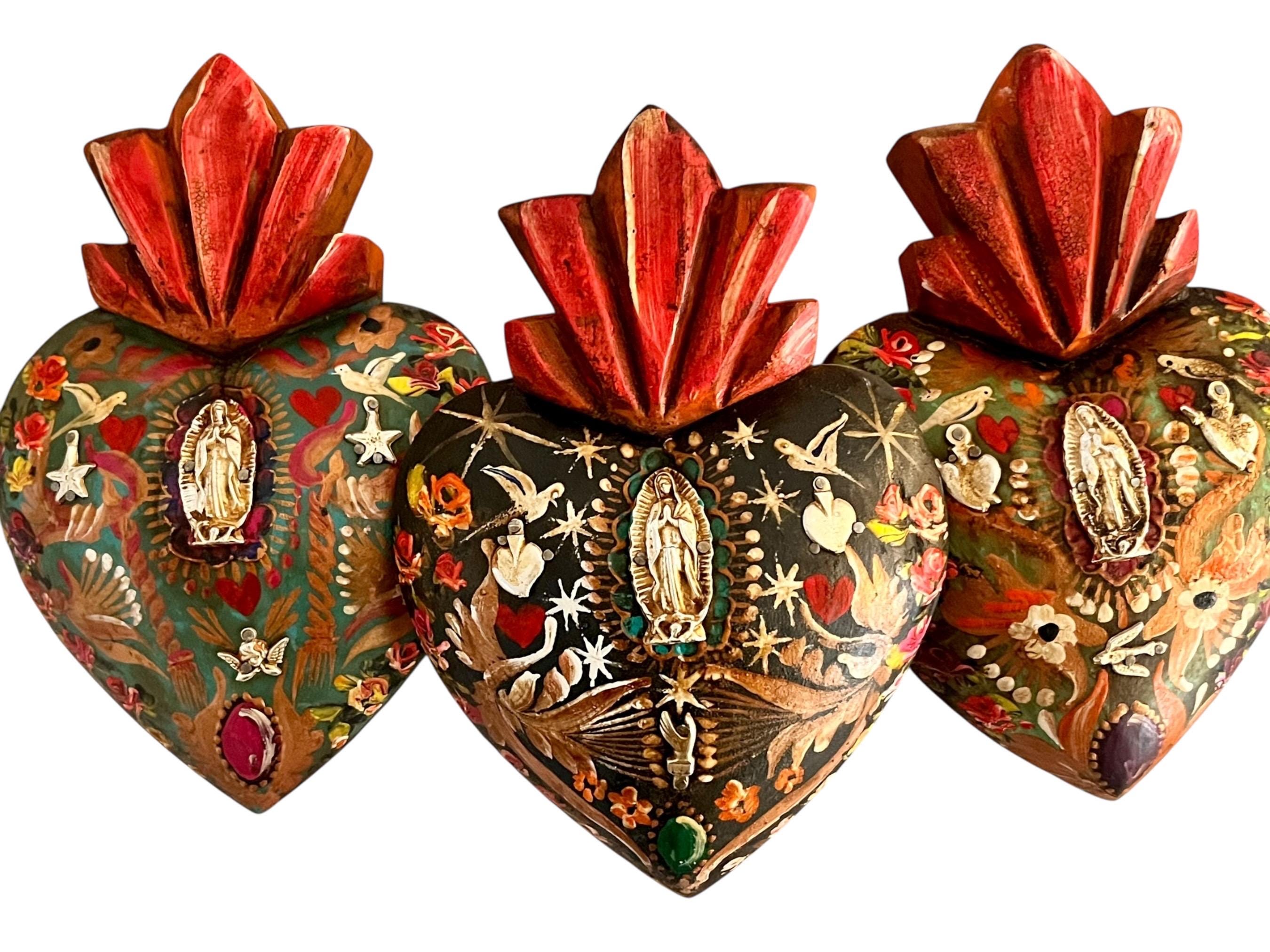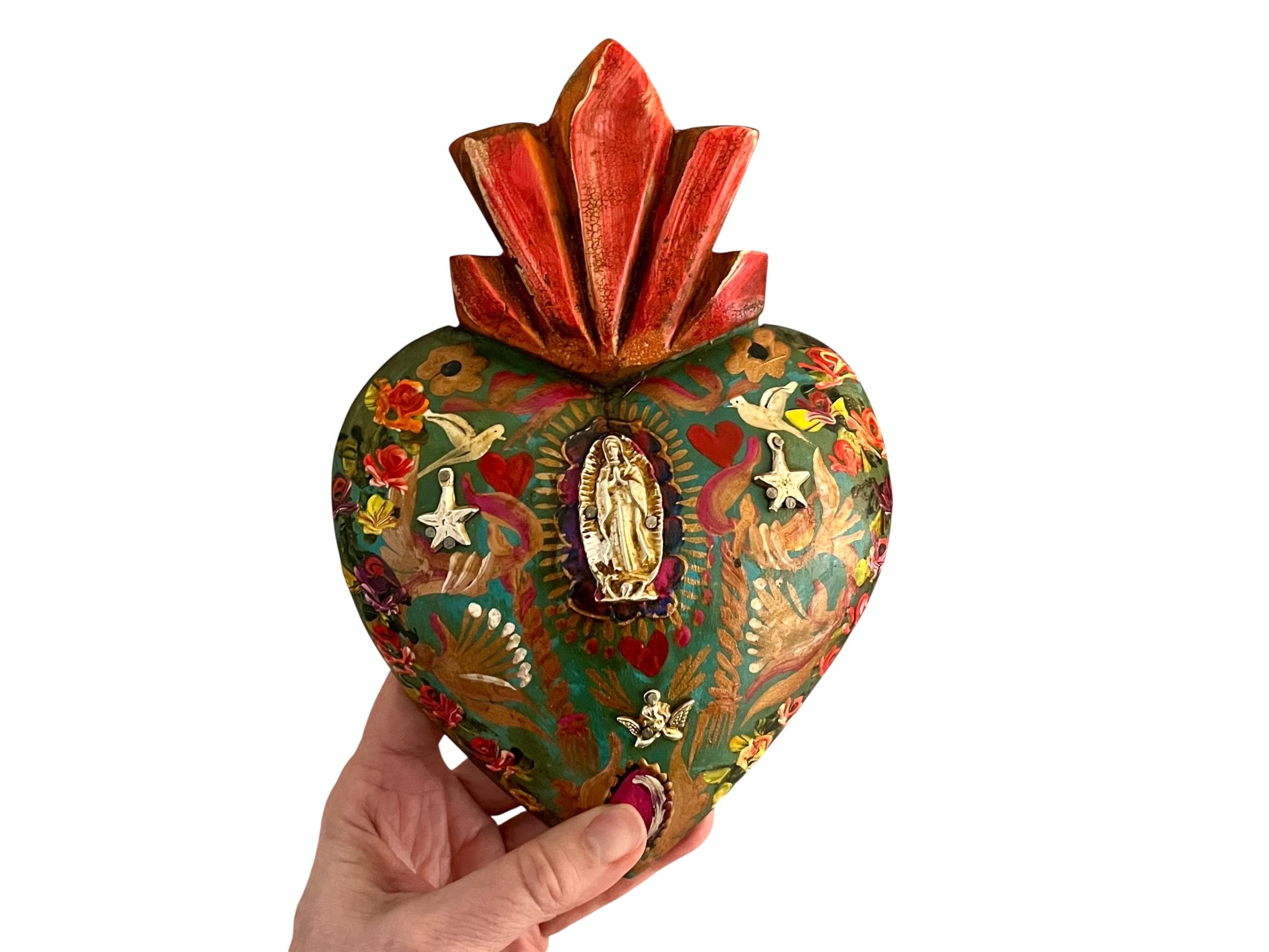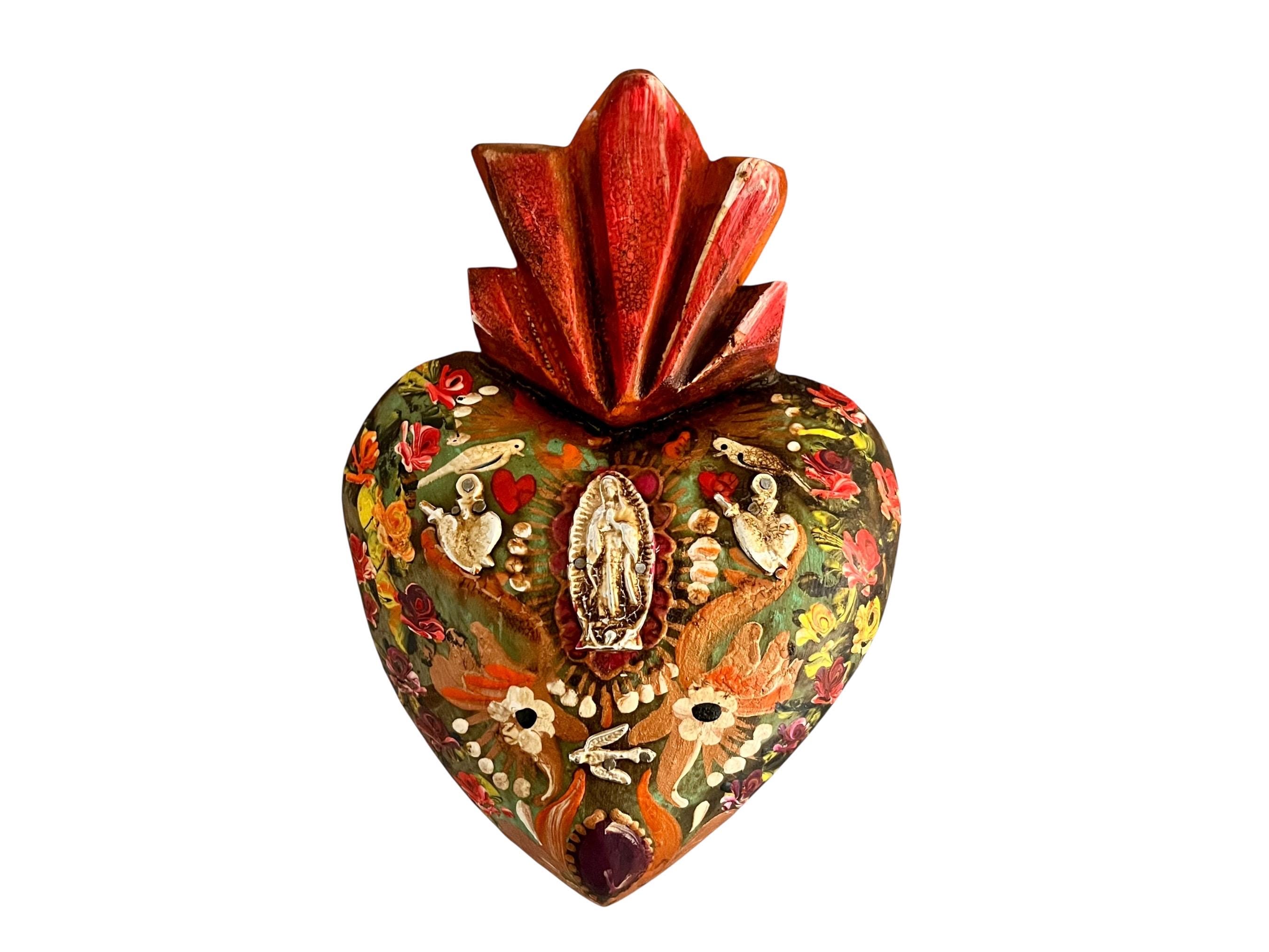 Charming painted heart - center has a VIRGIN GUADALUPE Milagro framed with a beautiful floral design with doves.