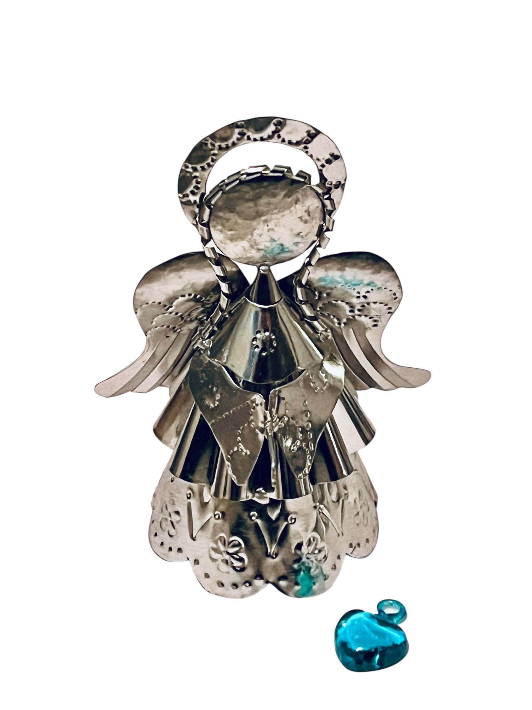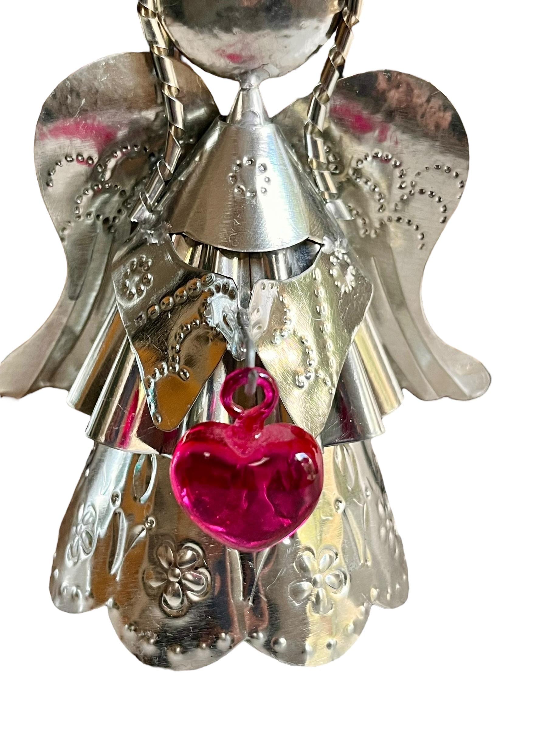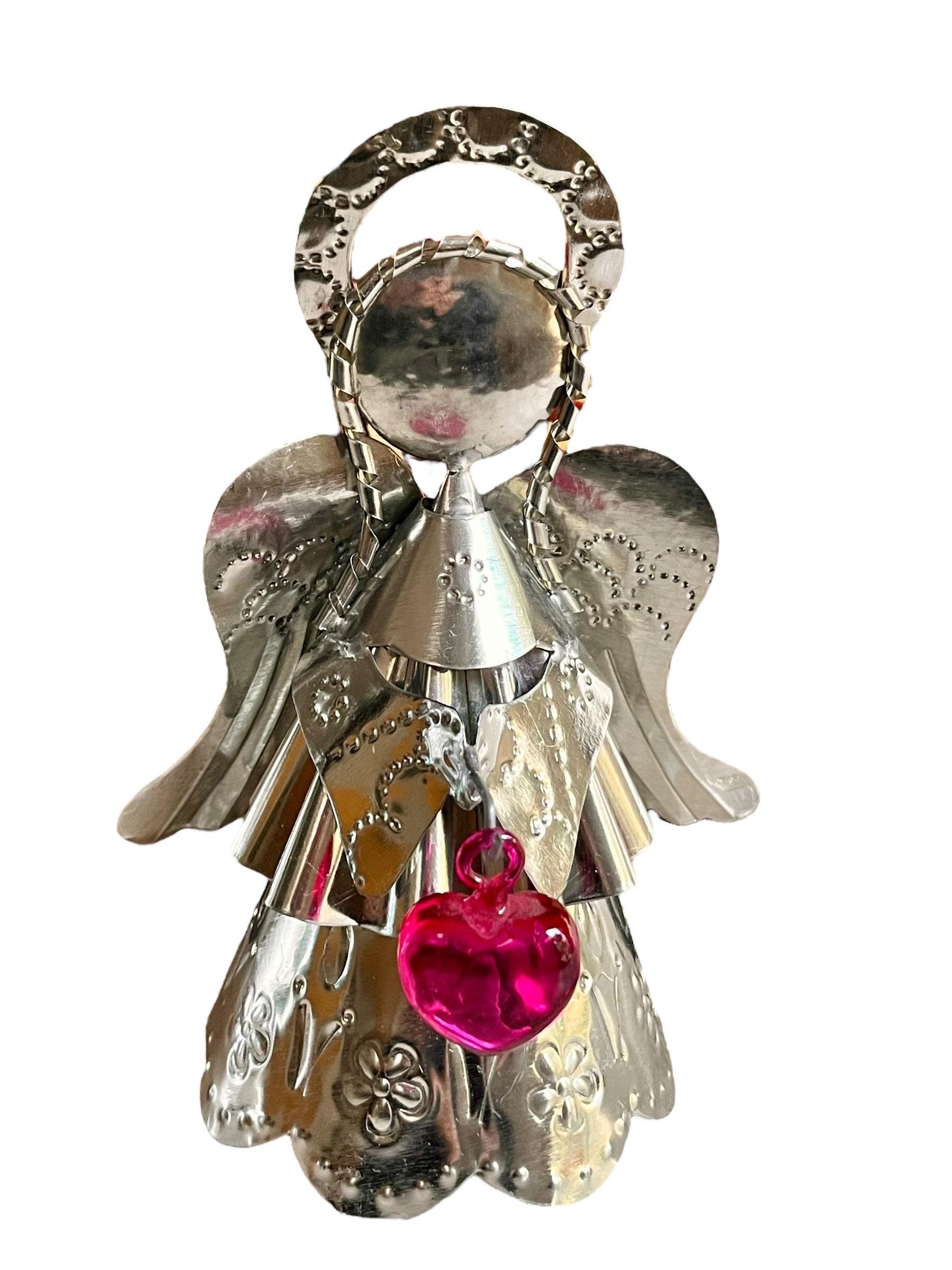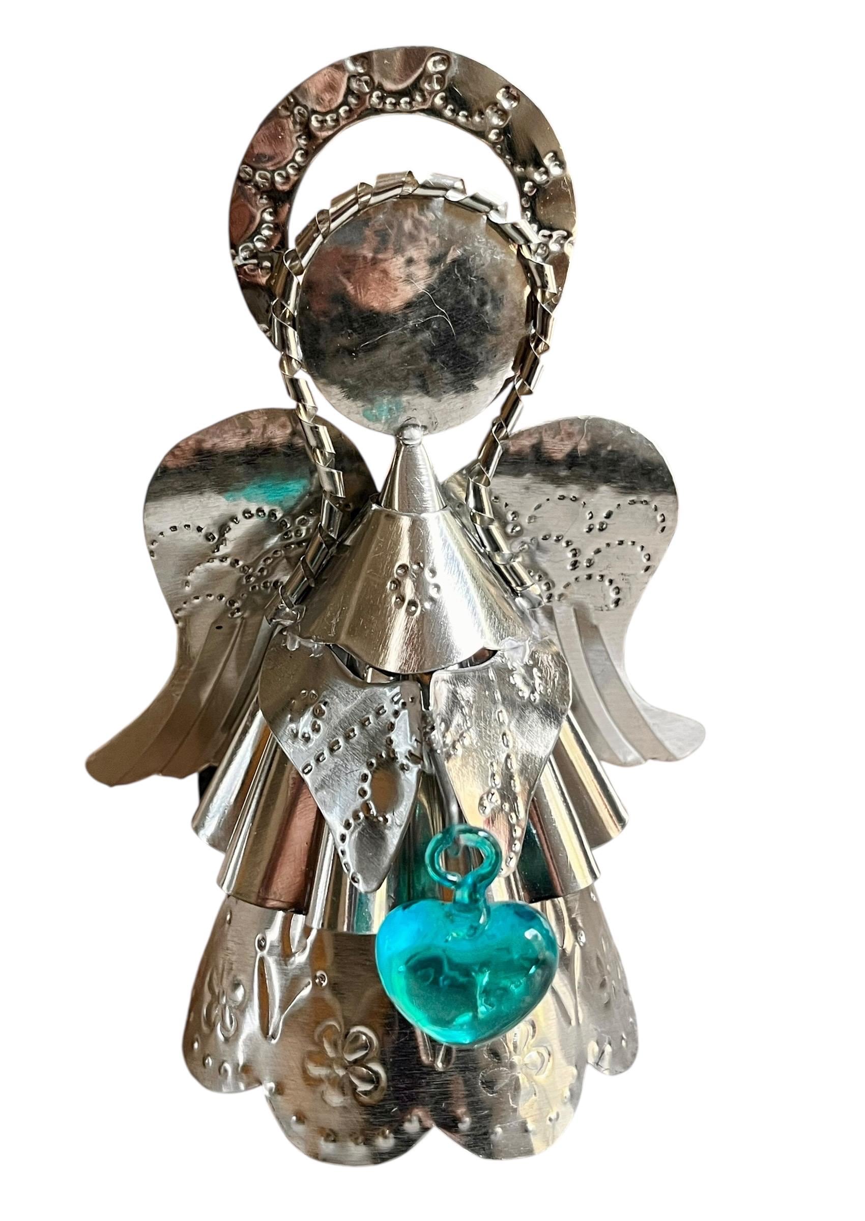 Sweet little tin Angel holding a glass heart!