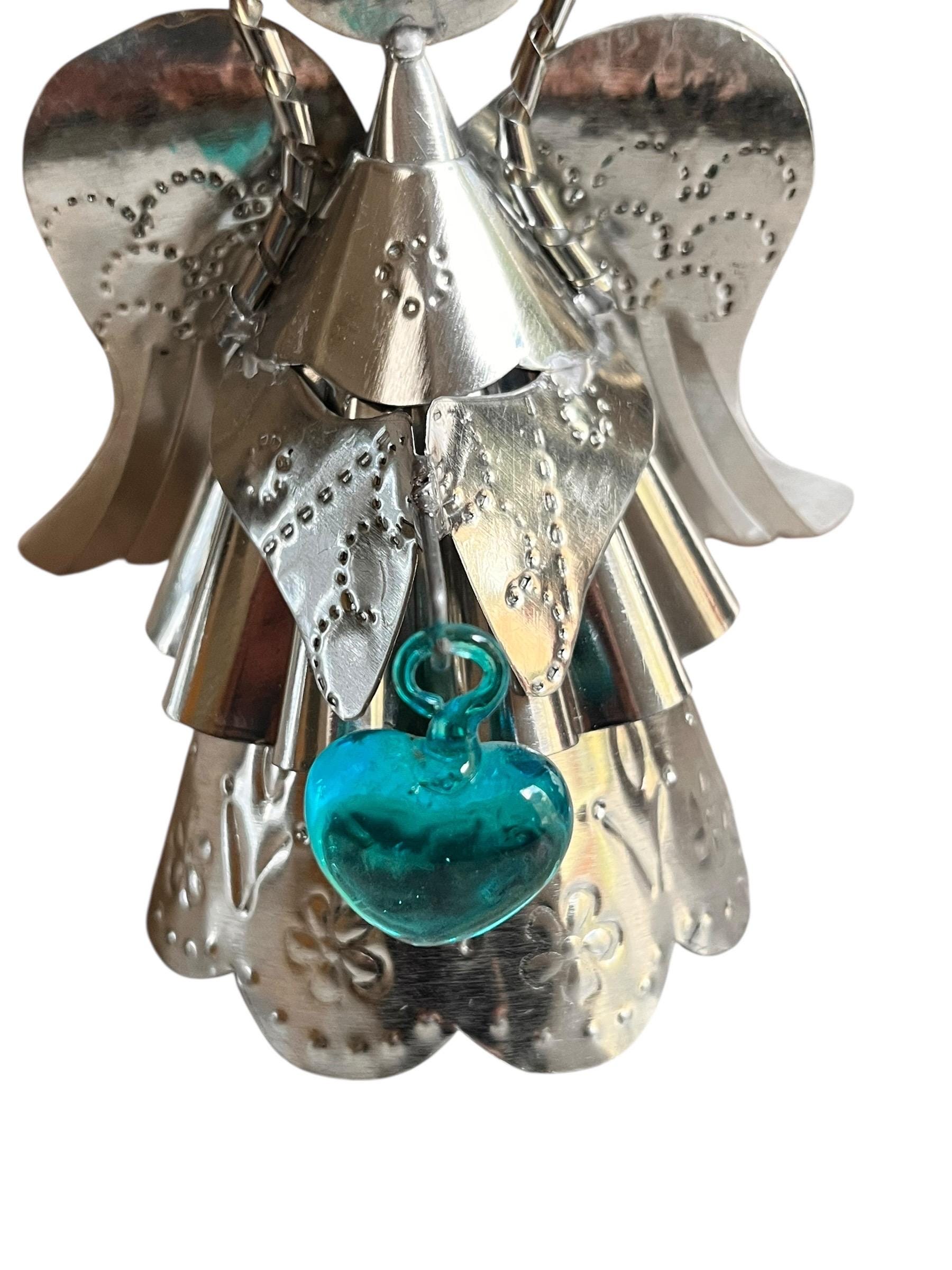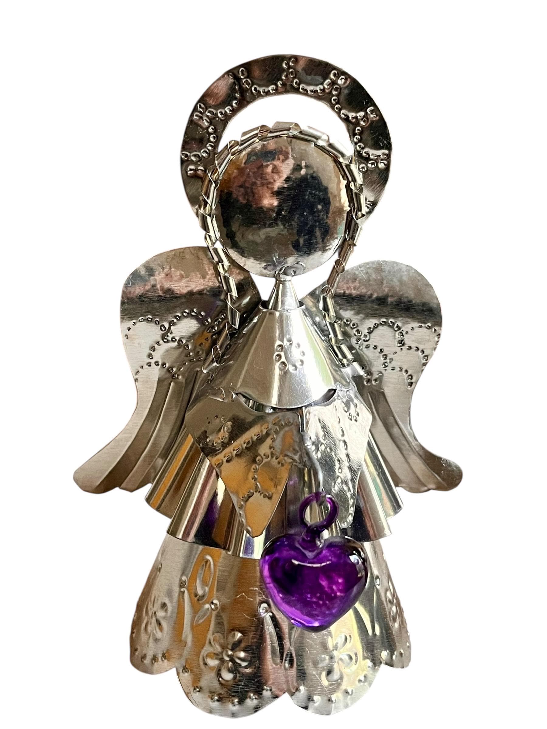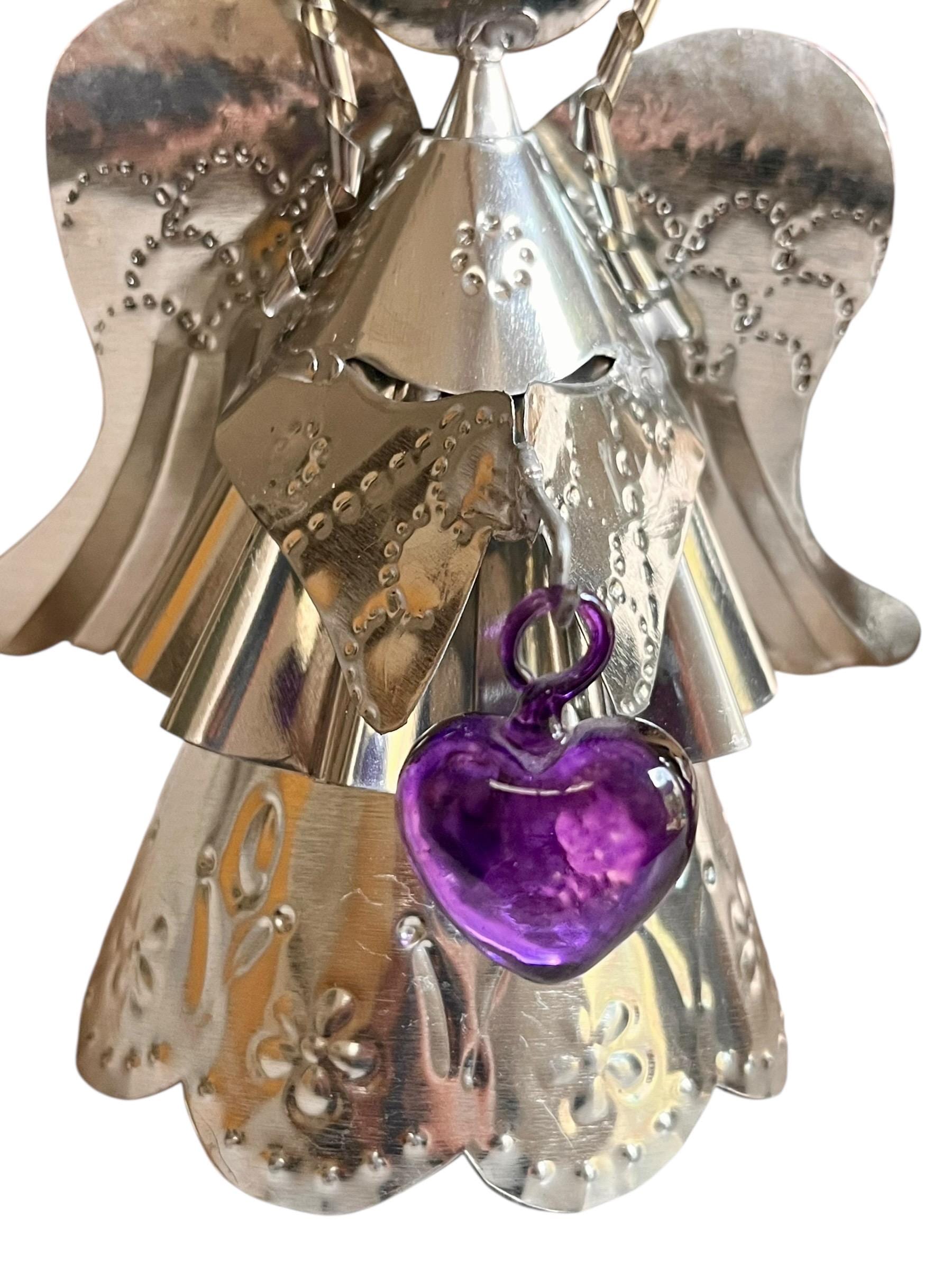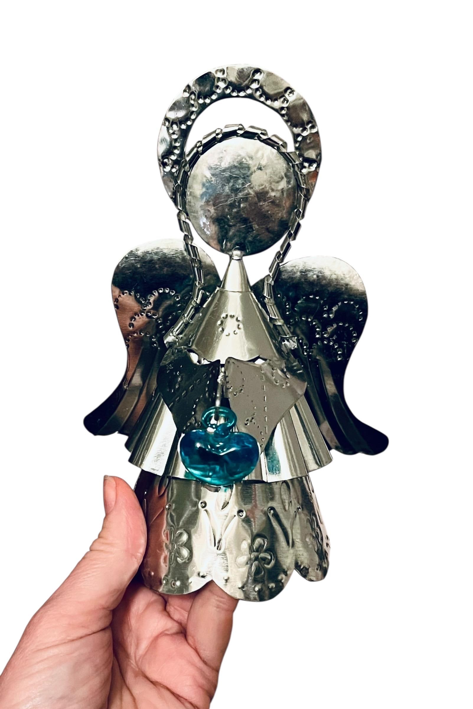 Sweet little tin Angel holding a glass heart!