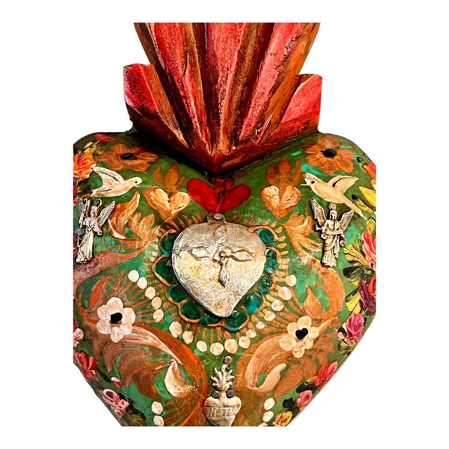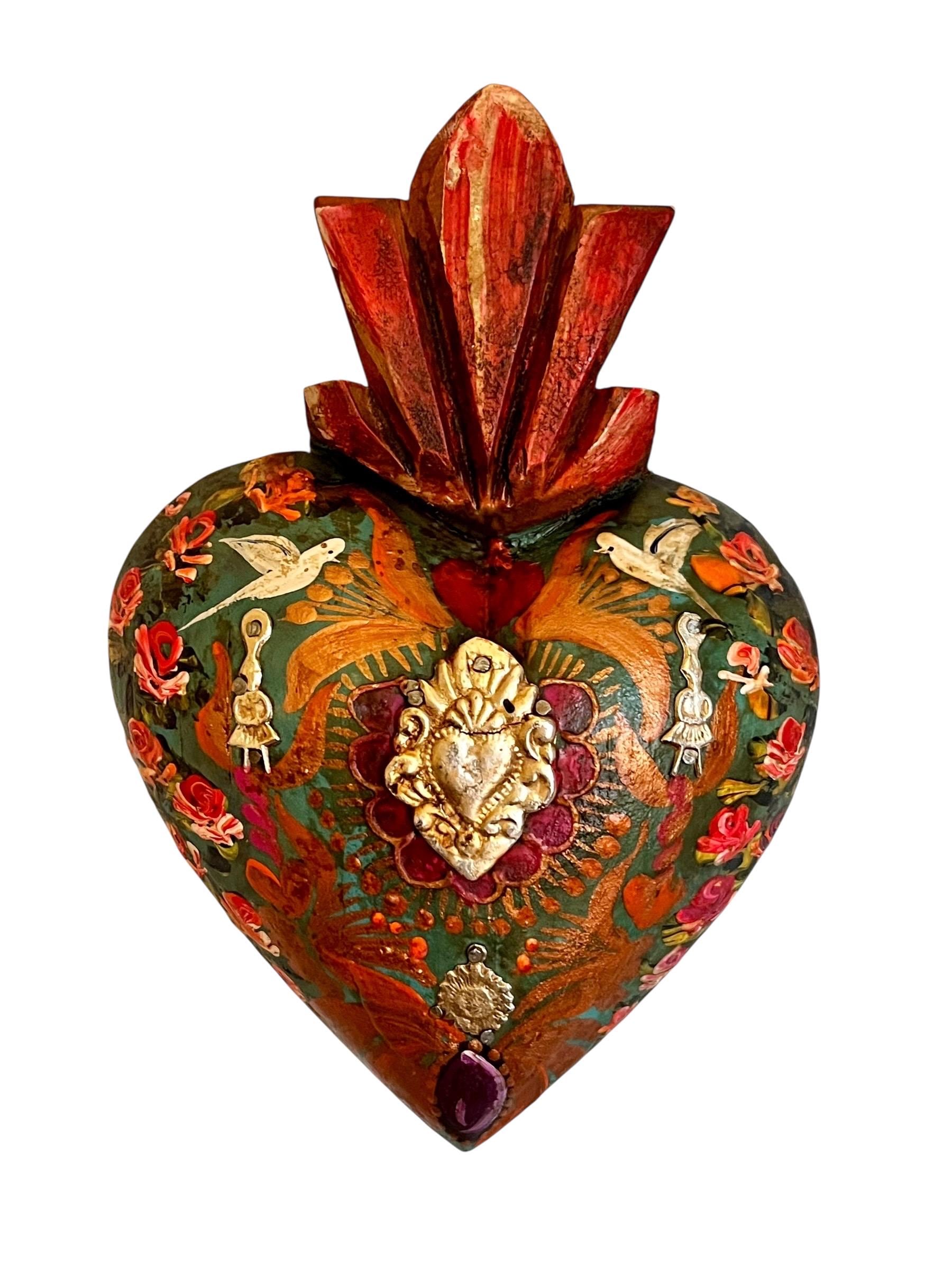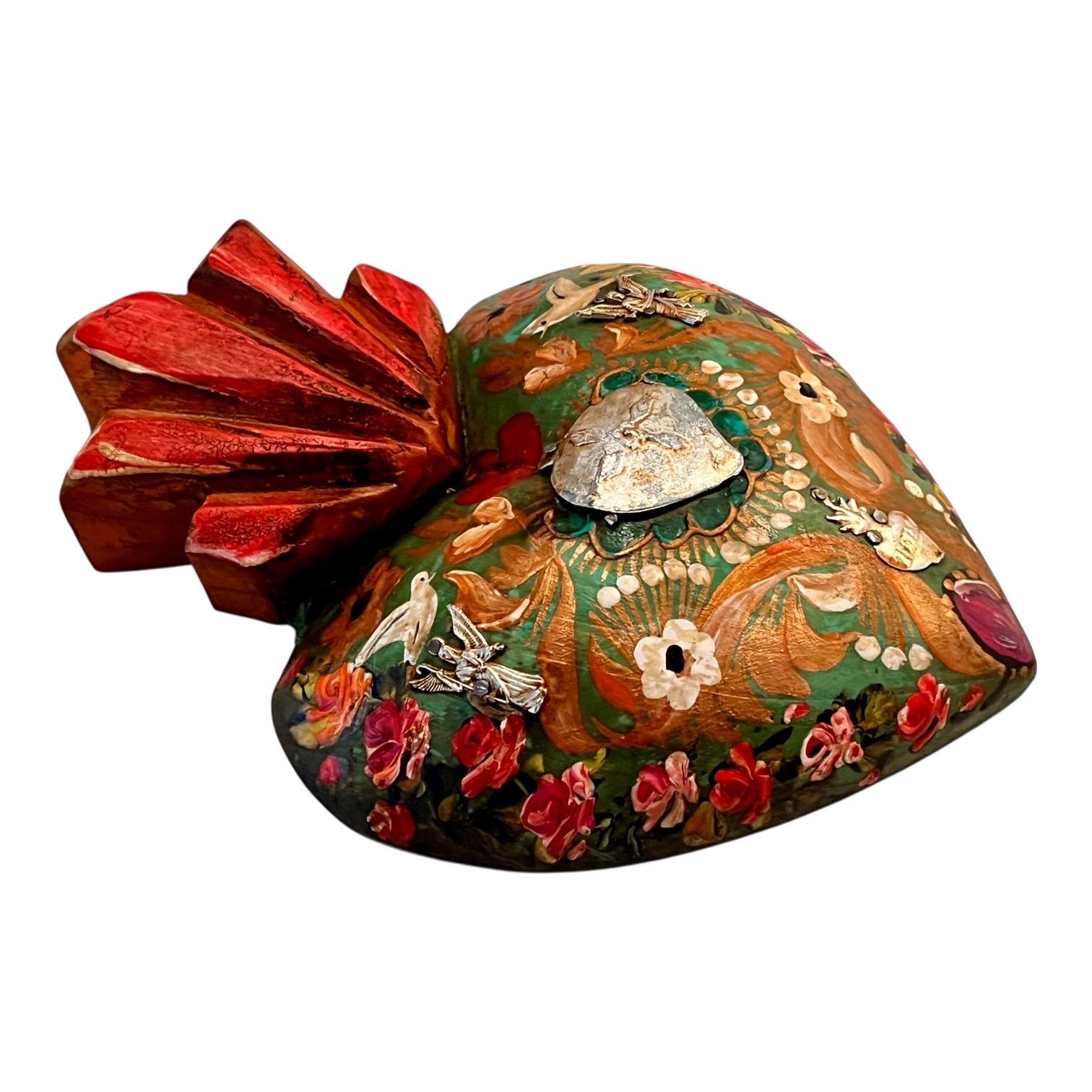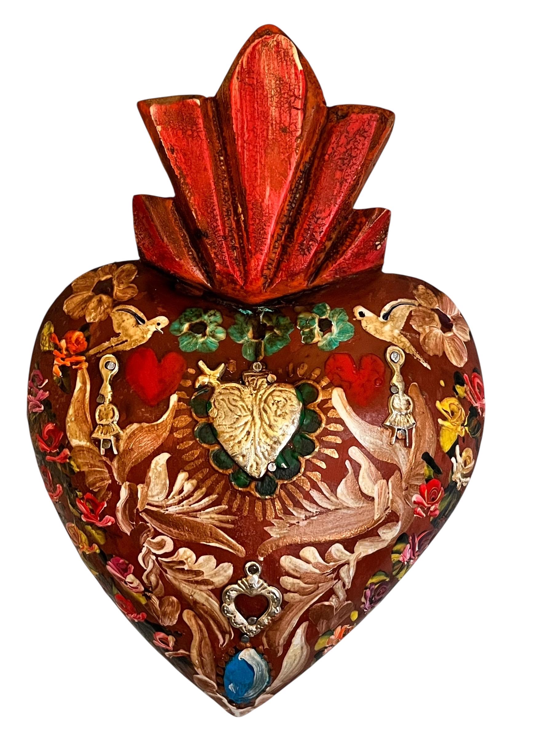 Charming painted heart - center has a large Heart Milagro framed with a beautiful floral design with doves.