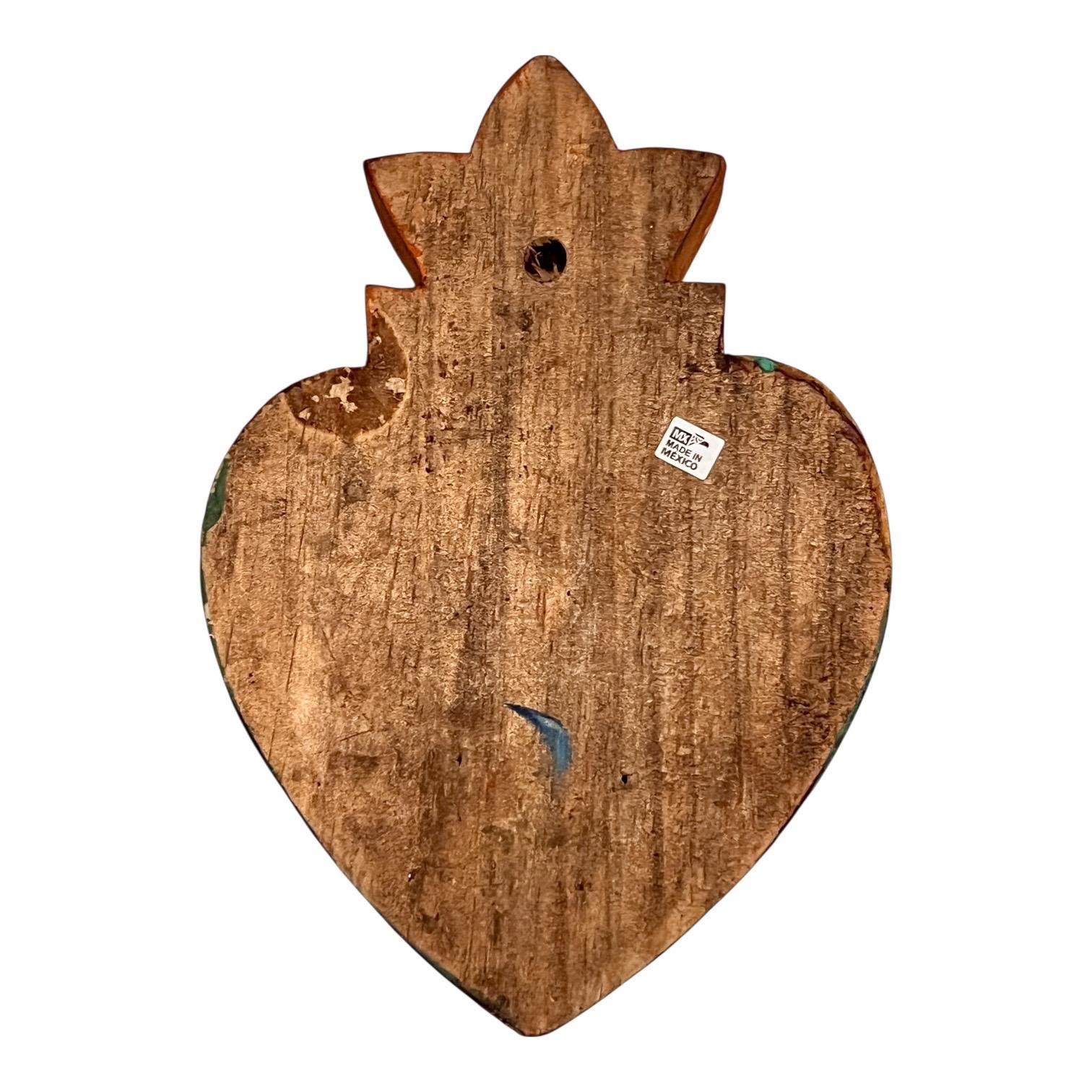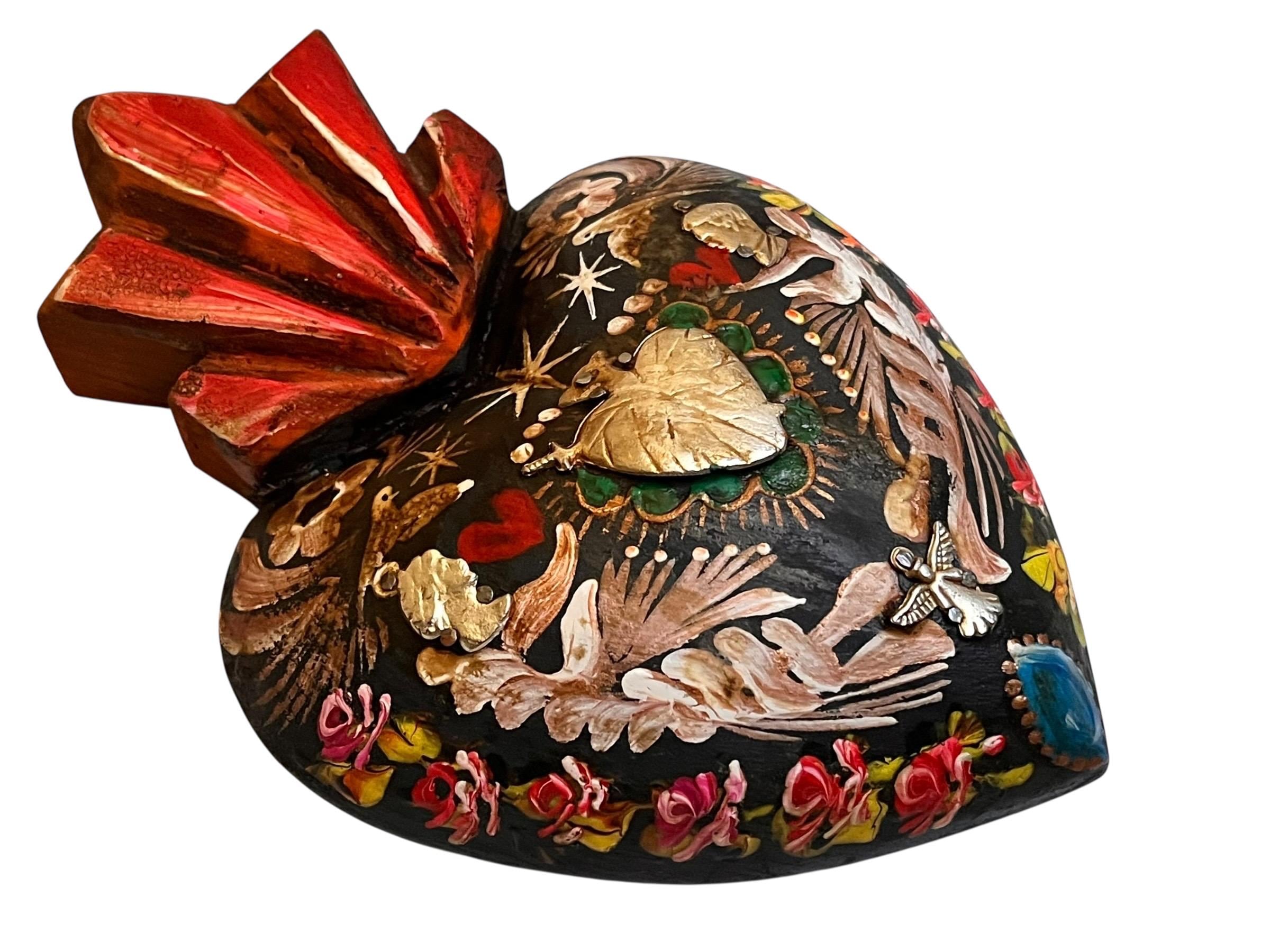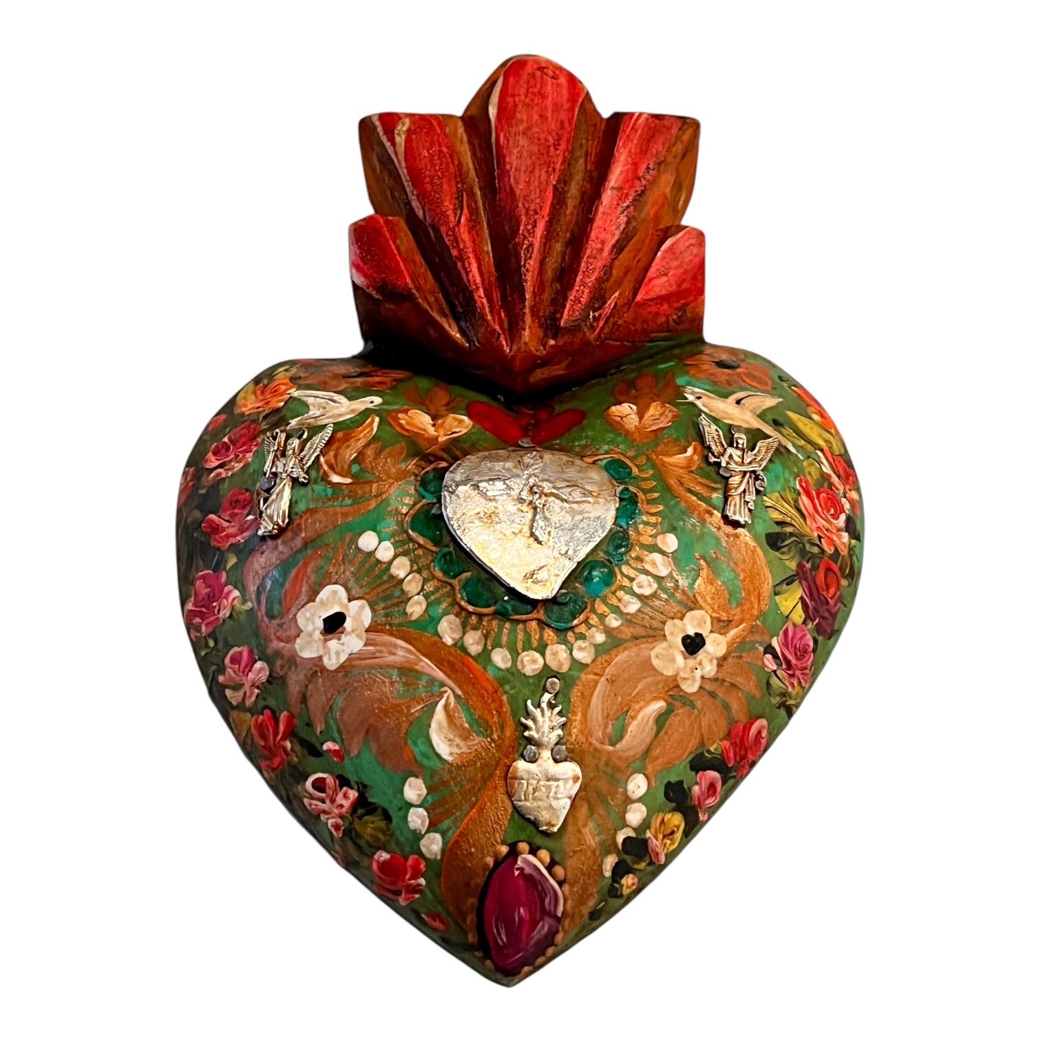 Charming painted heart - center has a large Heart Milagro framed with a beautiful floral design with doves.