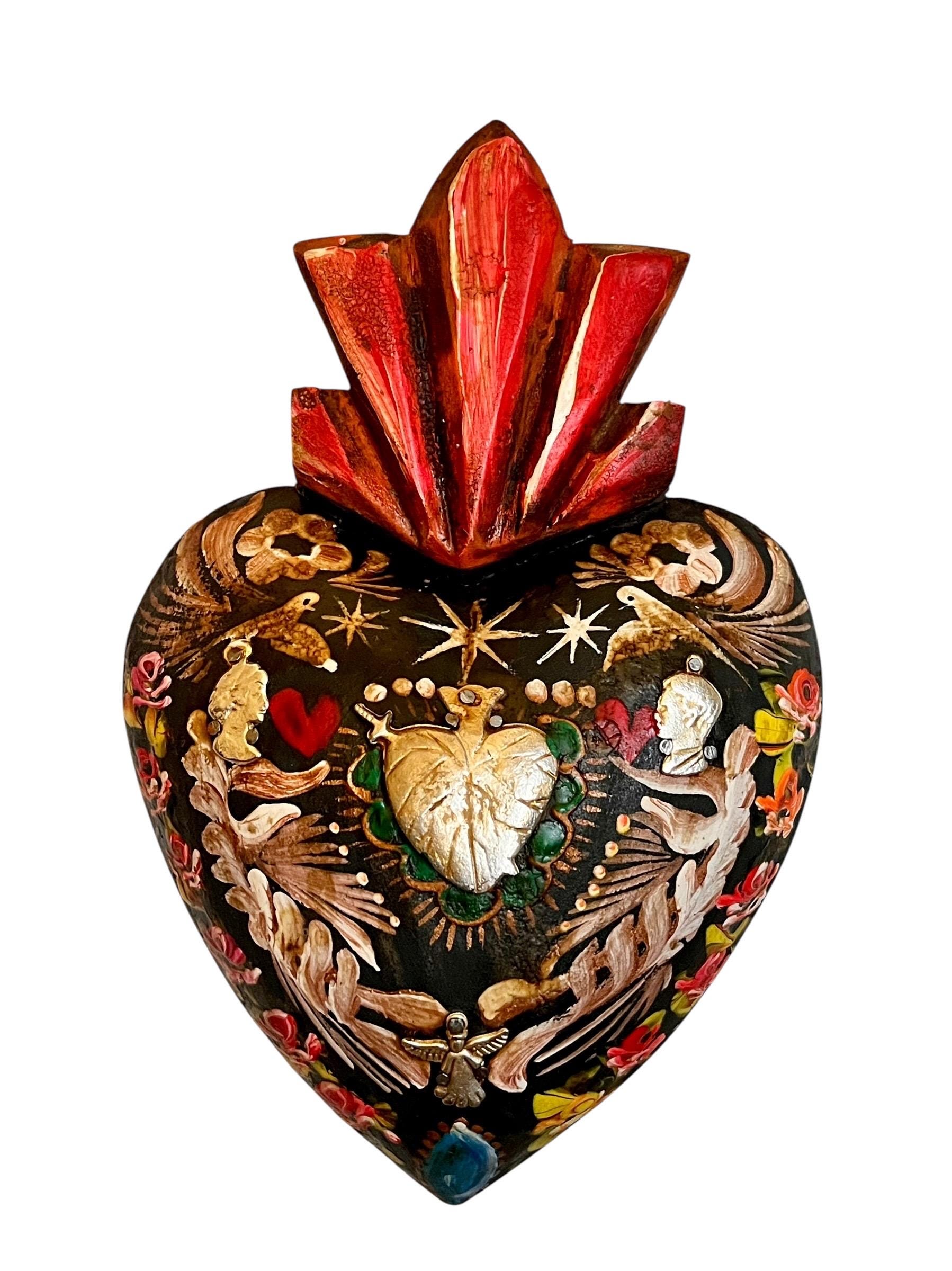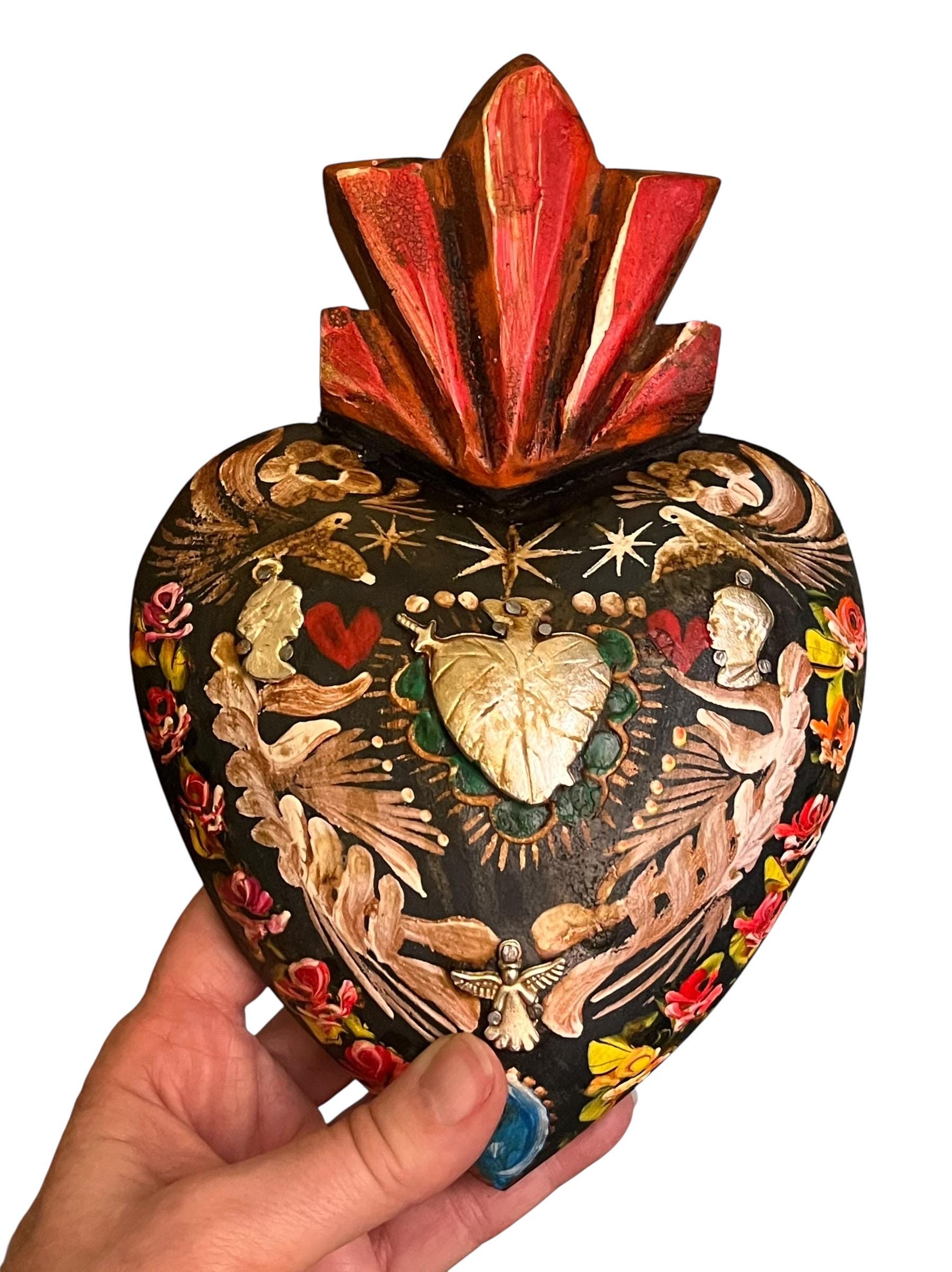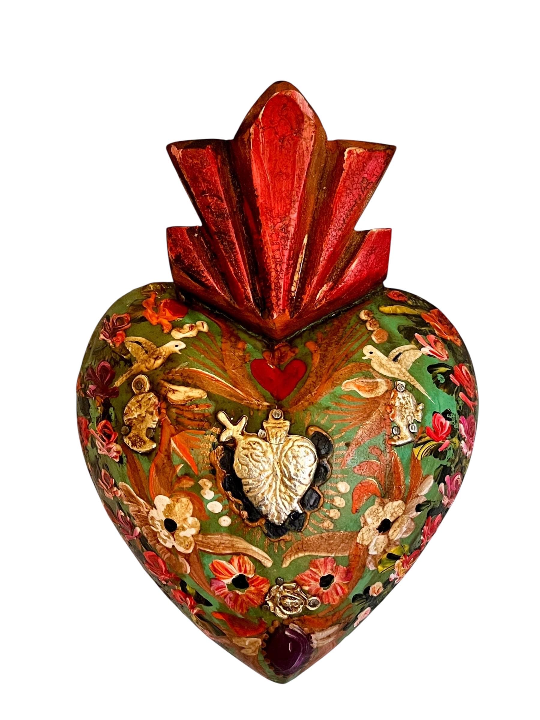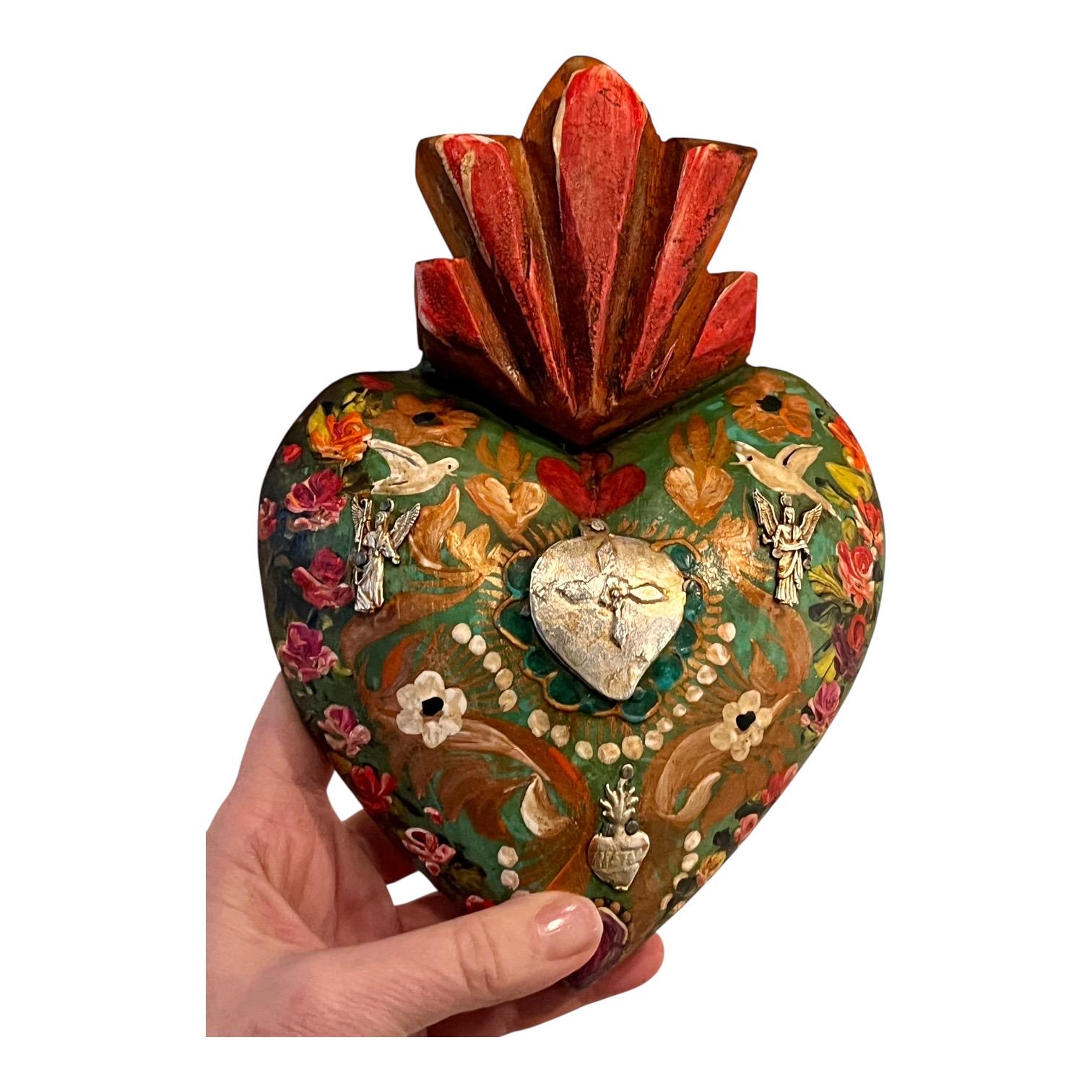 Charming painted heart - center has a large Heart Milagro framed with a beautiful floral design with doves.