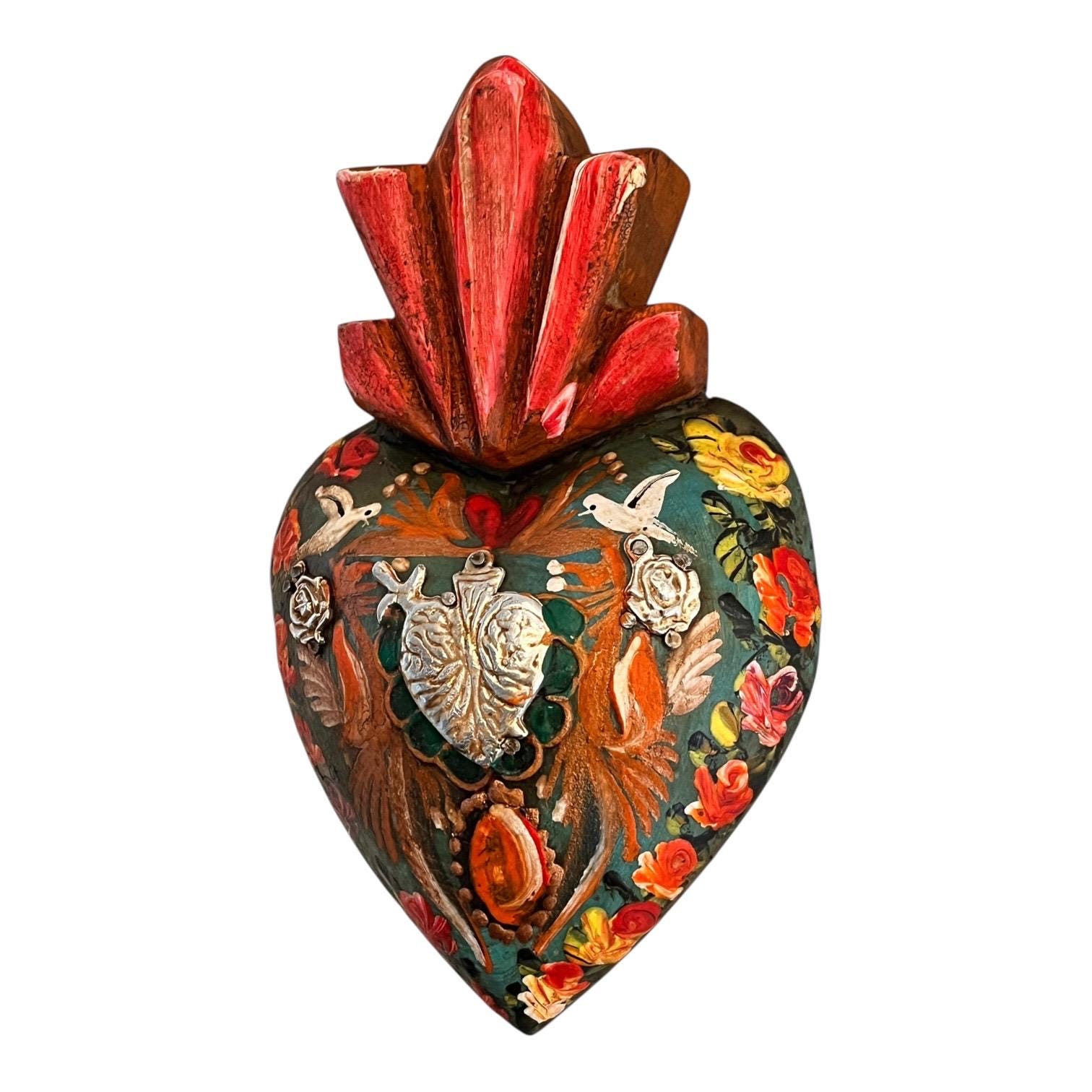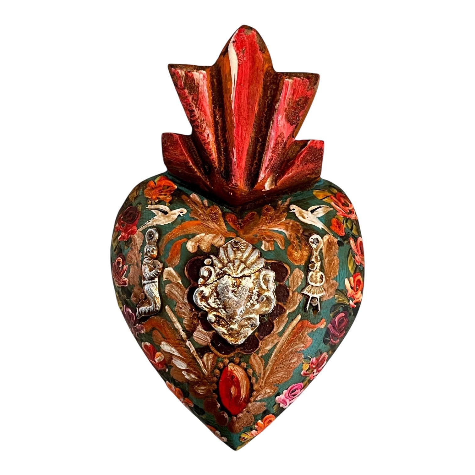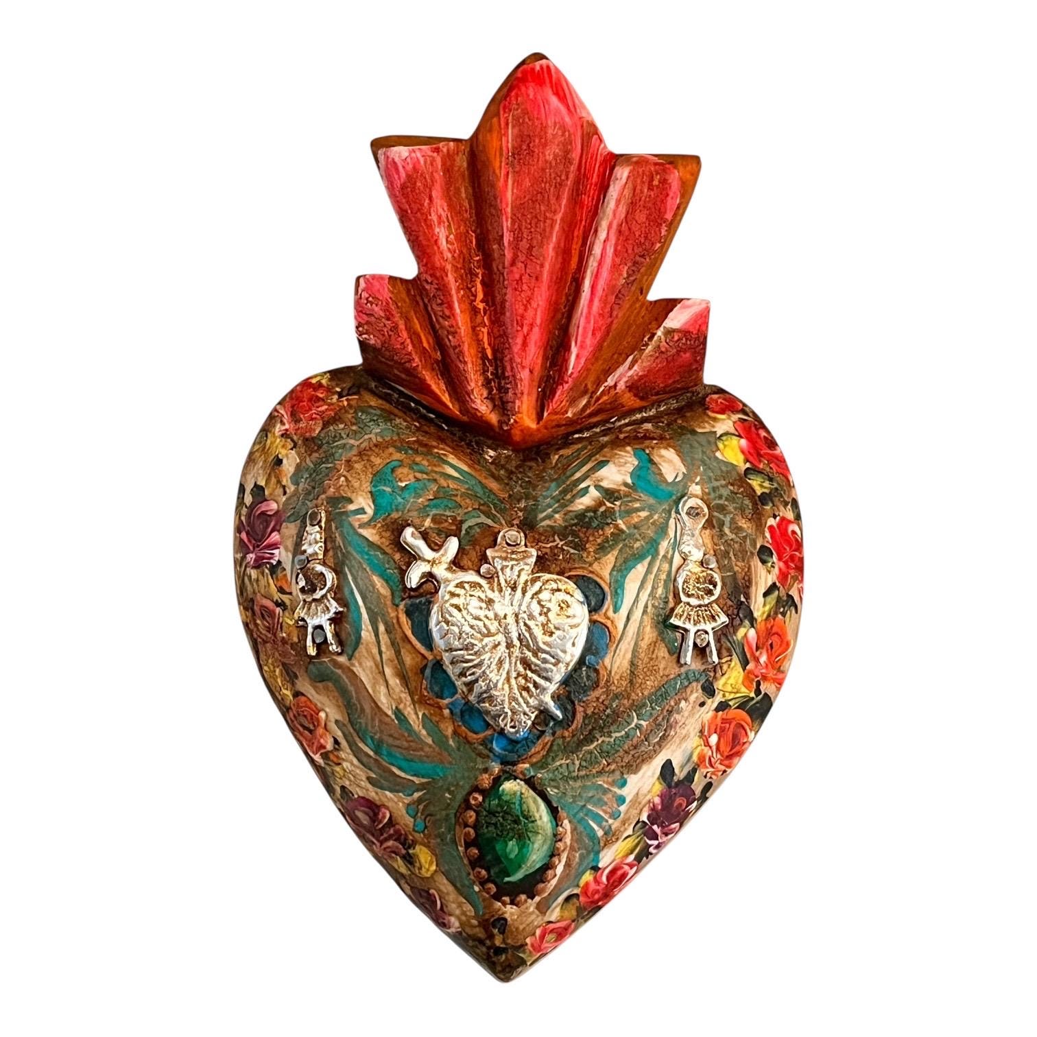 Charming painted heart - center has a Sacred Heart Milagro framed with a beautiful floral design with doves.