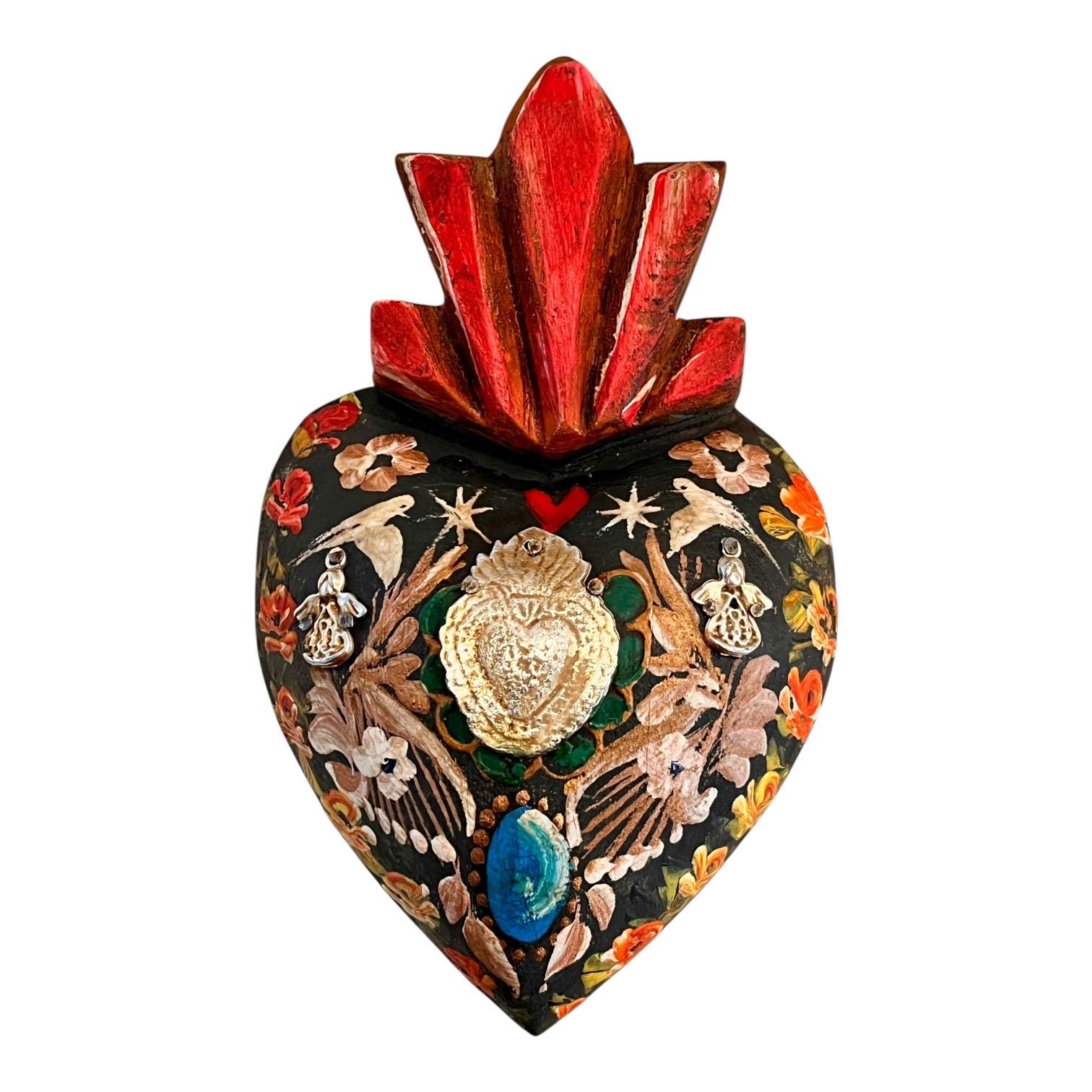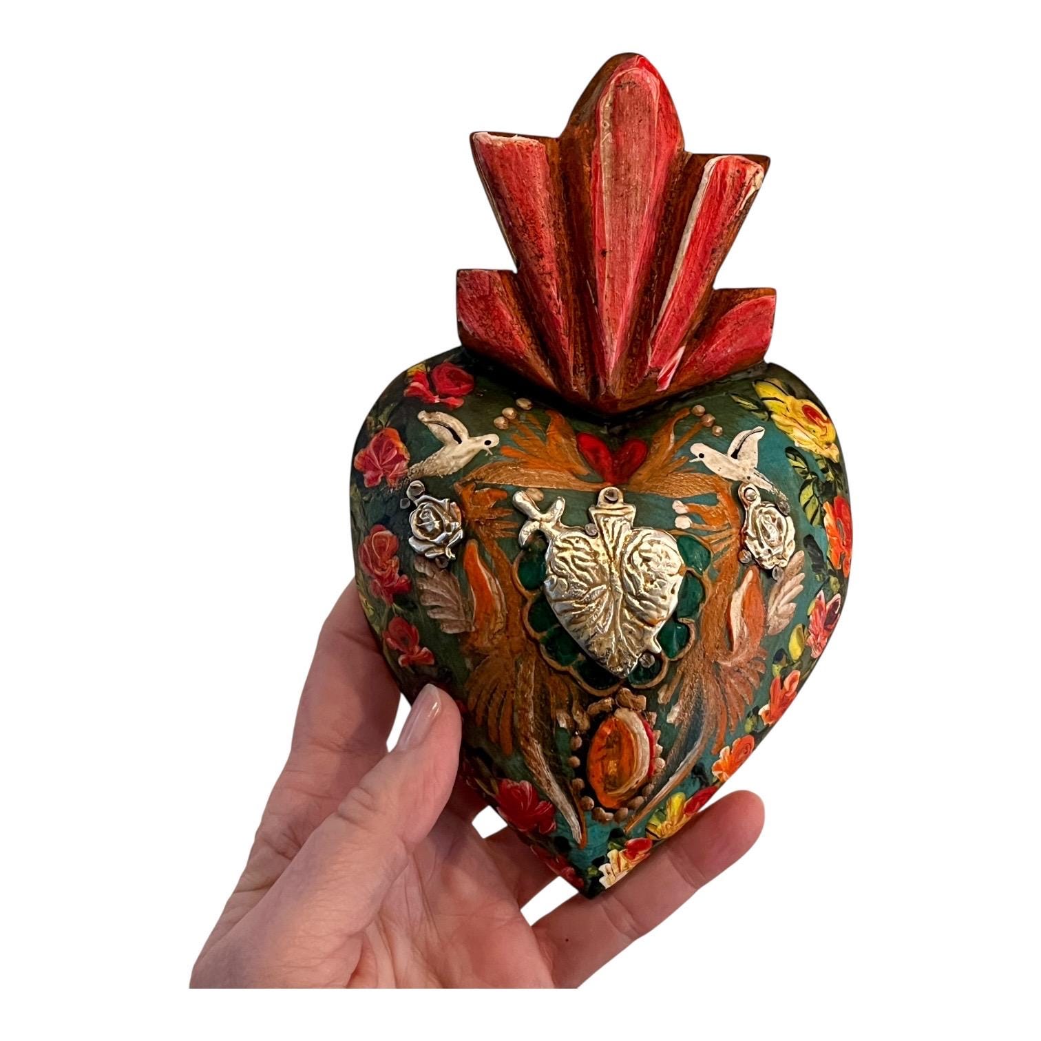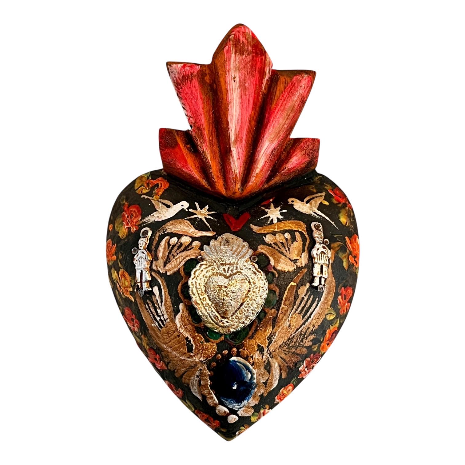 Charming painted heart - center has a Sacred Heart Milagro framed with a beautiful floral design with doves.