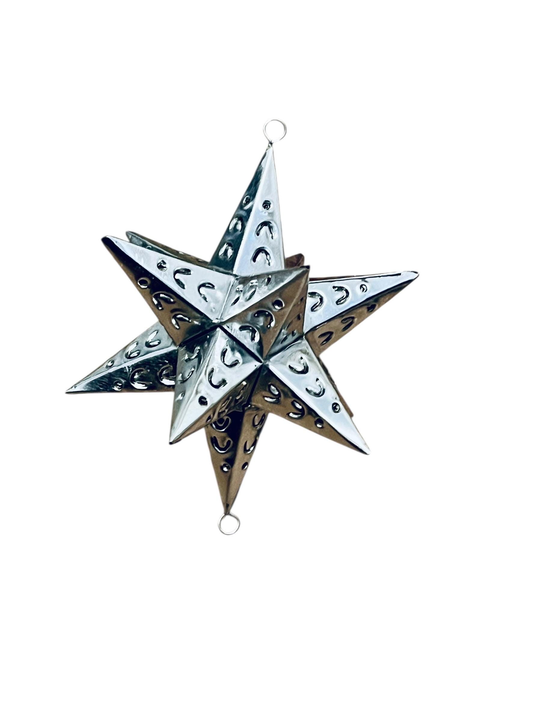 Set of (4) punched tin star ornaments with colorful ribbons.