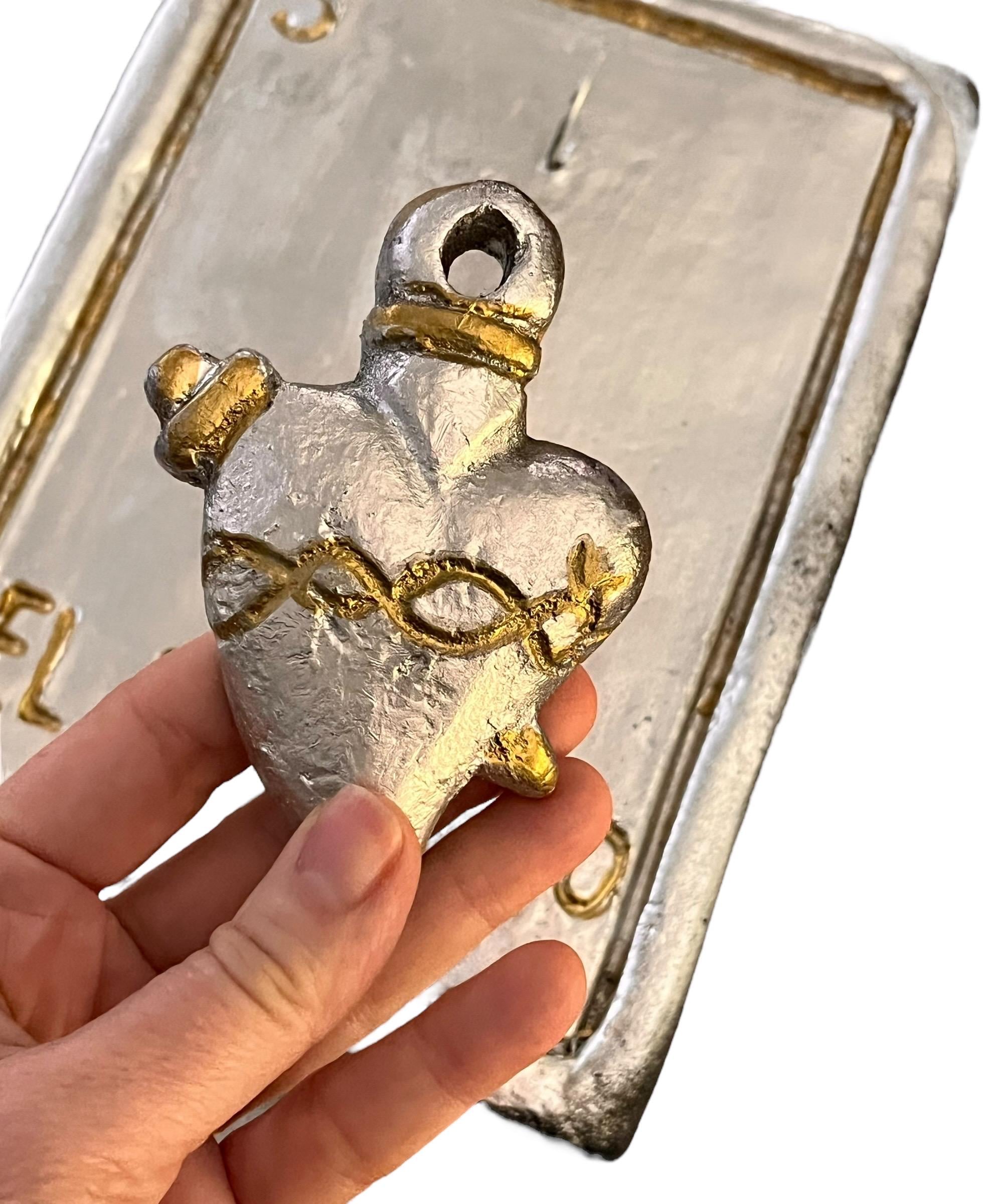 The plaque is two pieces…the painted clay Sacred Heart hangs on the thick plaque from a metal pin.
