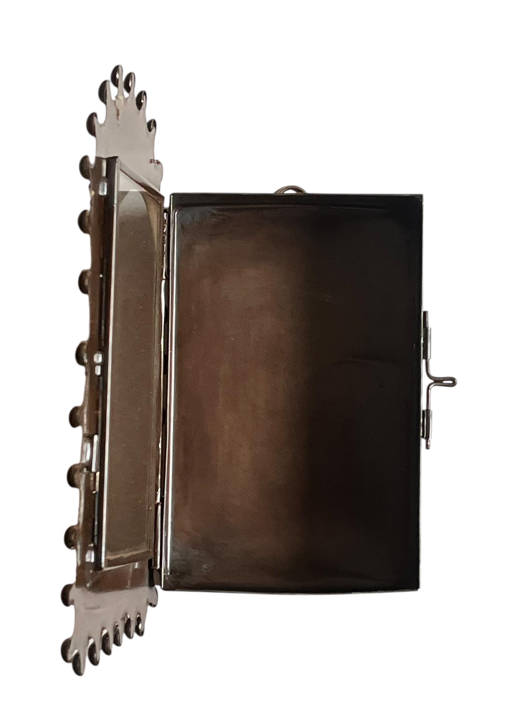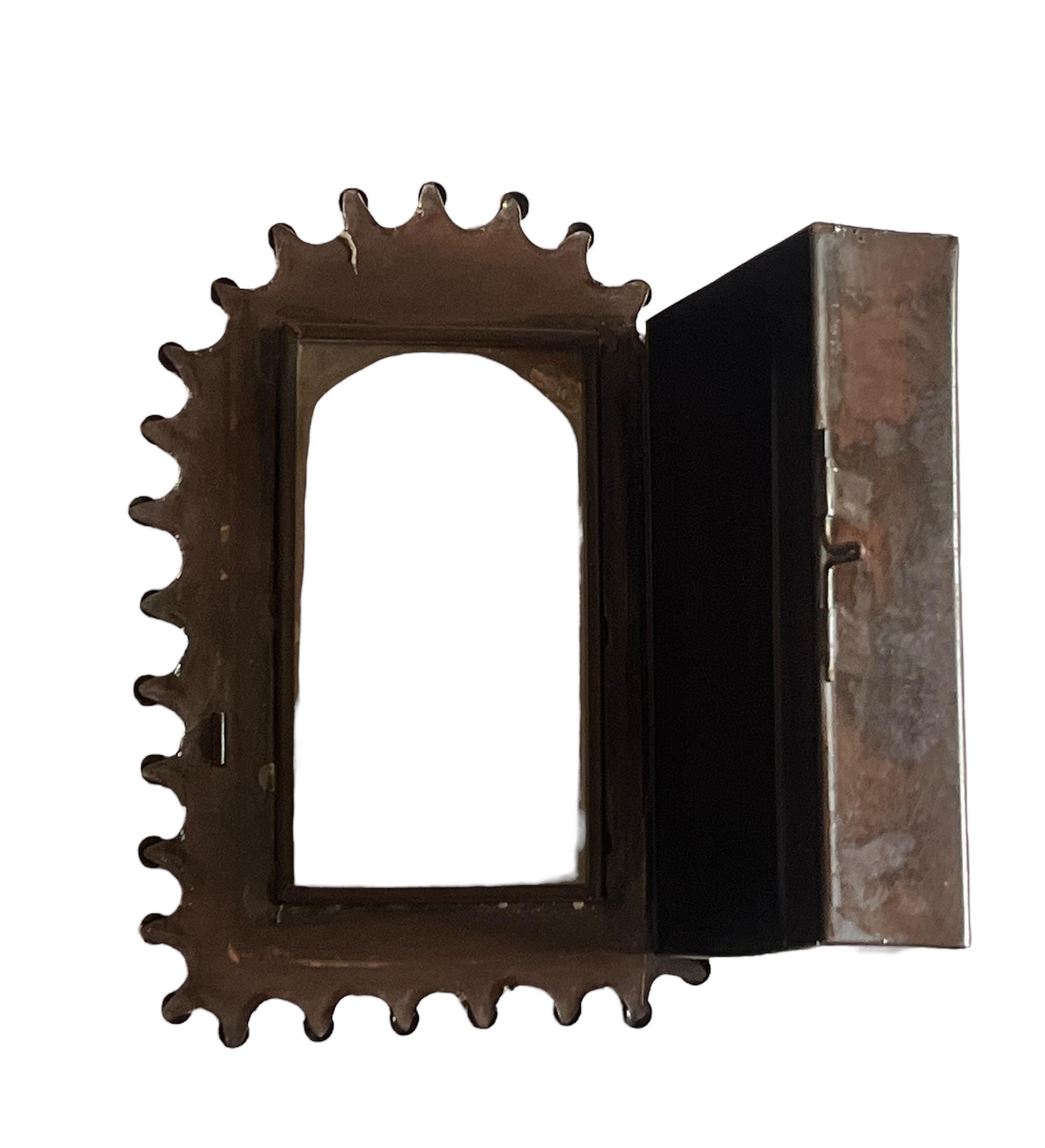 The Nicho has a hinged glass door with frame to add your own image or trinkets.