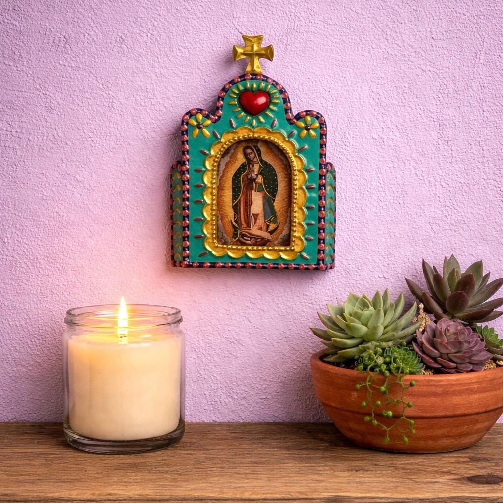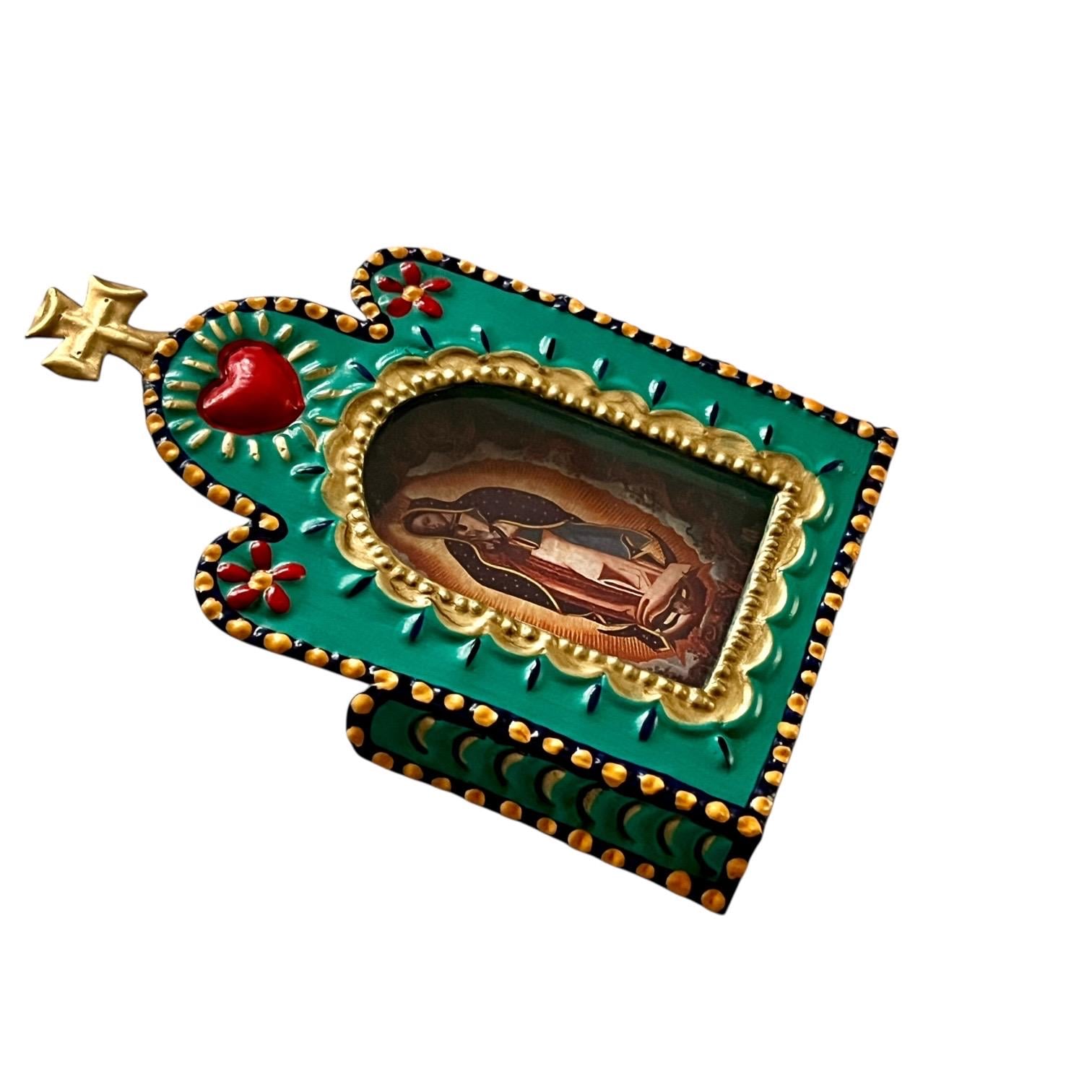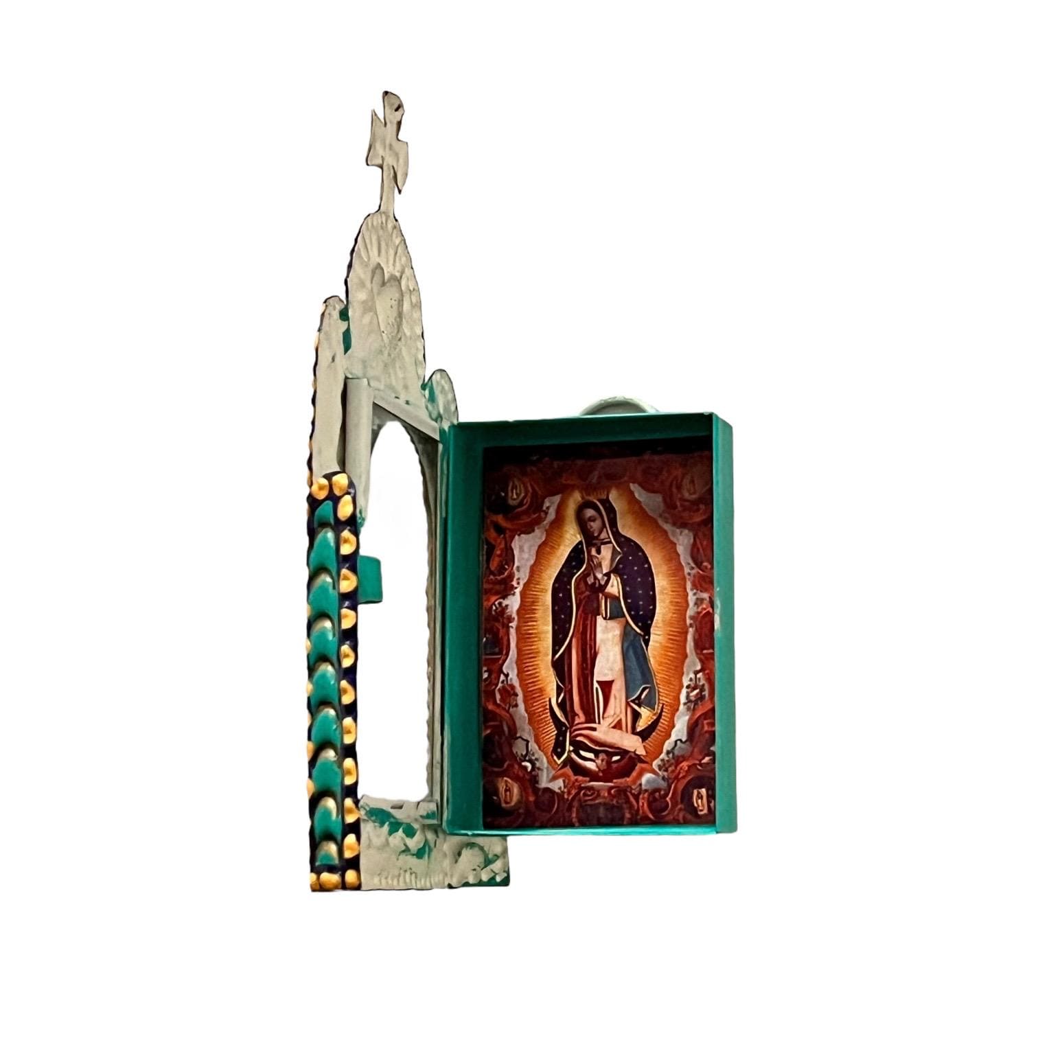 There is an image of the Virgin Guadalupe behind a hinged glass door.