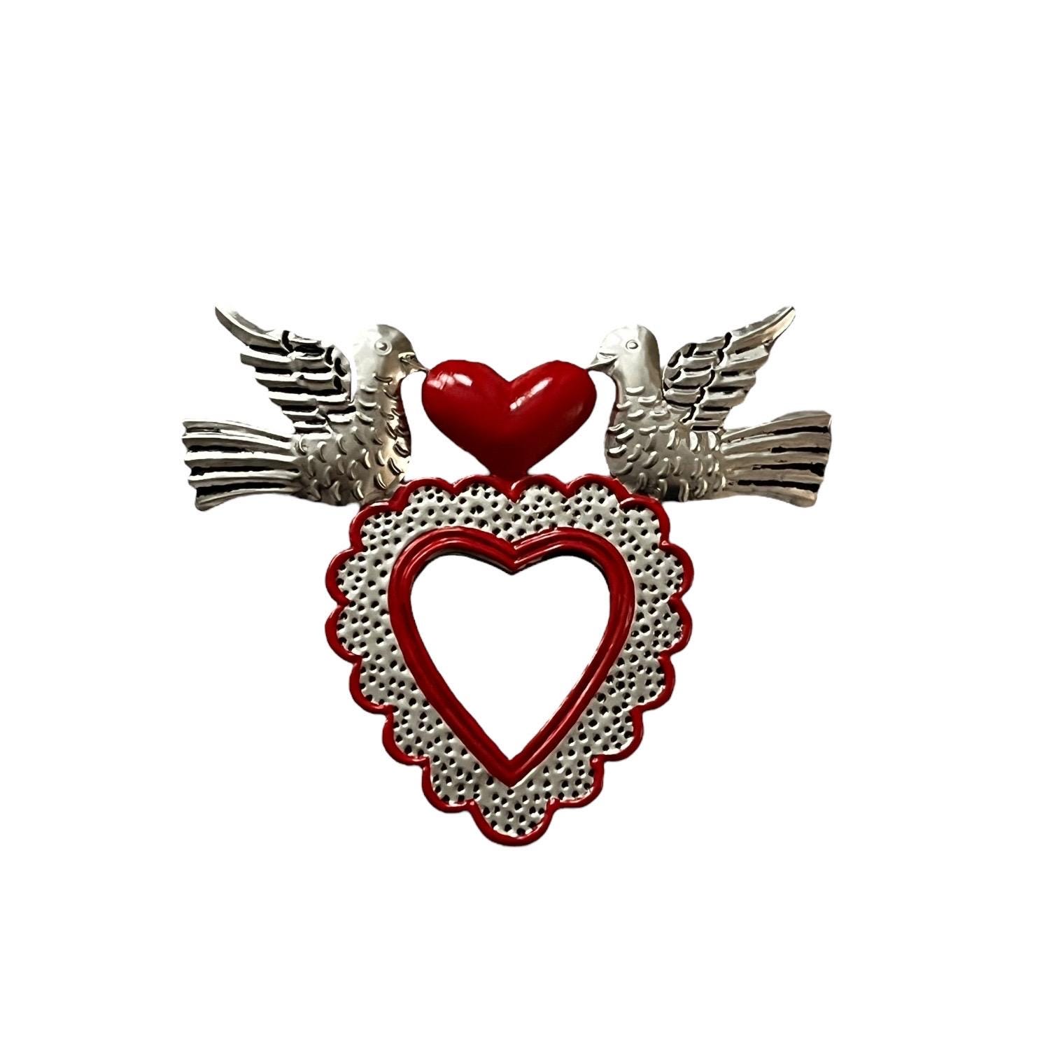 Sweet little heart with mirror topped with a red heart and a dove on each side.