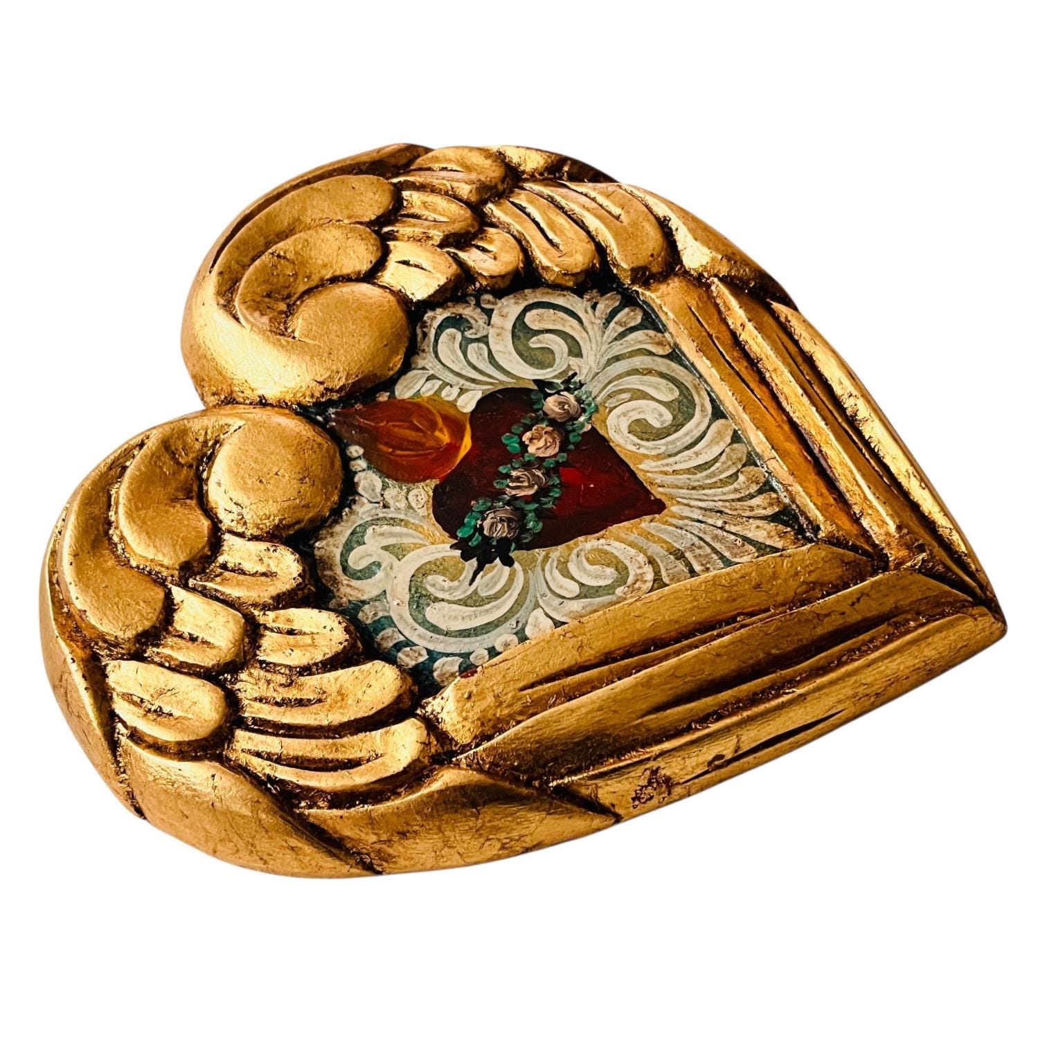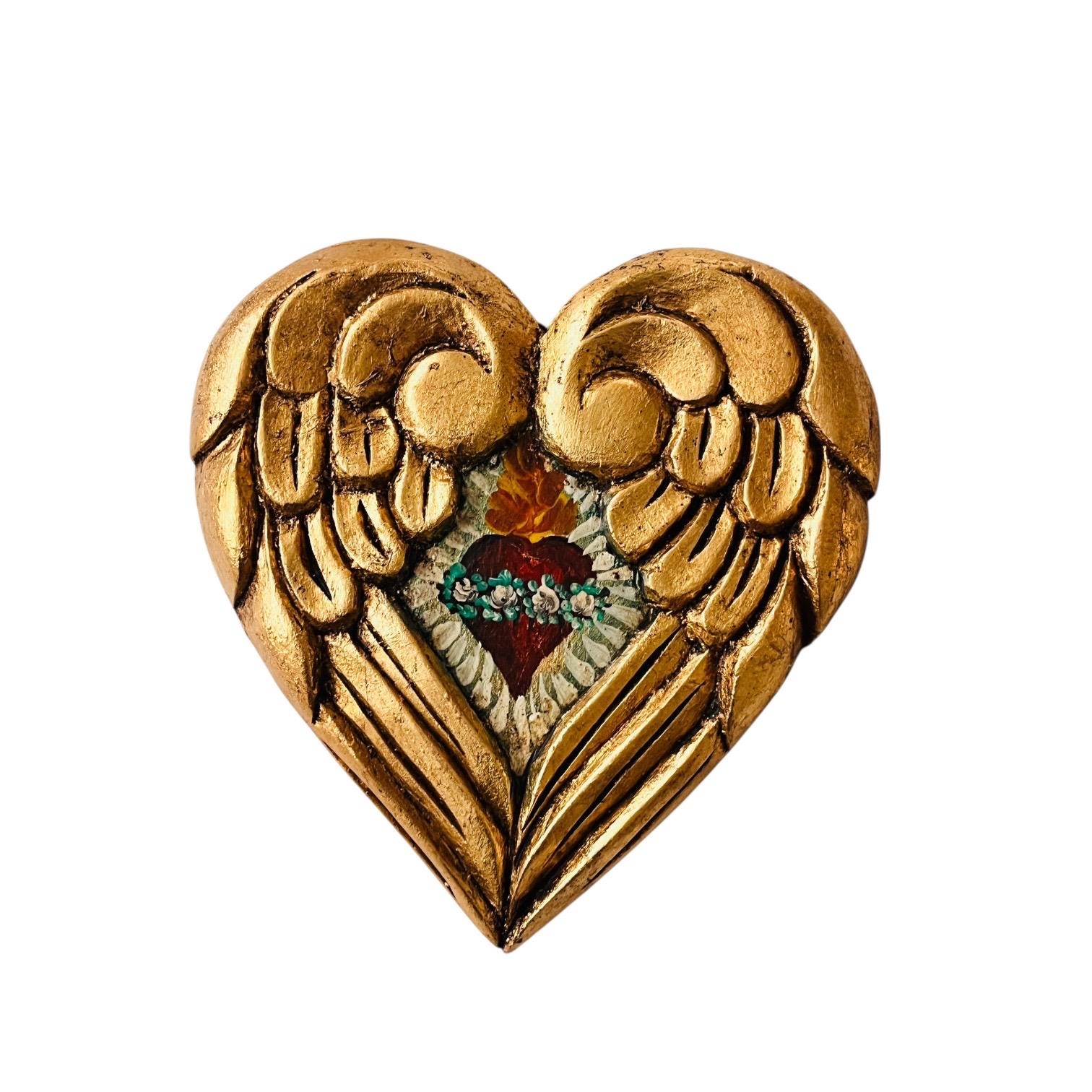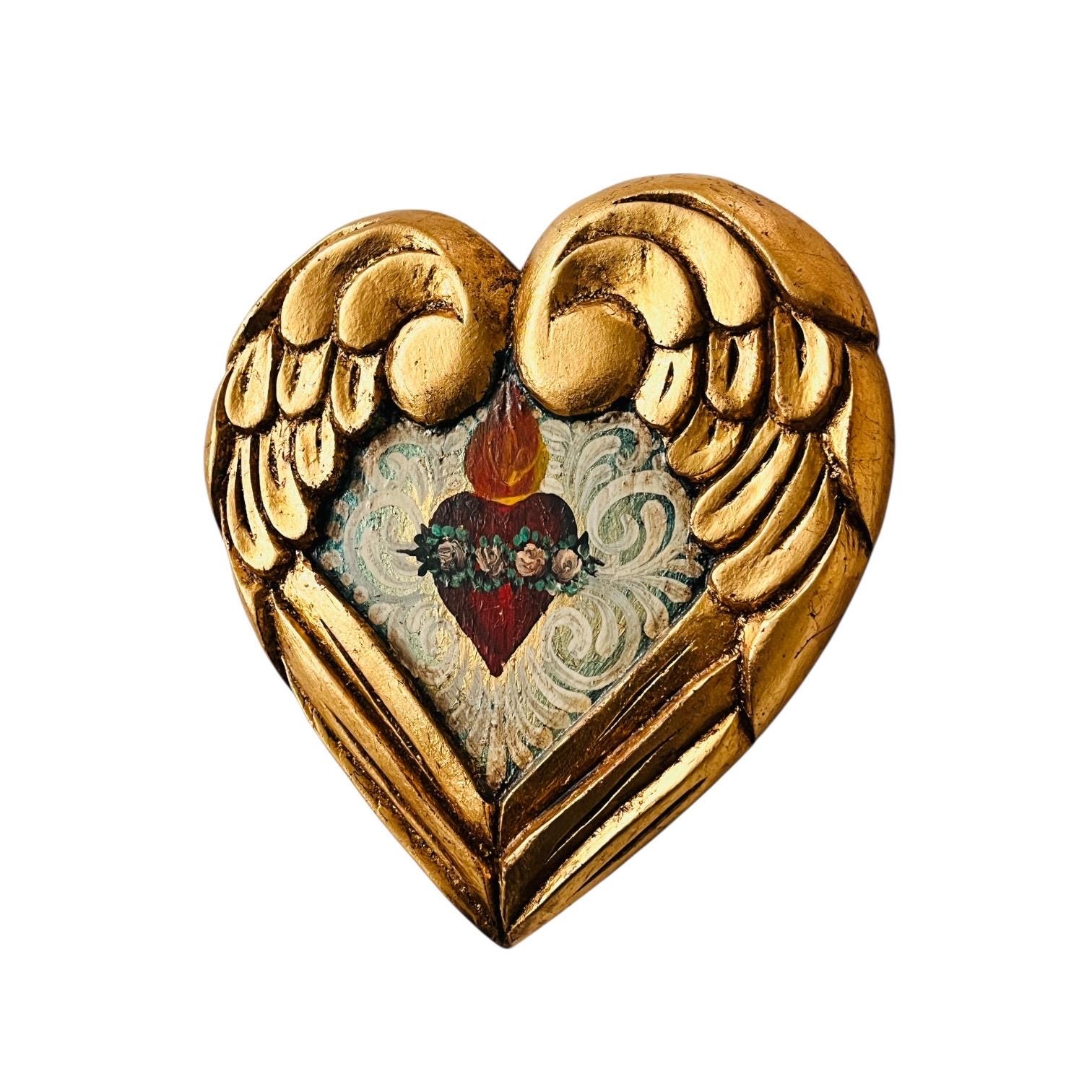 SACRED HEART with Wings, Winged Mexican Corazon. Gold Leaf