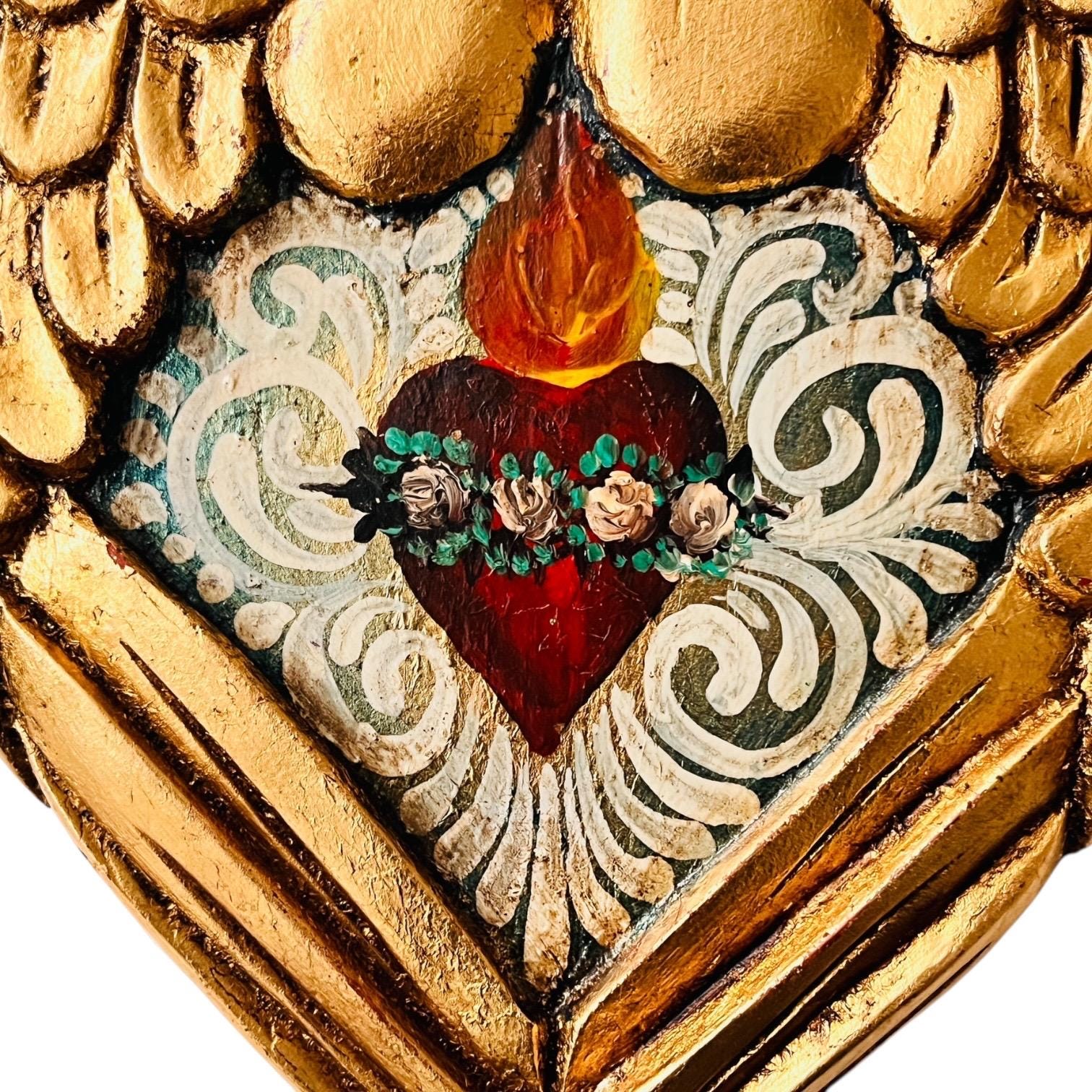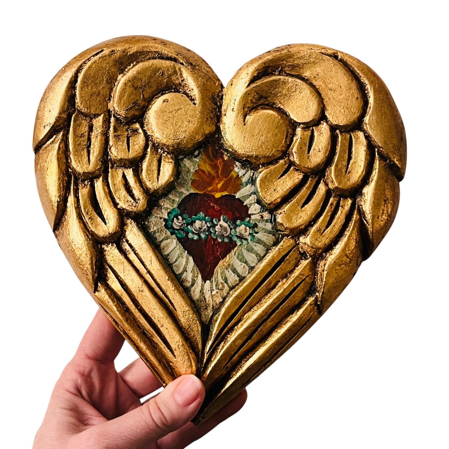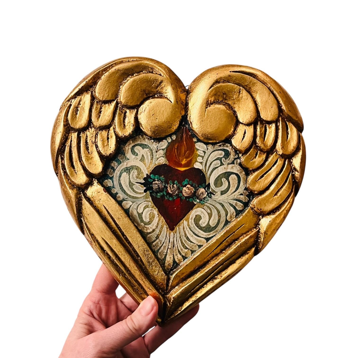 SACRED HEART with Wings, Winged Mexican Corazon. Gold Leaf