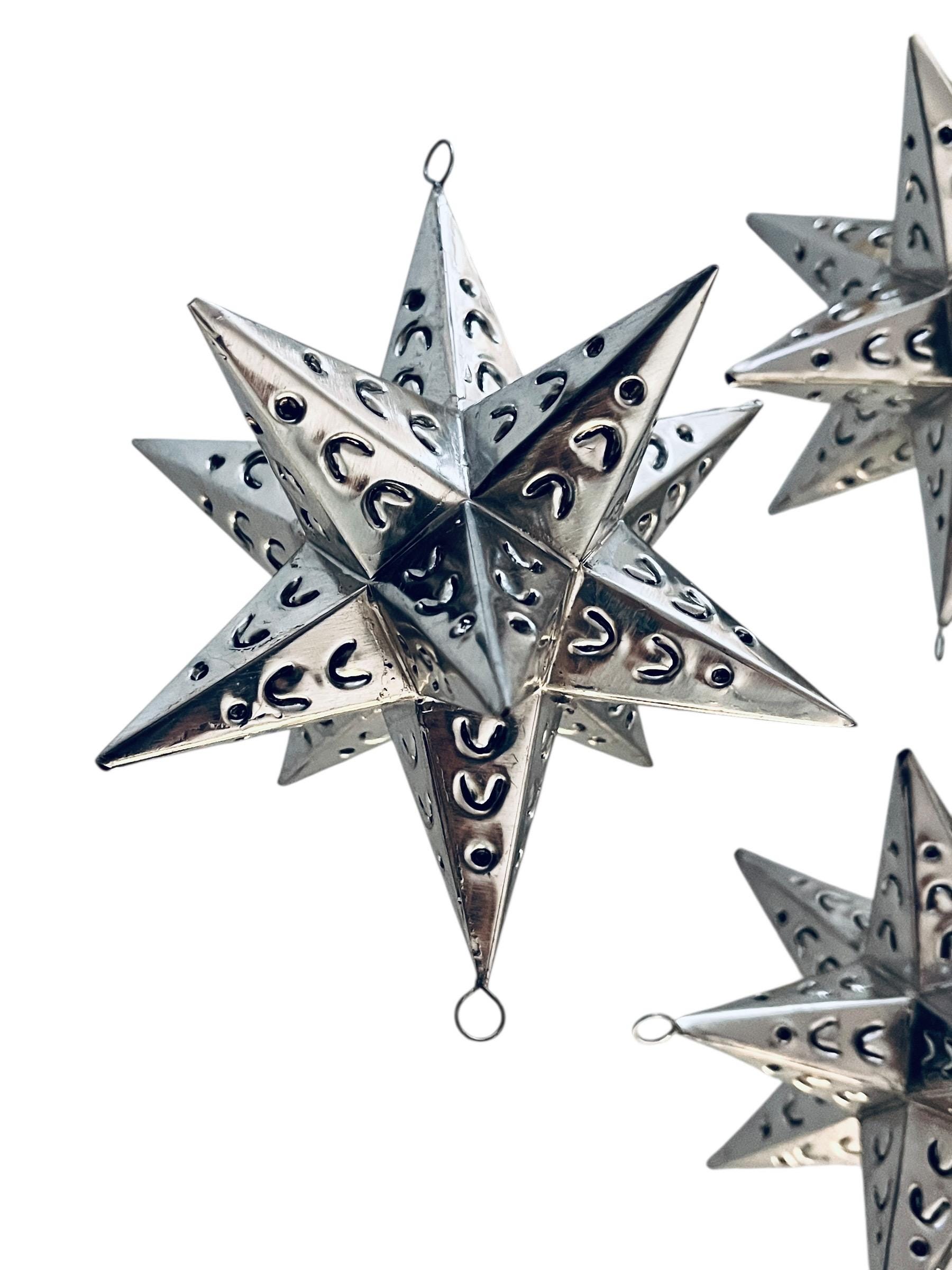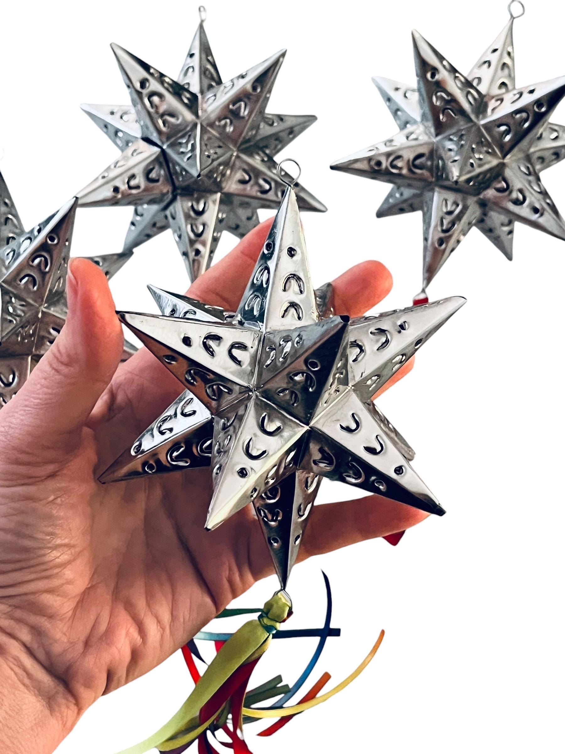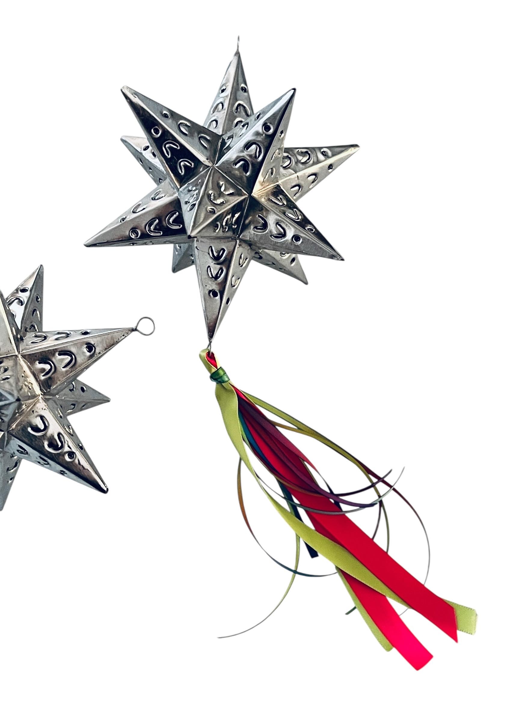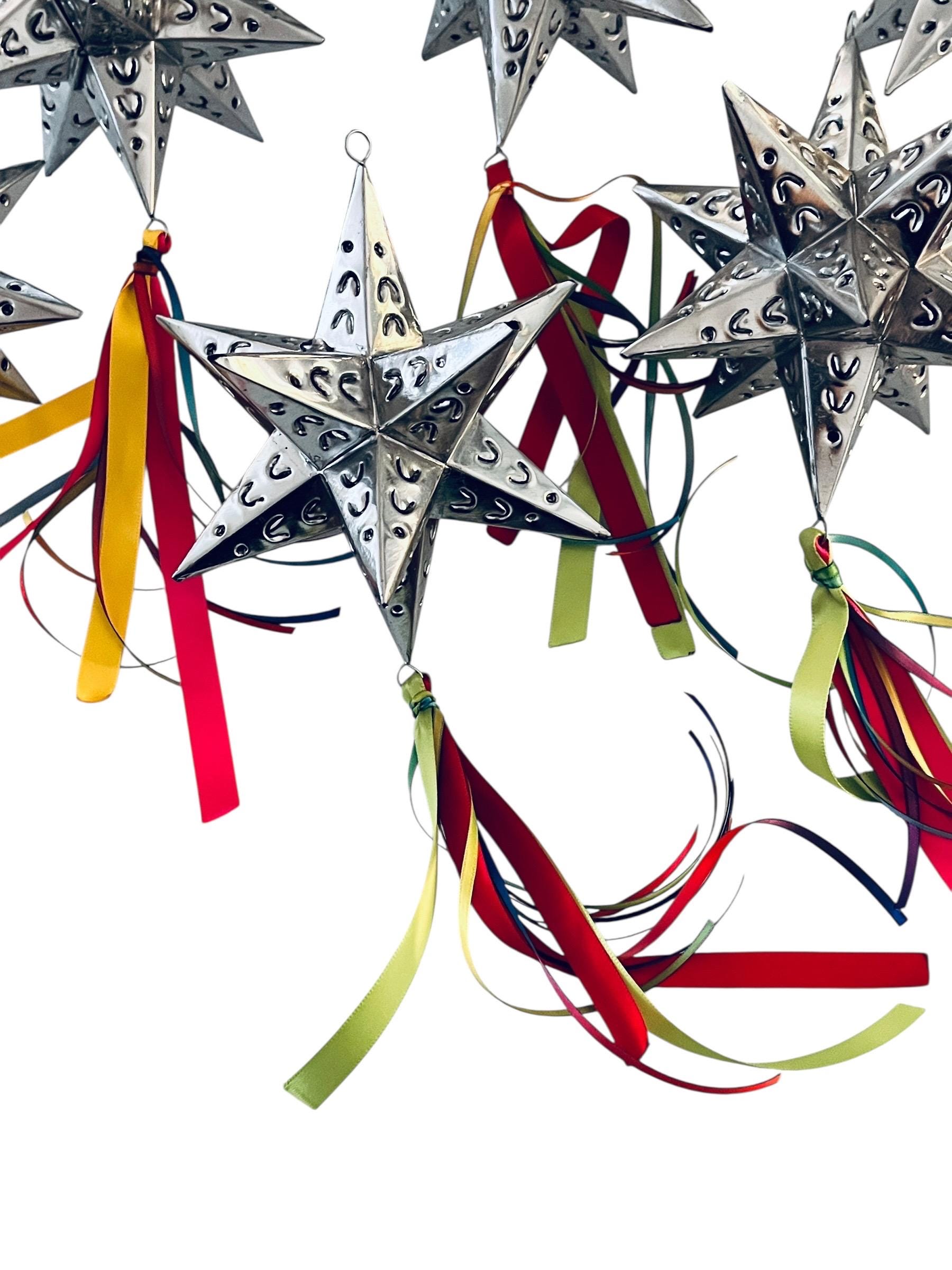 Set of (6) punched tin star ornaments with colorful ribbons.