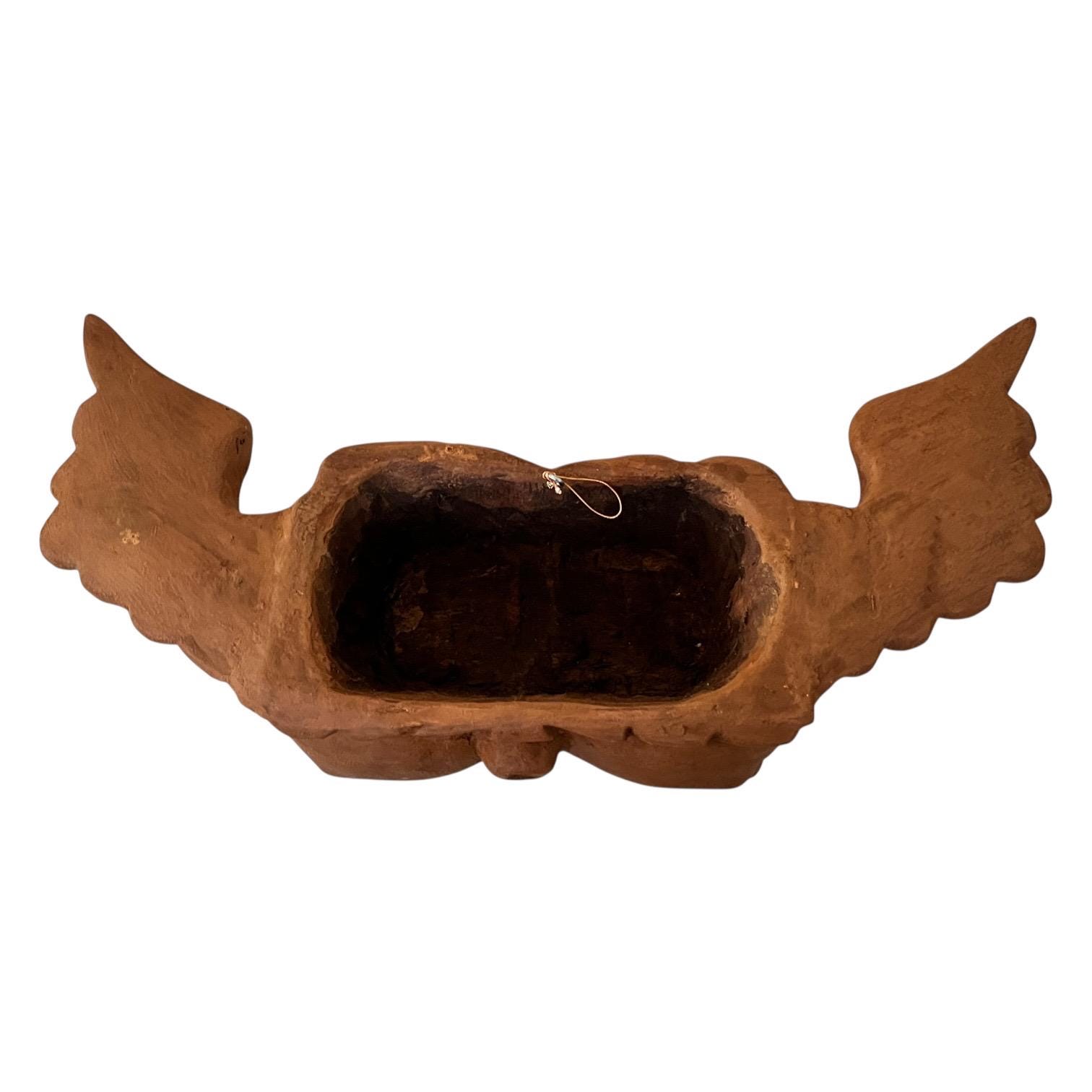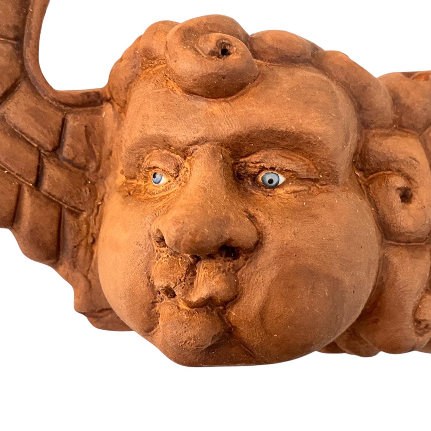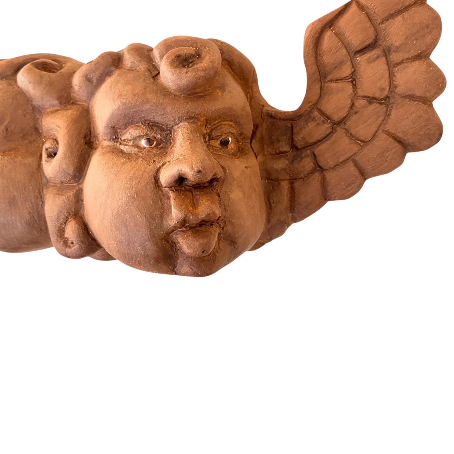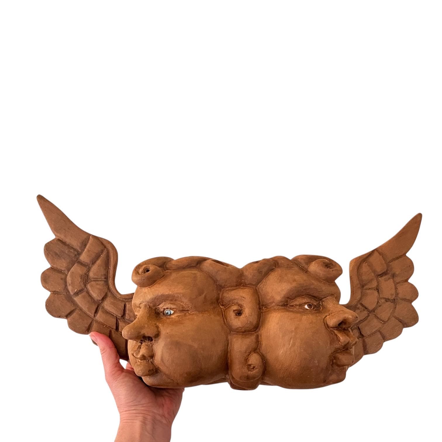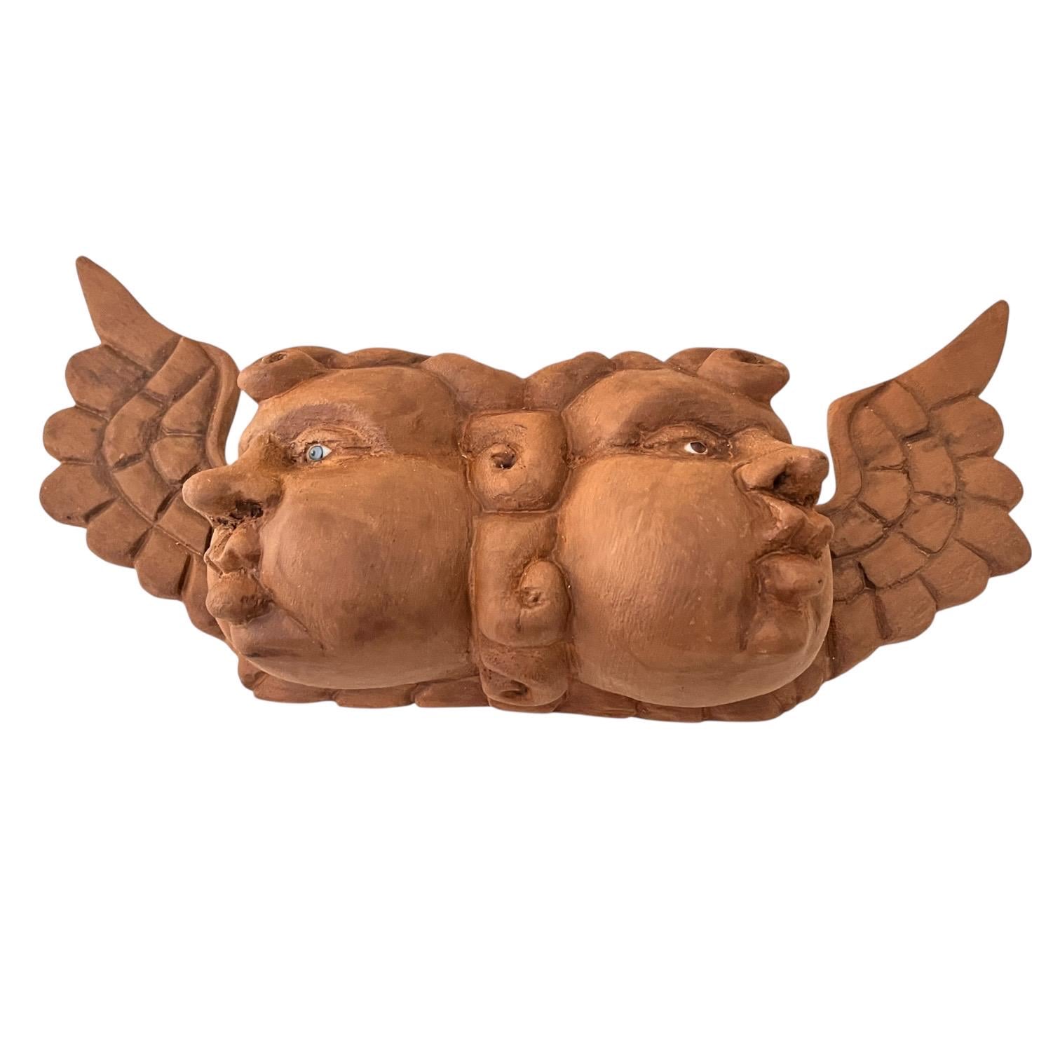 Beautiful carving with two chubby cheek cherubs with puckered lips and brown and blue glass eyes.