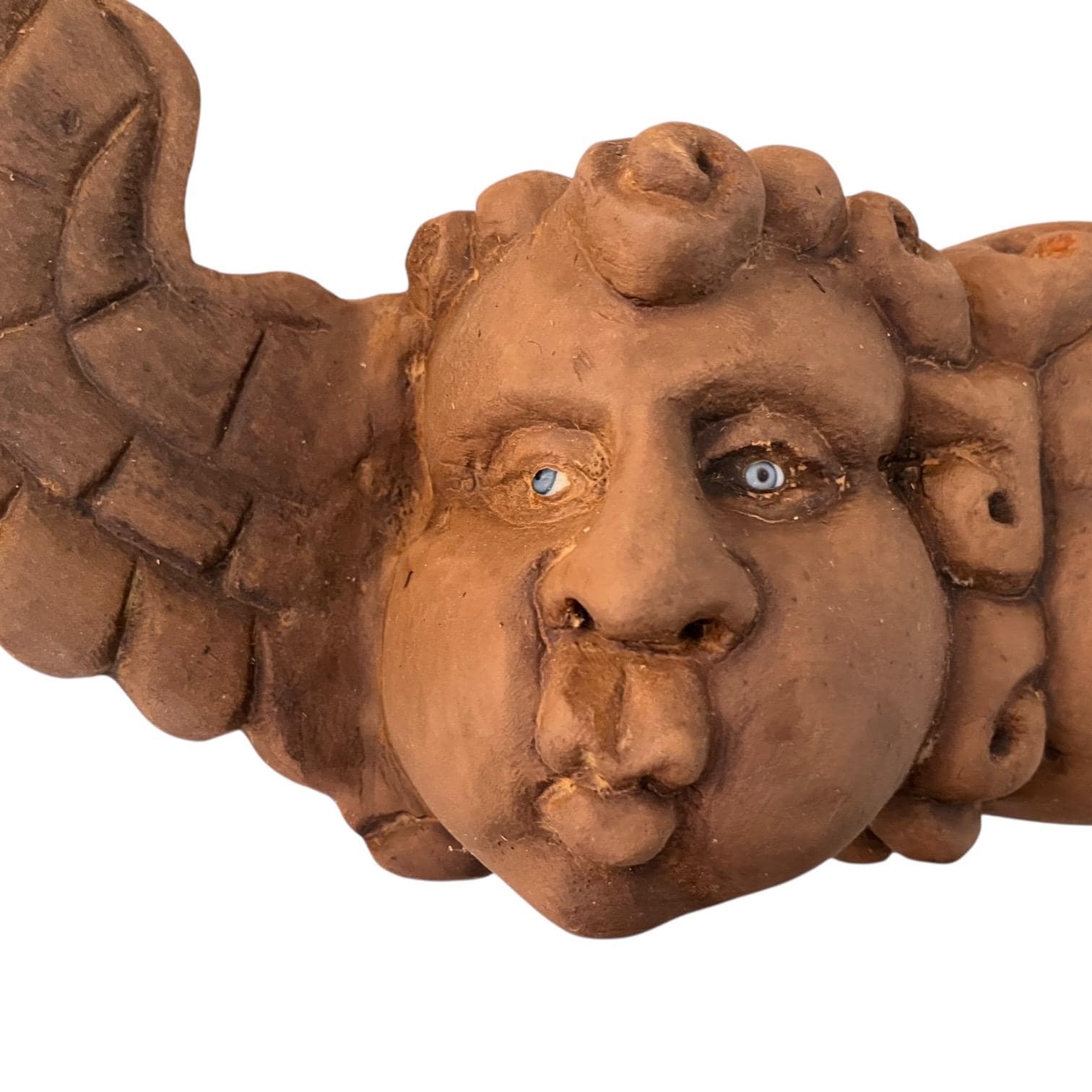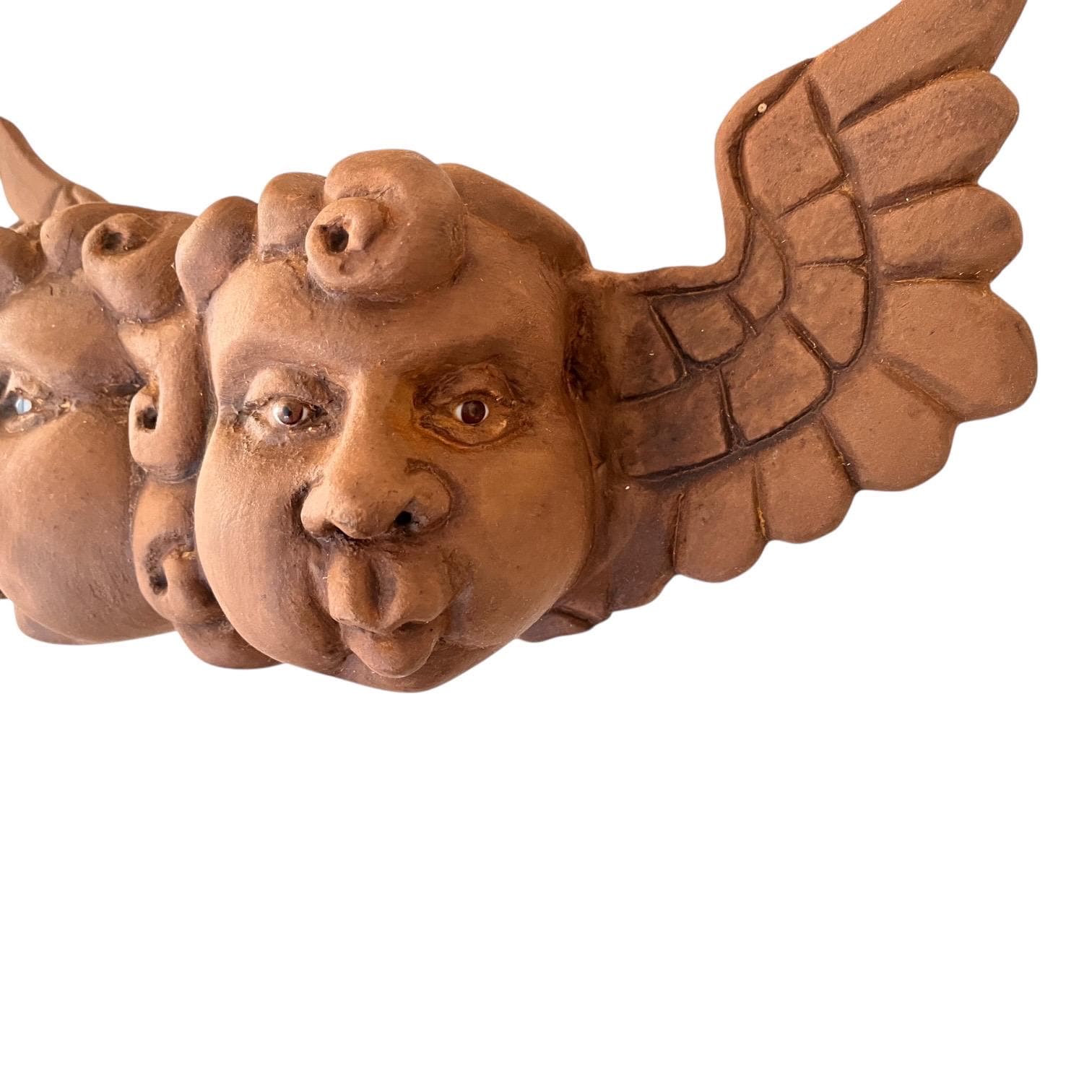 Beautiful carving with two chubby cheek cherubs with puckered lips and brown and blue glass eyes.