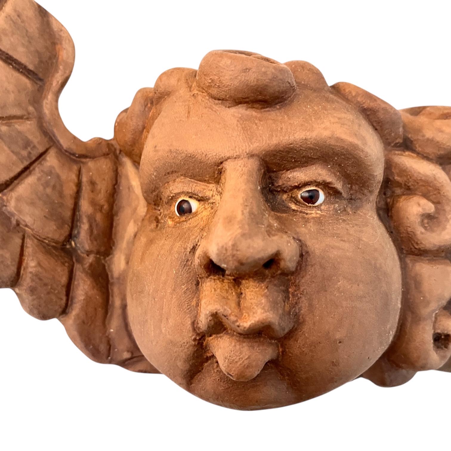Beautiful carving with two chubby cheek cherubs with puckered lips and brown and blue glass eyes.