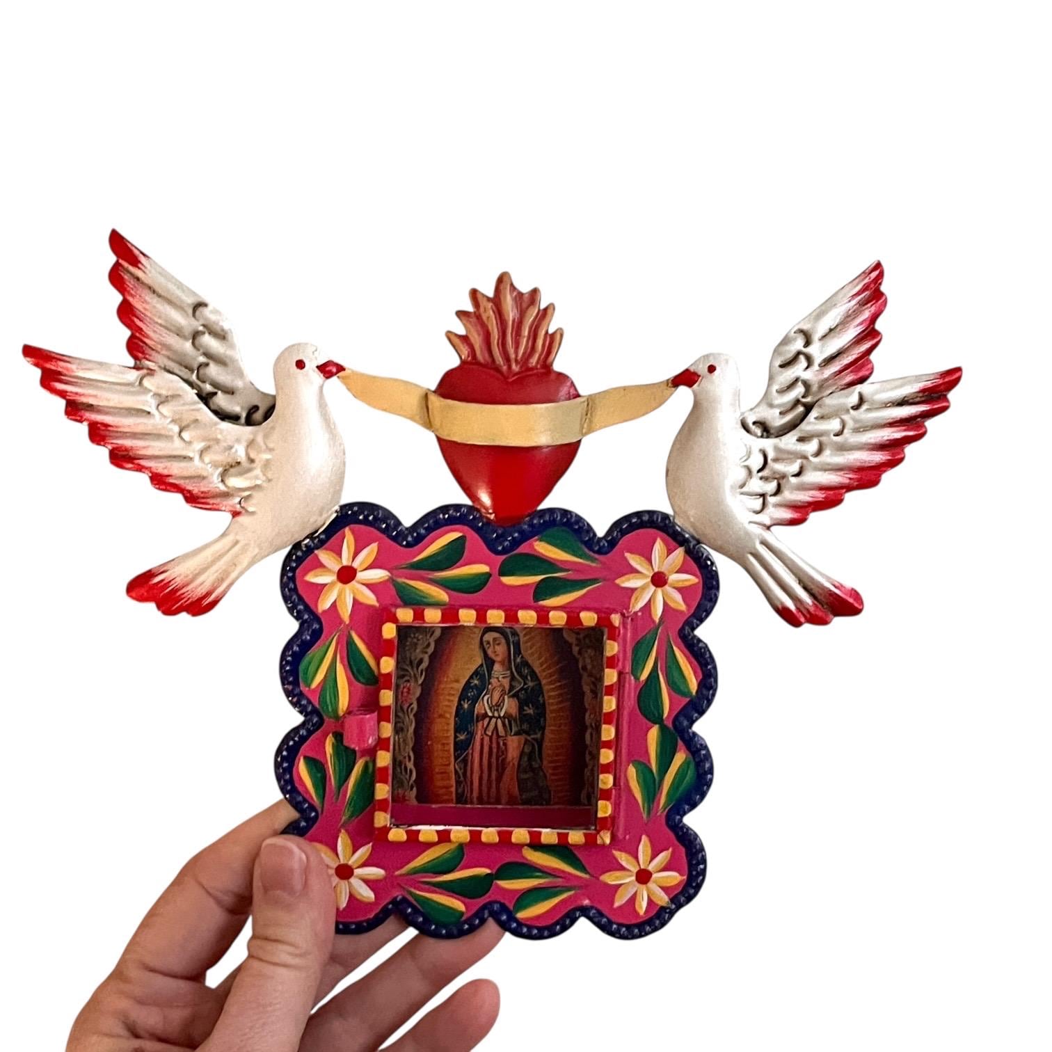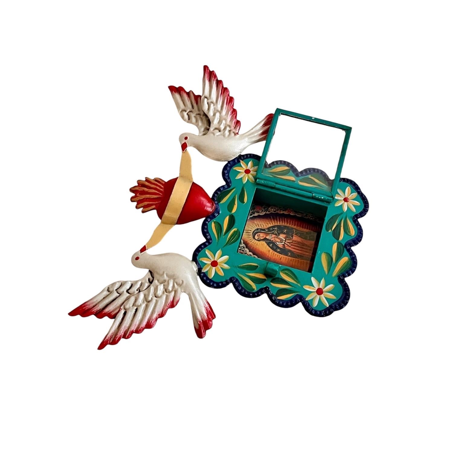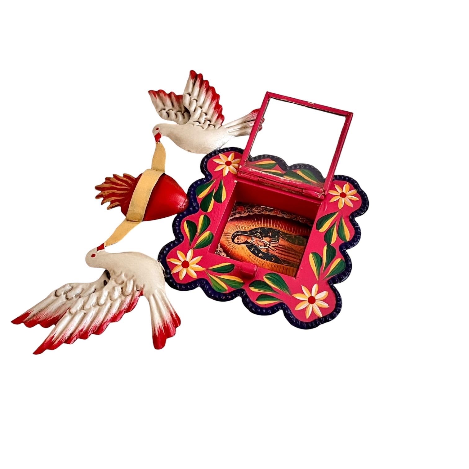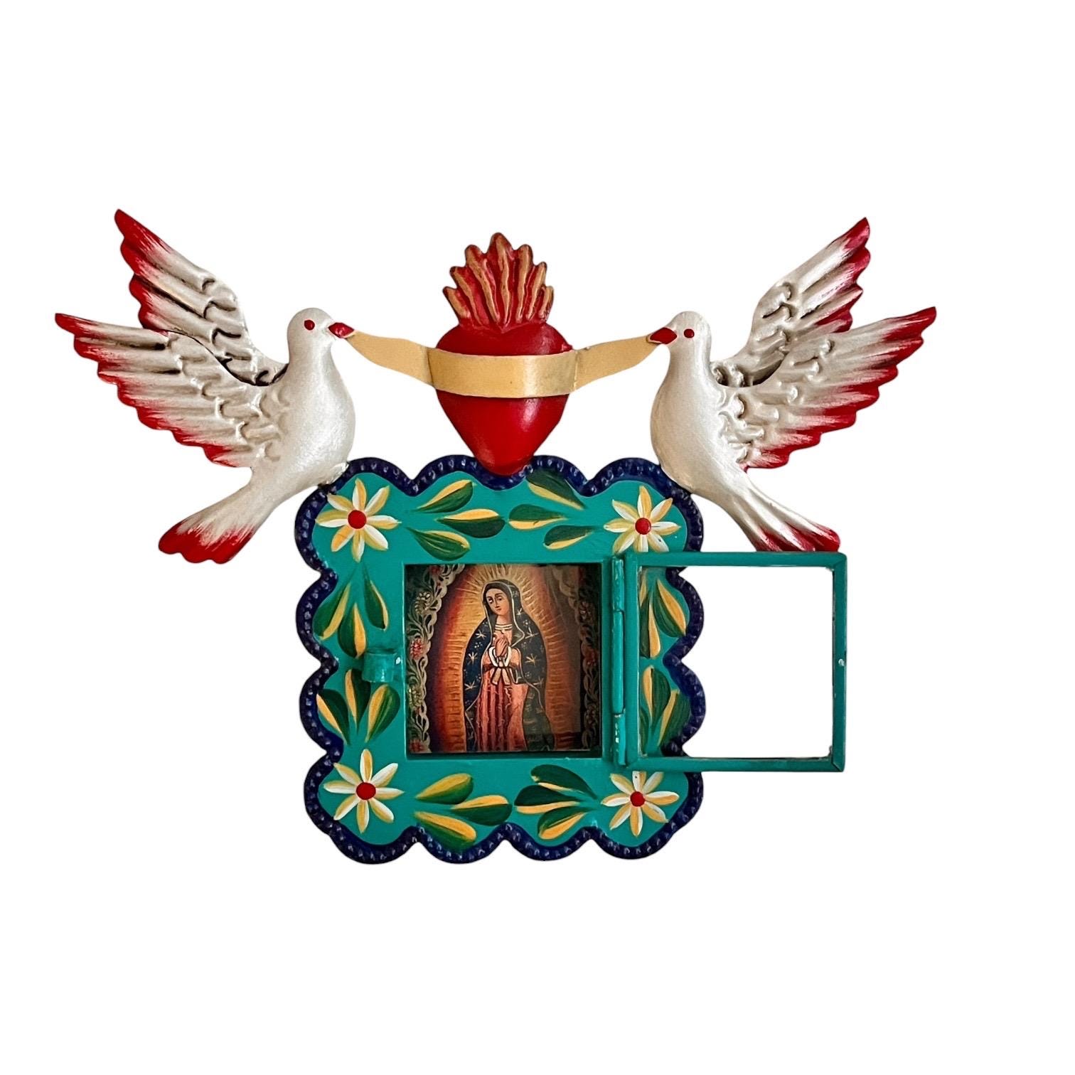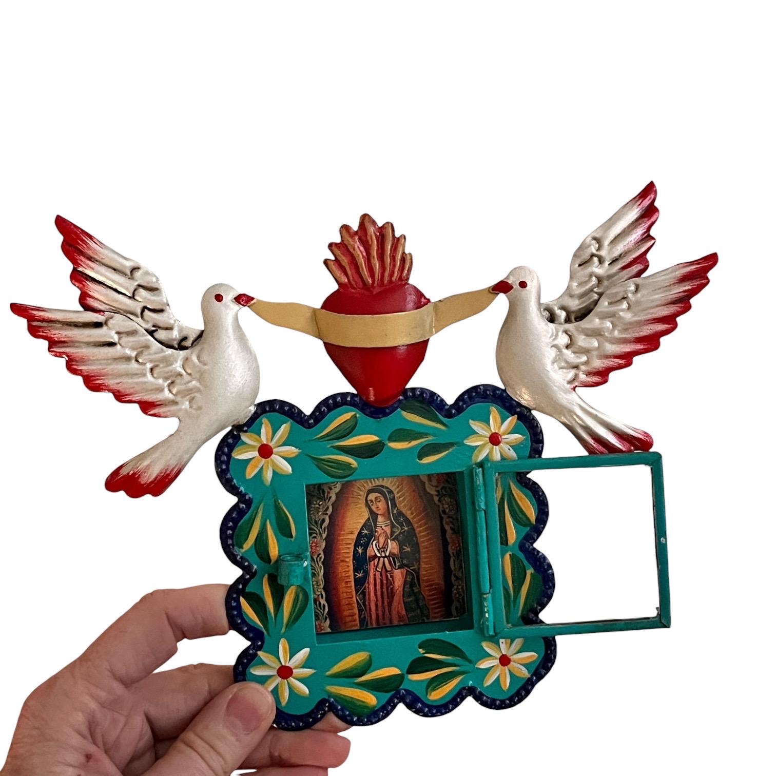 Hinged glass door opens to an image of the Virgin Guadalupe. The image is loose and can be removed if you’d like to add your own photo!