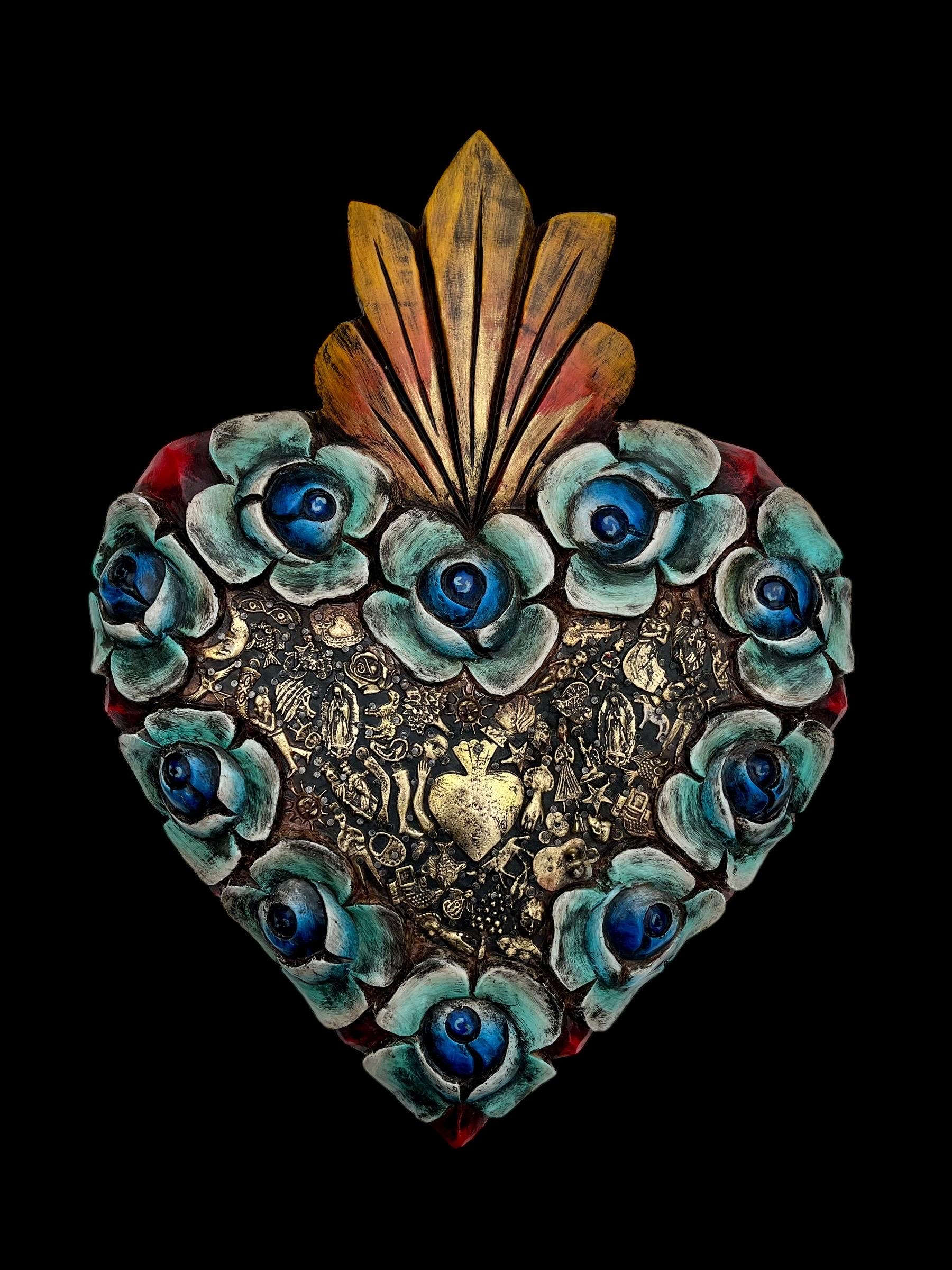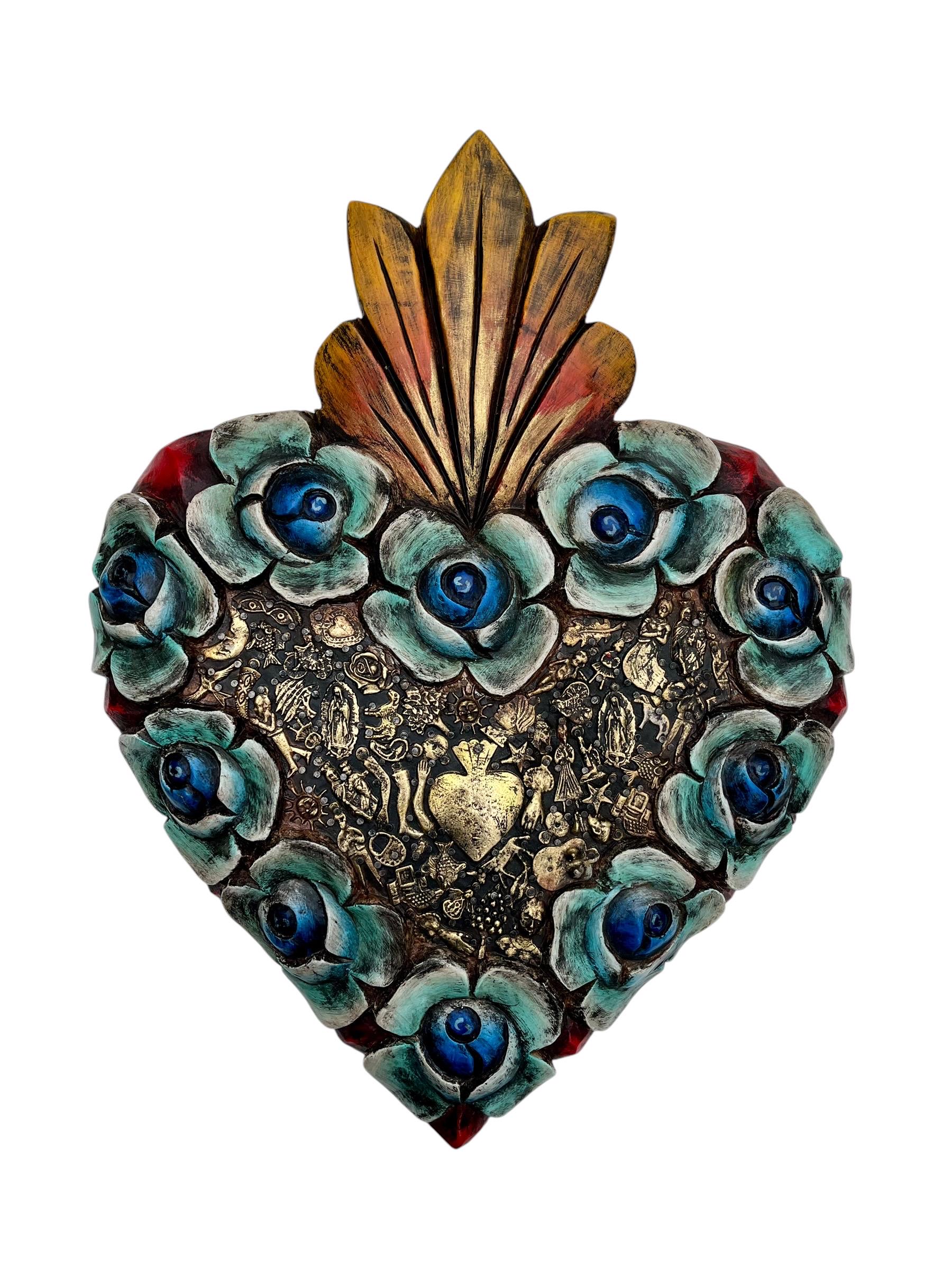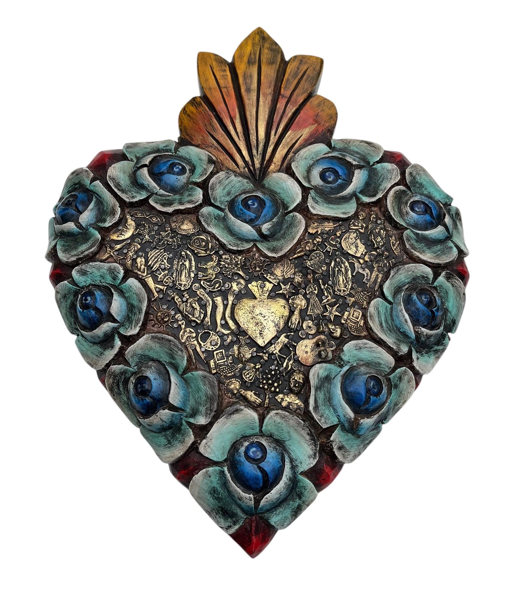Beautiful wood heart with carved roses adorned with dozens of antiqued Milagro charms.