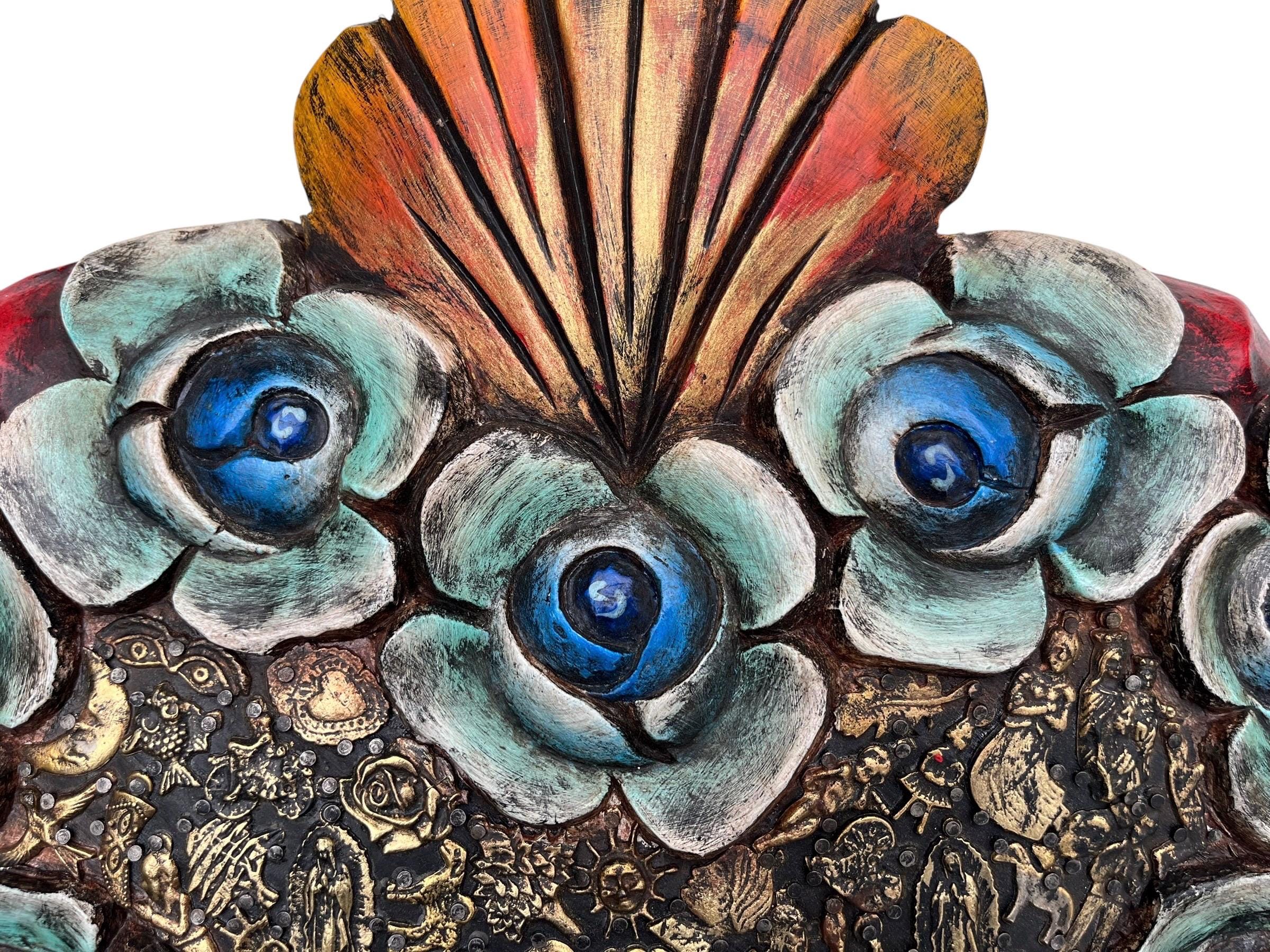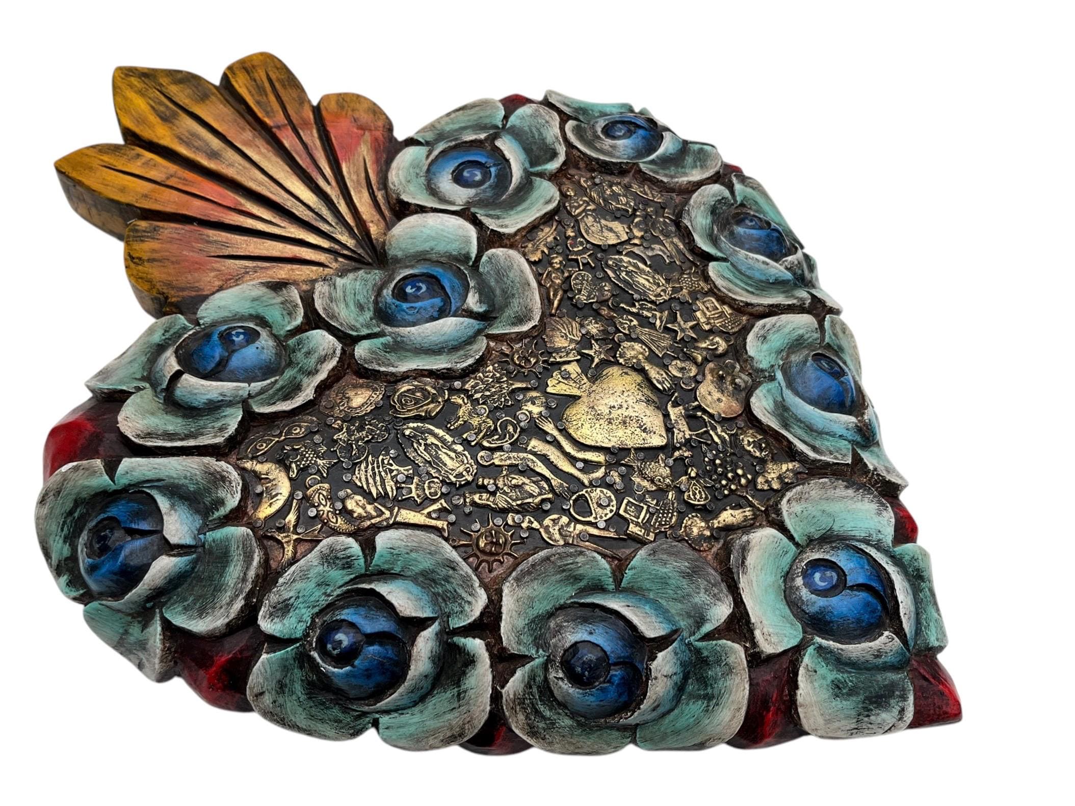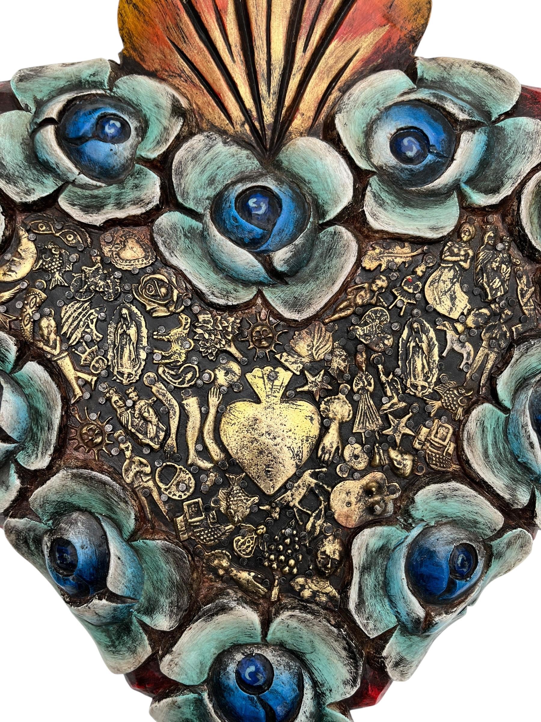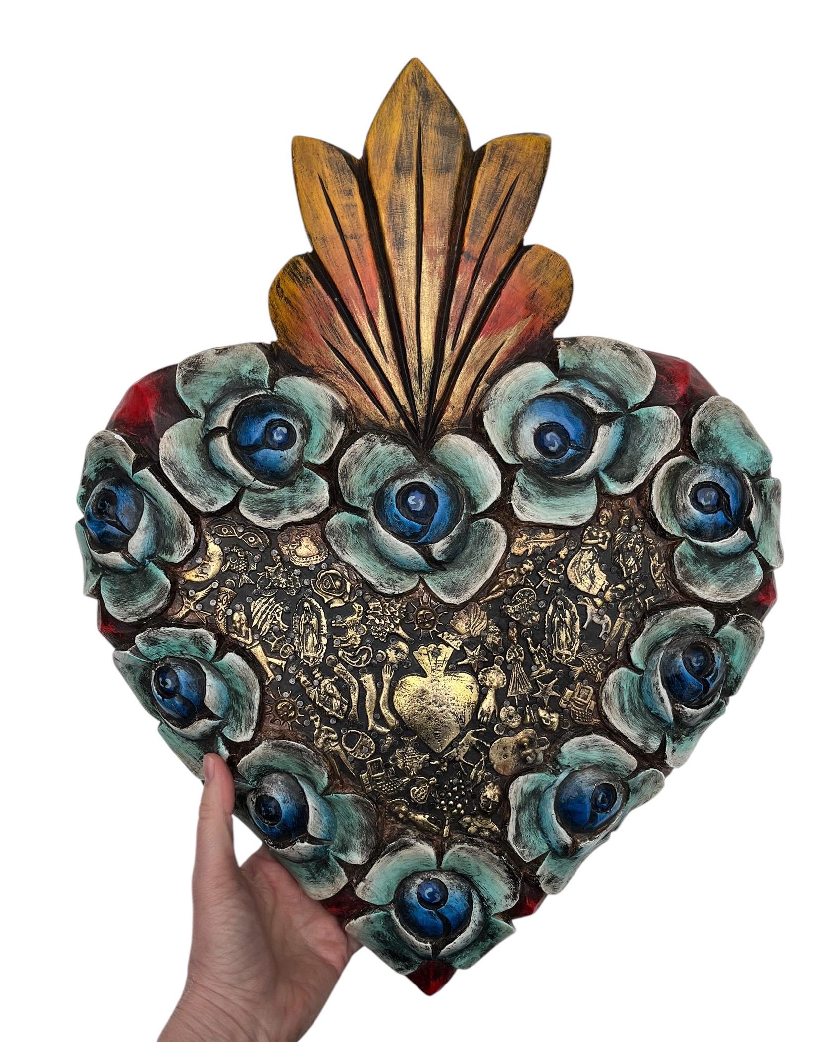 Beautiful wood heart with carved roses adorned with dozens of antiqued Milagro charms.