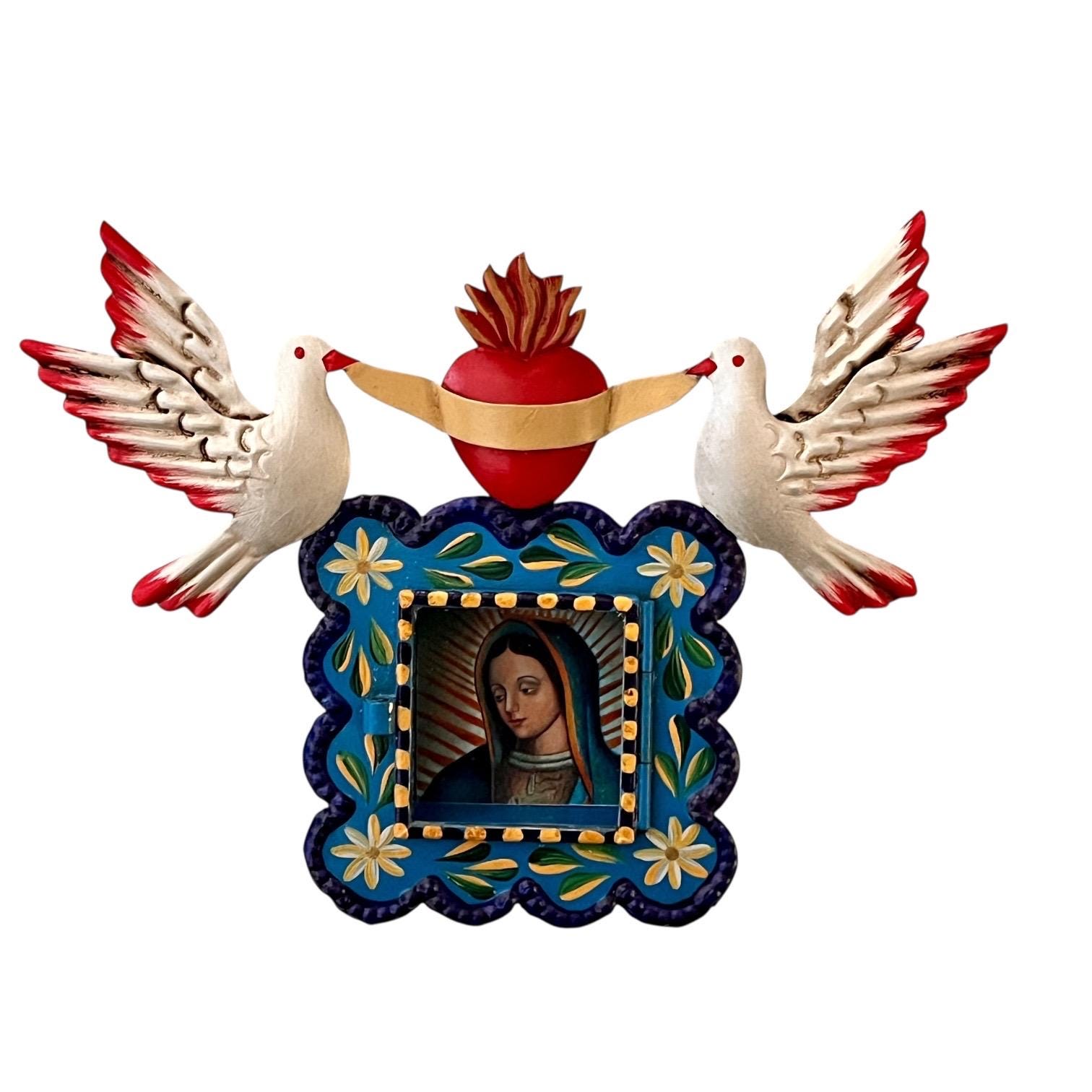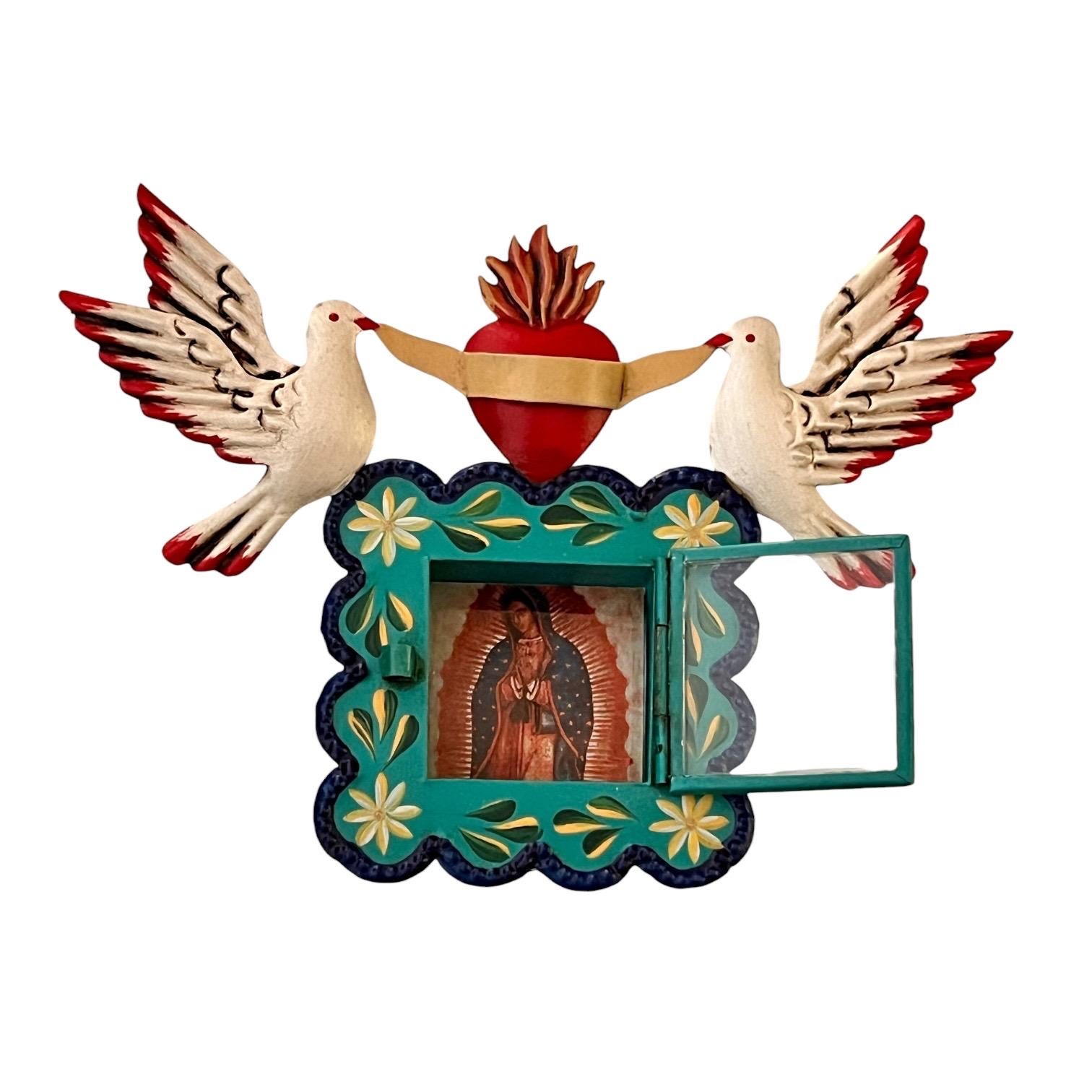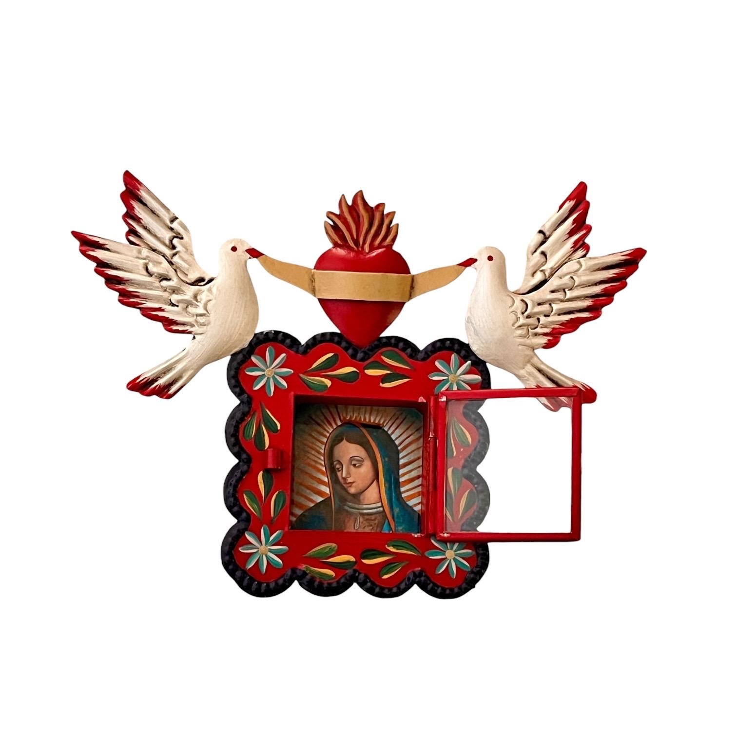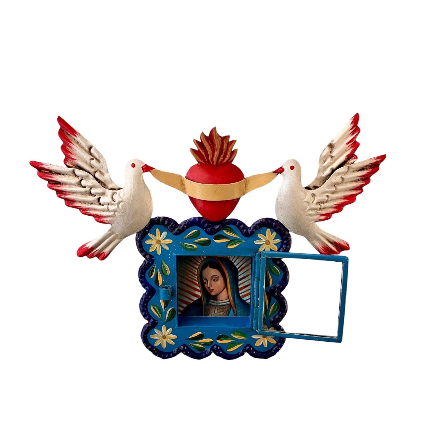 Hinged glass door opens to an image of the Virgin Guadalupe. The image is loose and can be removed if you’d like to add your own photo!