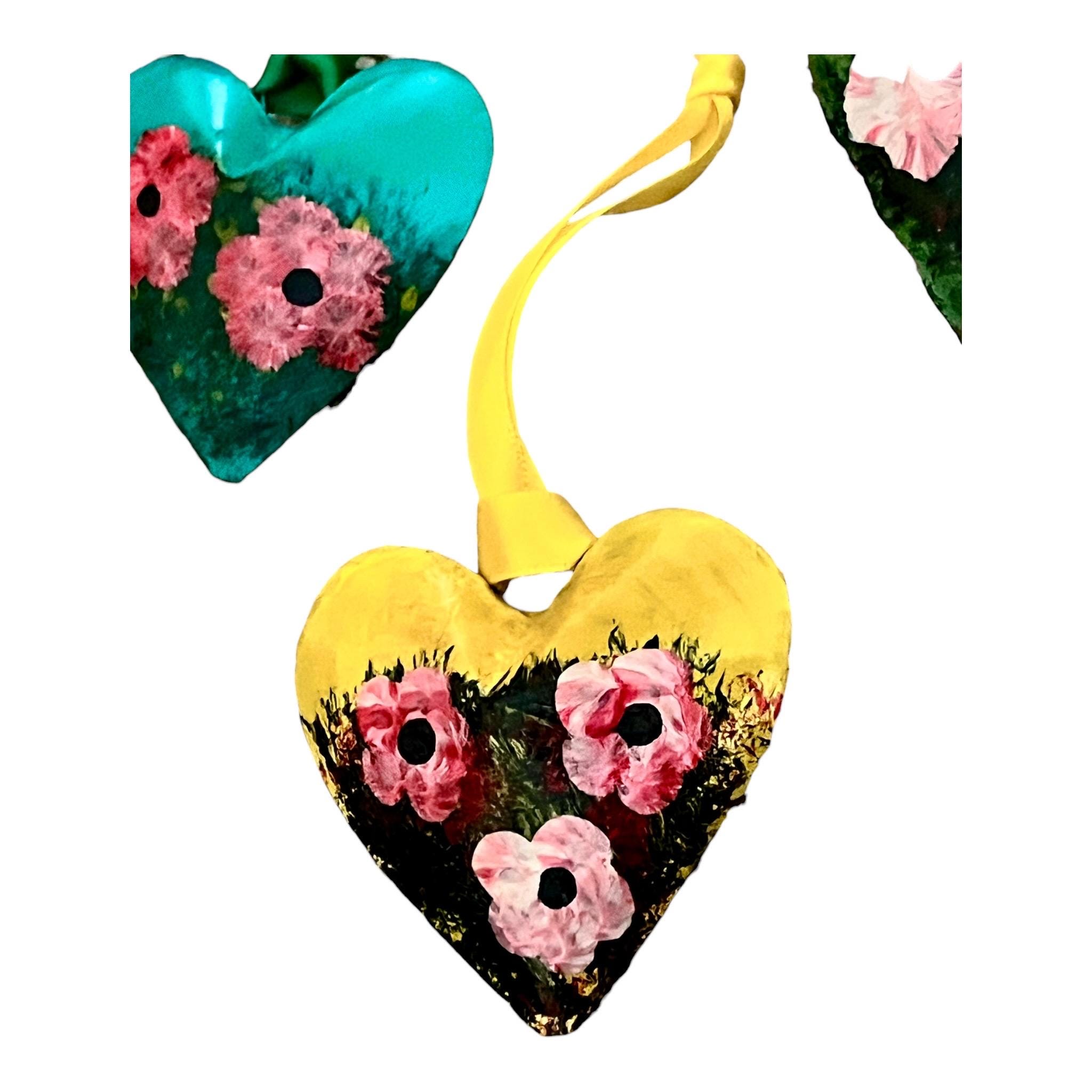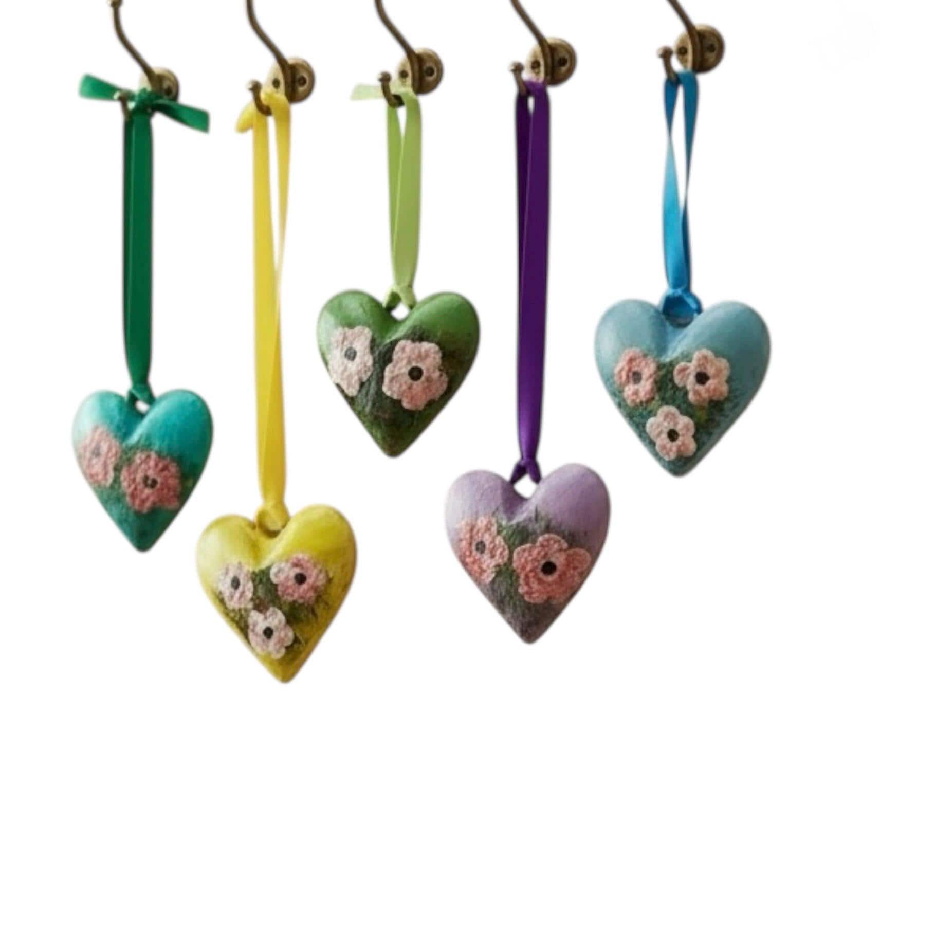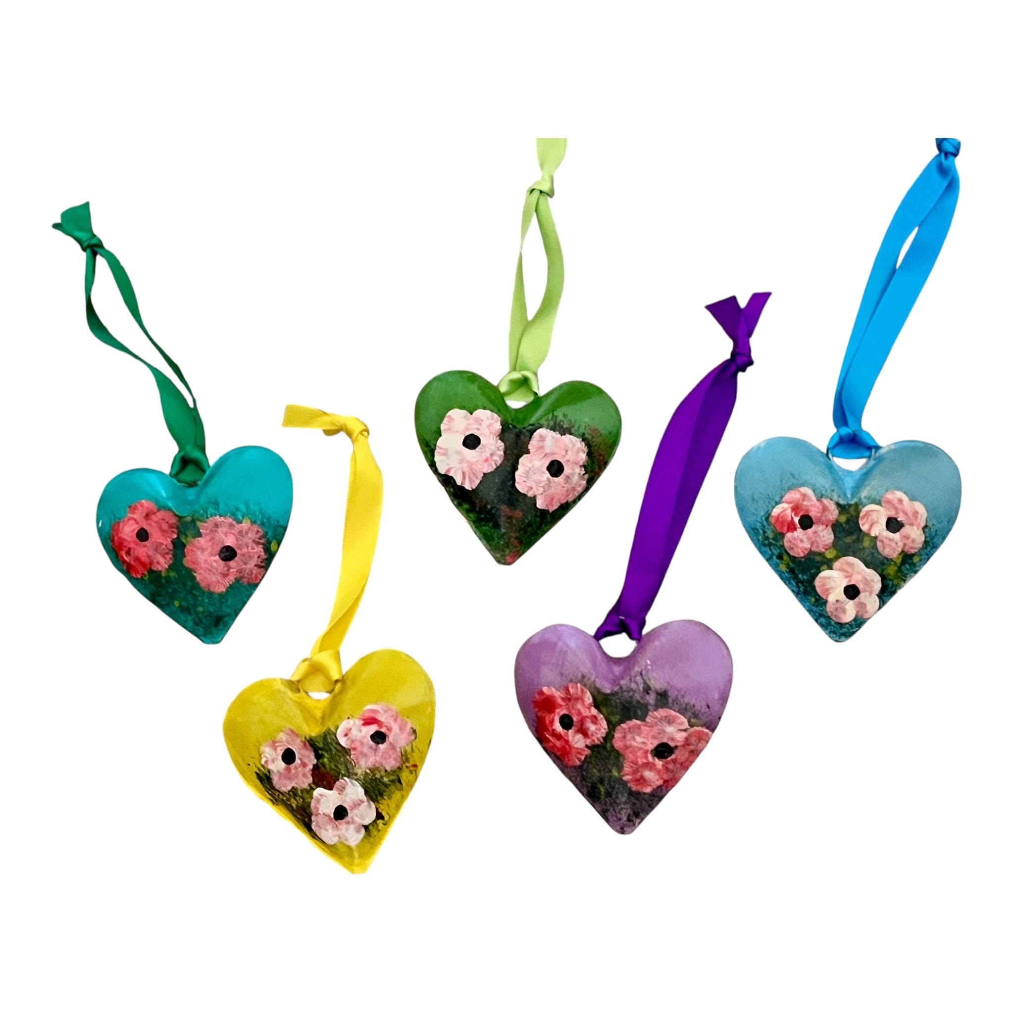 SET (5) colorful painted heart ornaments. Puffy heart is painted with a flower design on both sides.