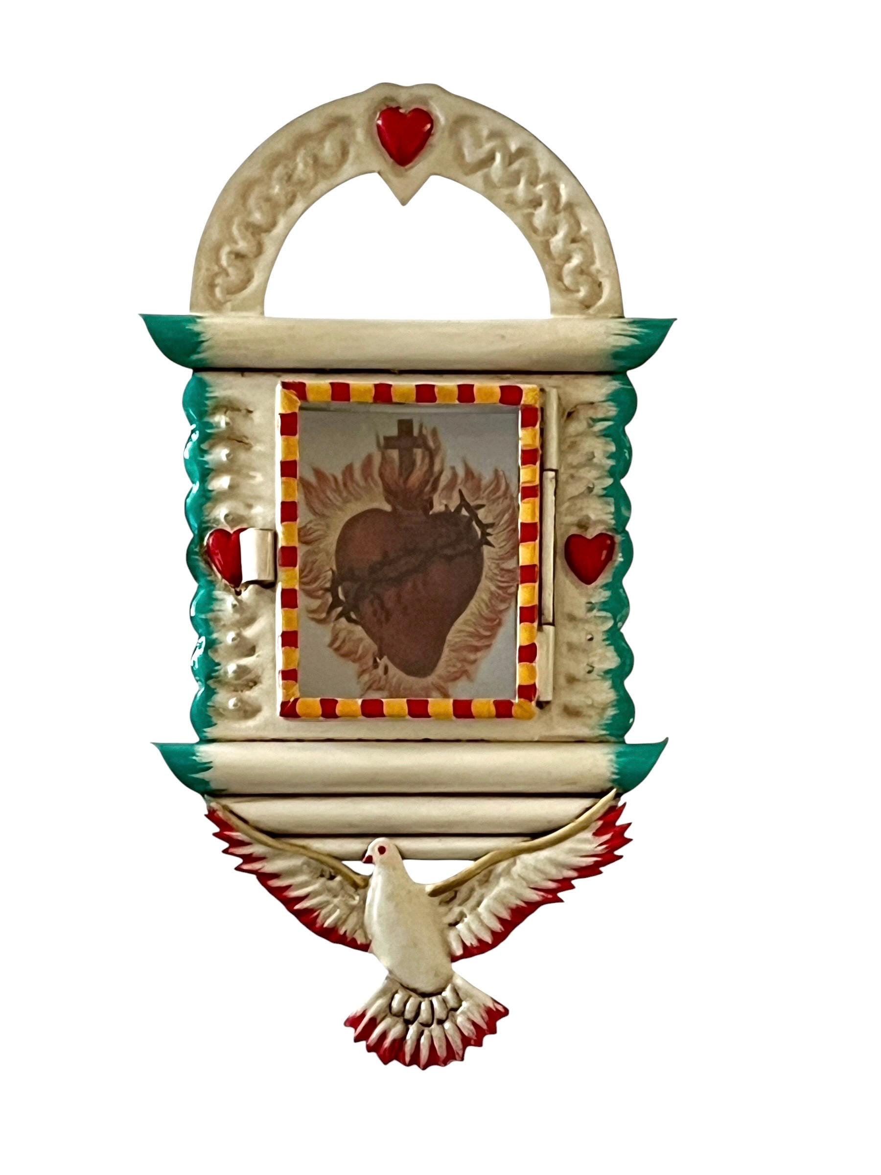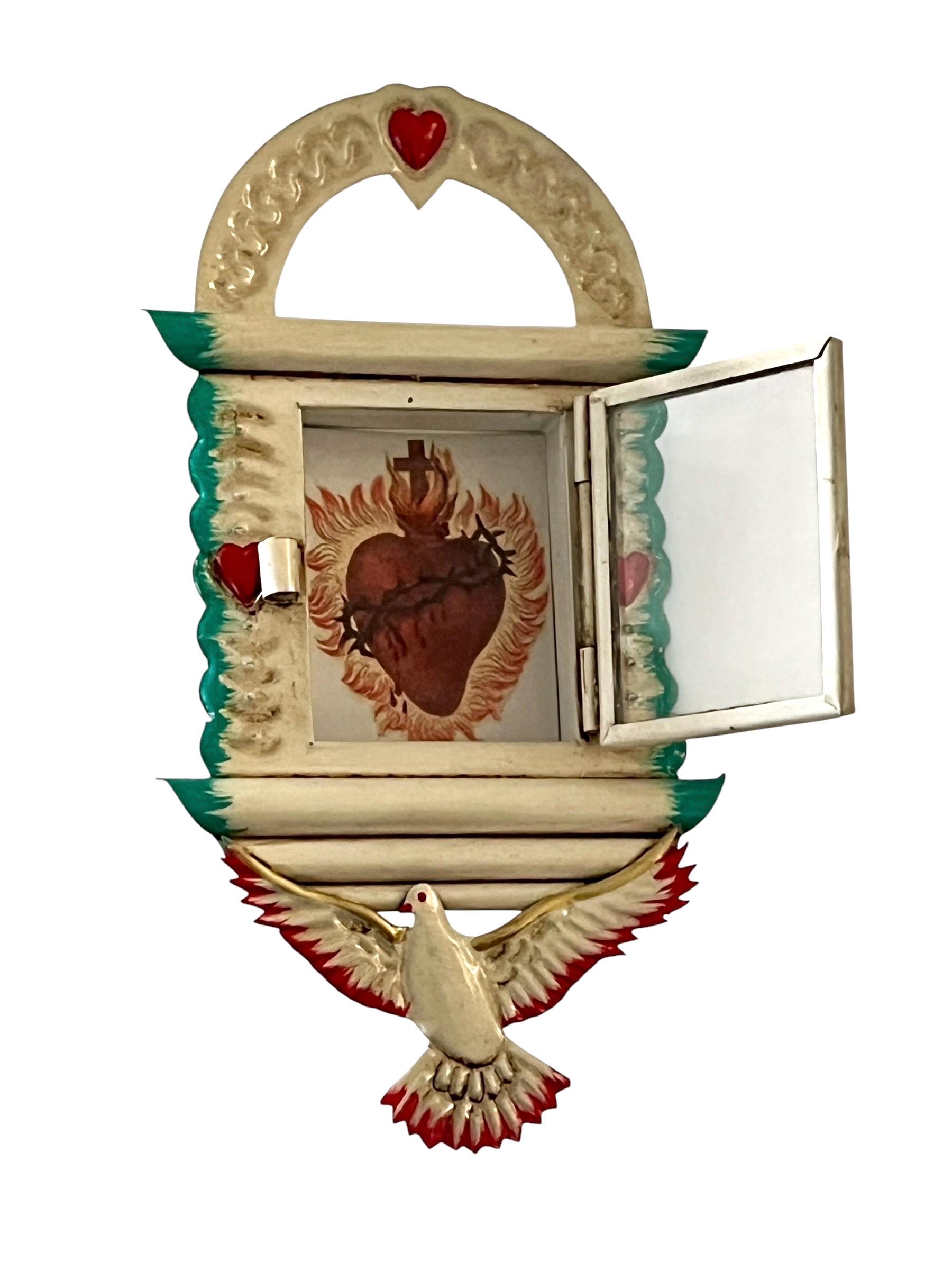 There is a hinged glass door that opens to a small frame with an image of a Sacred Heart. The image is loose and can be removed to add your own image/photo or small trinket.
