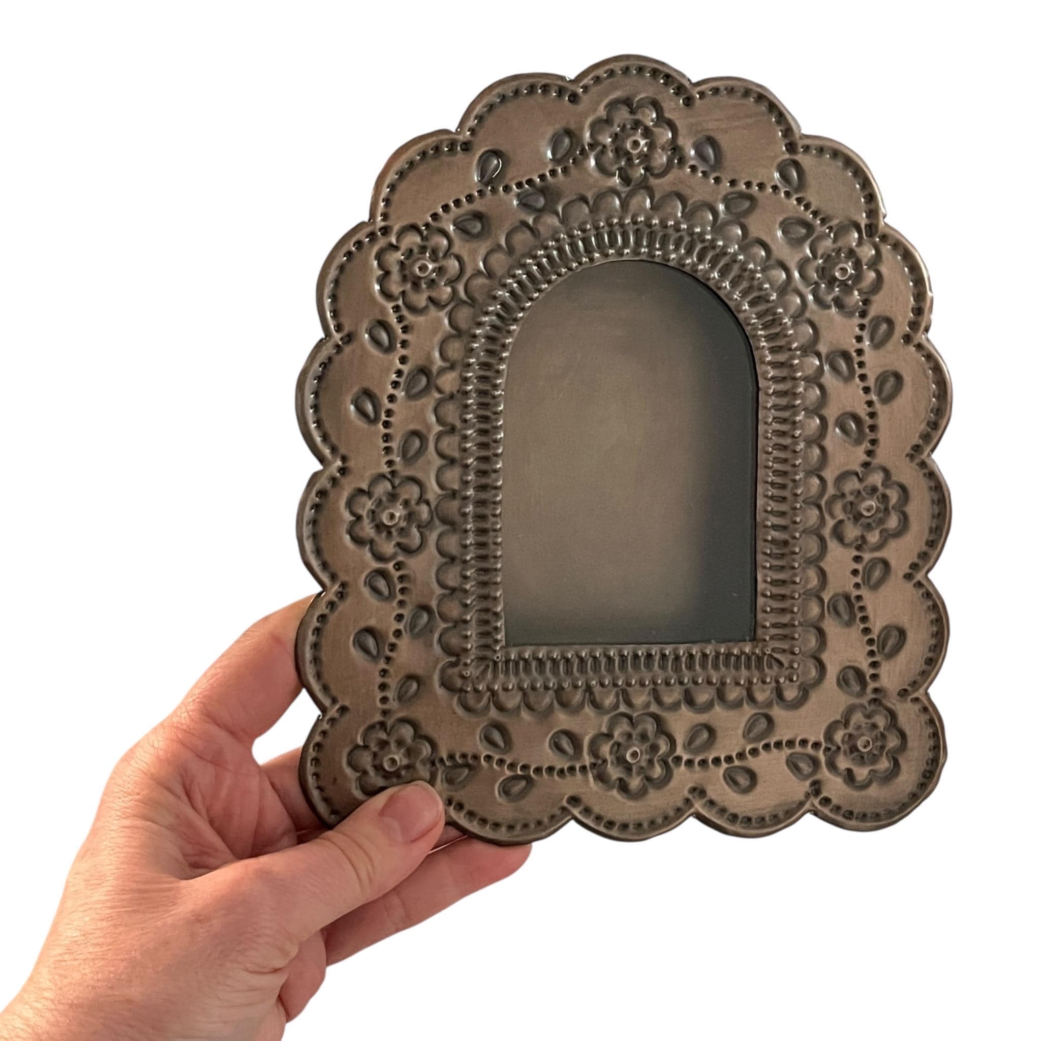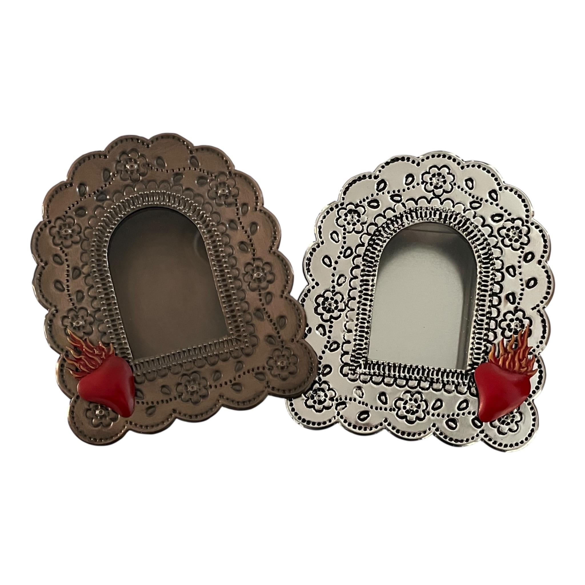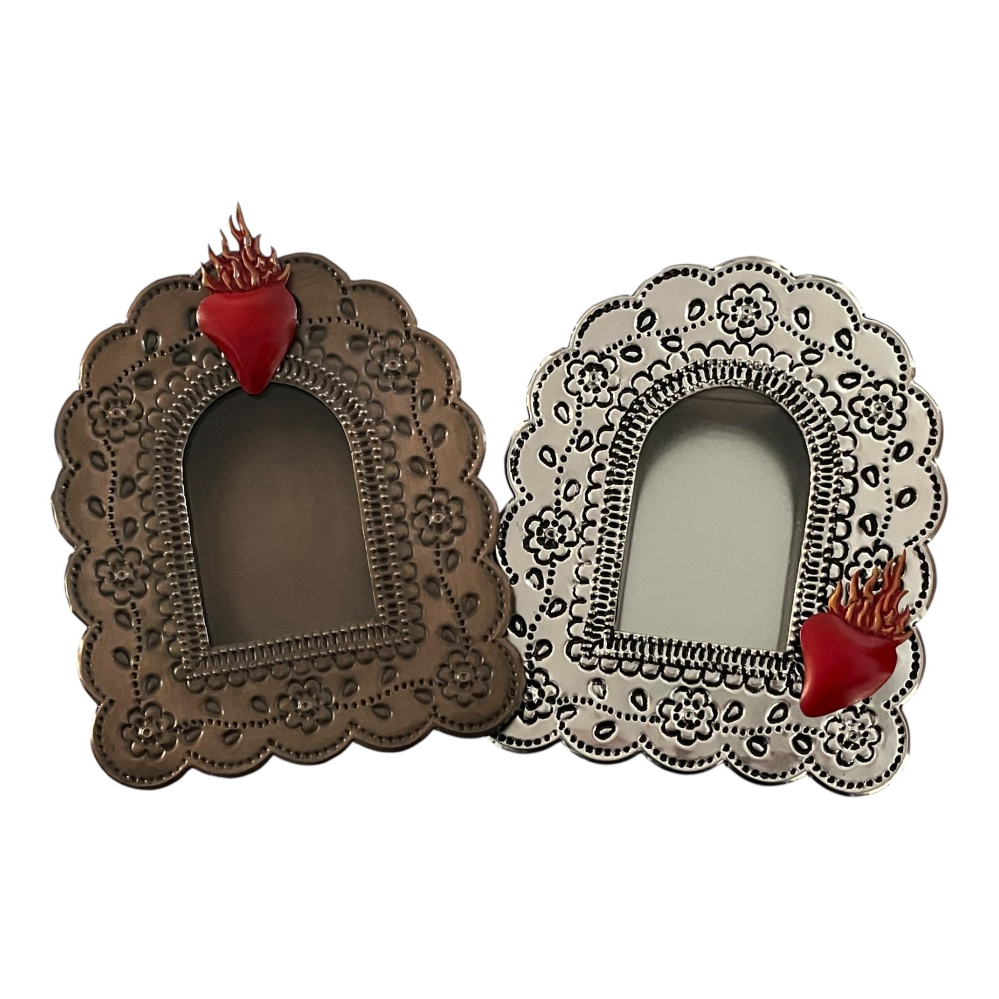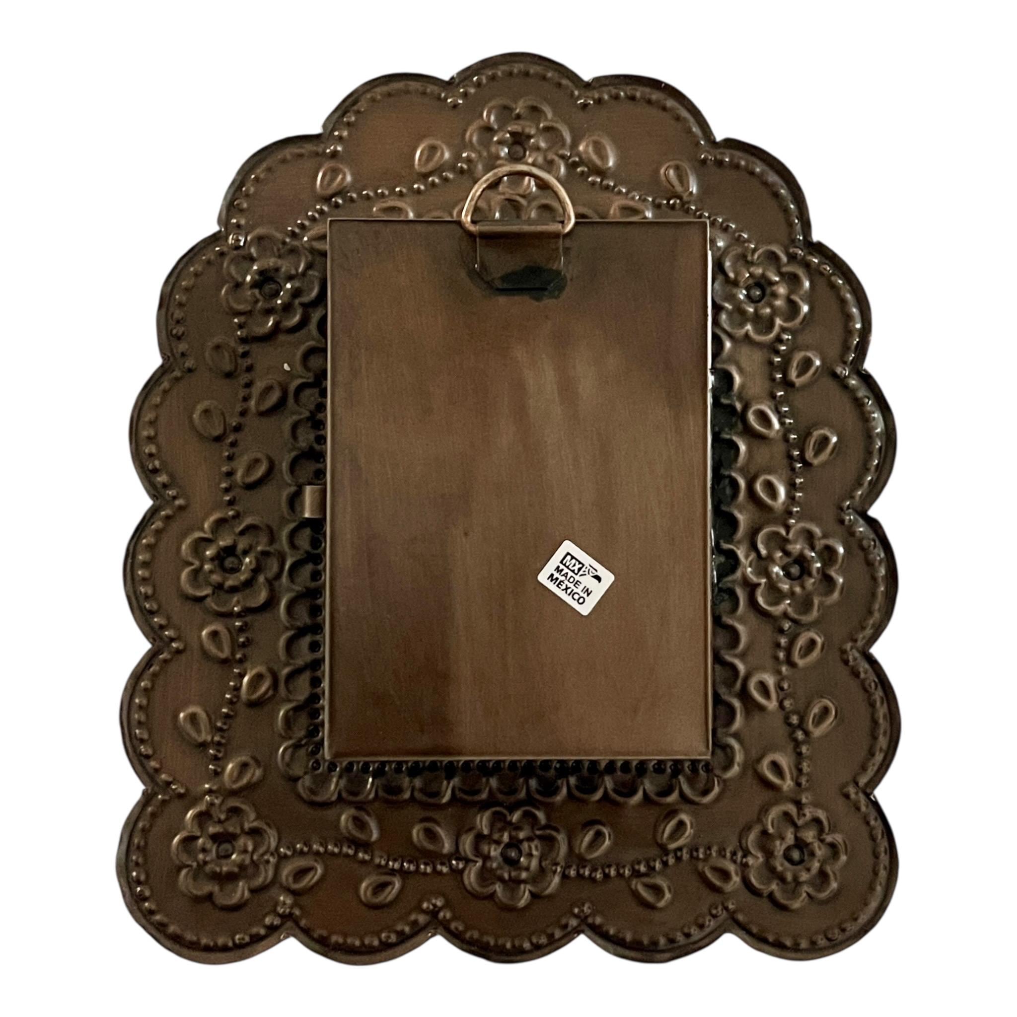 Arched tin nicho frame with pretty floral design and scalloped edge. There is an optional small tin Sacred heart magnet.
