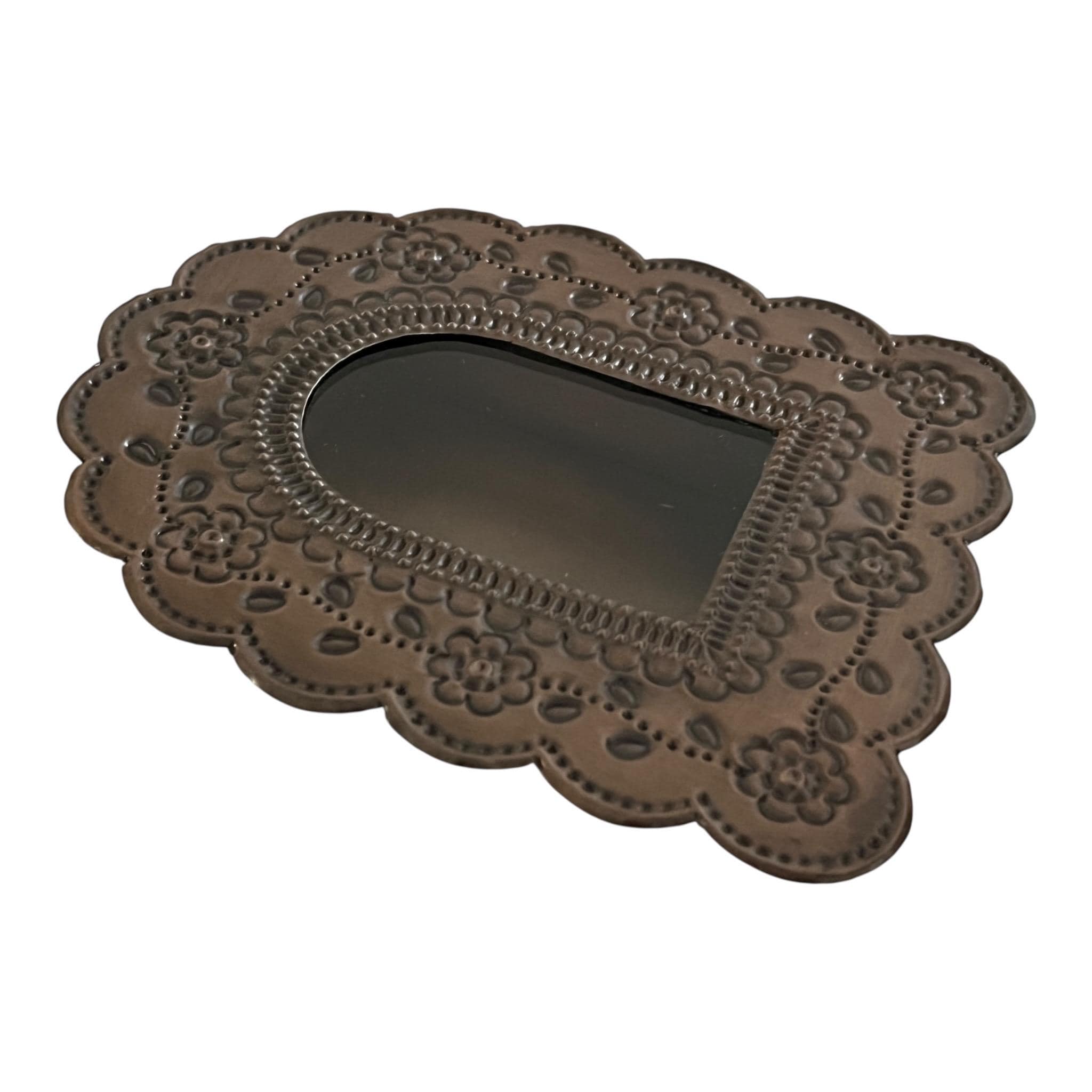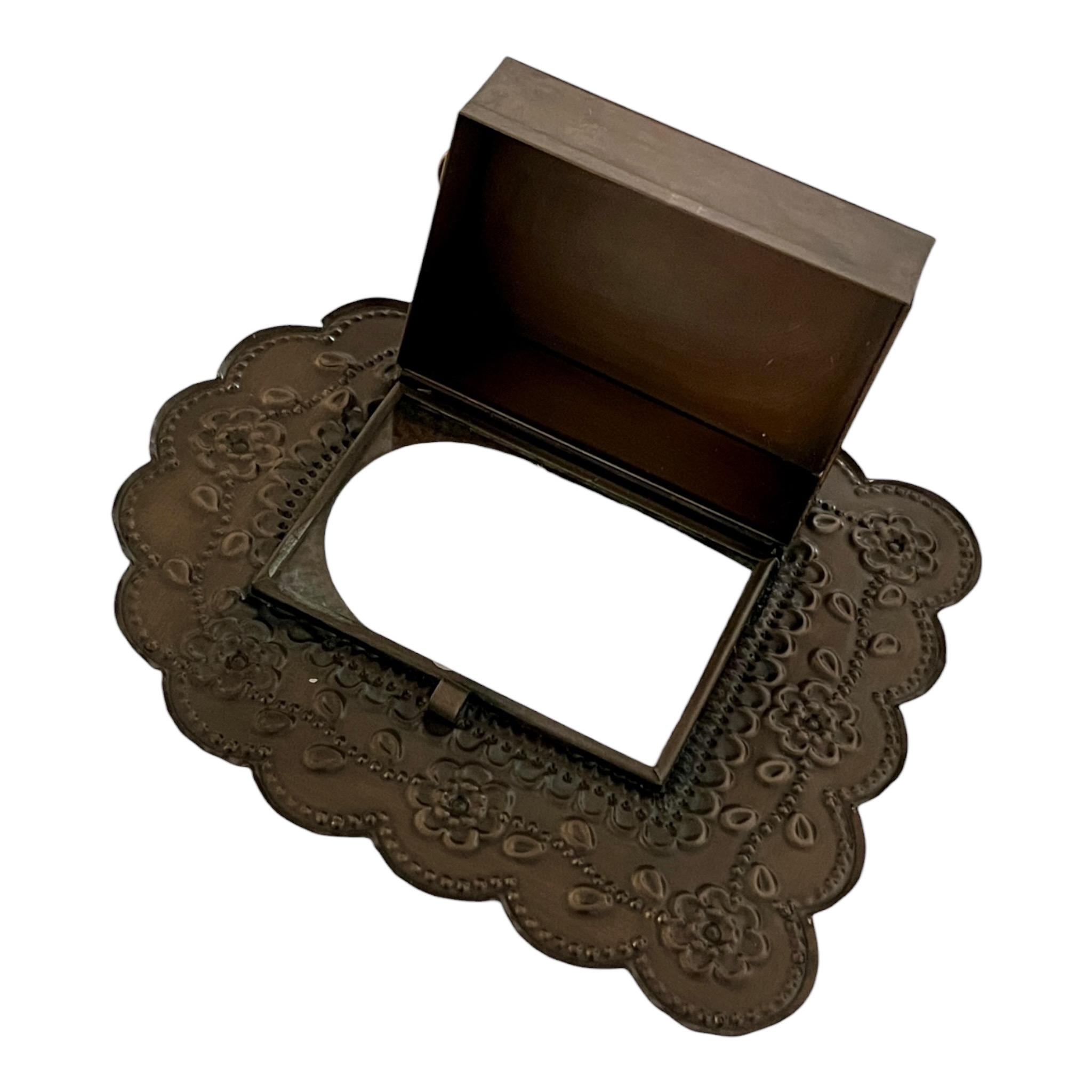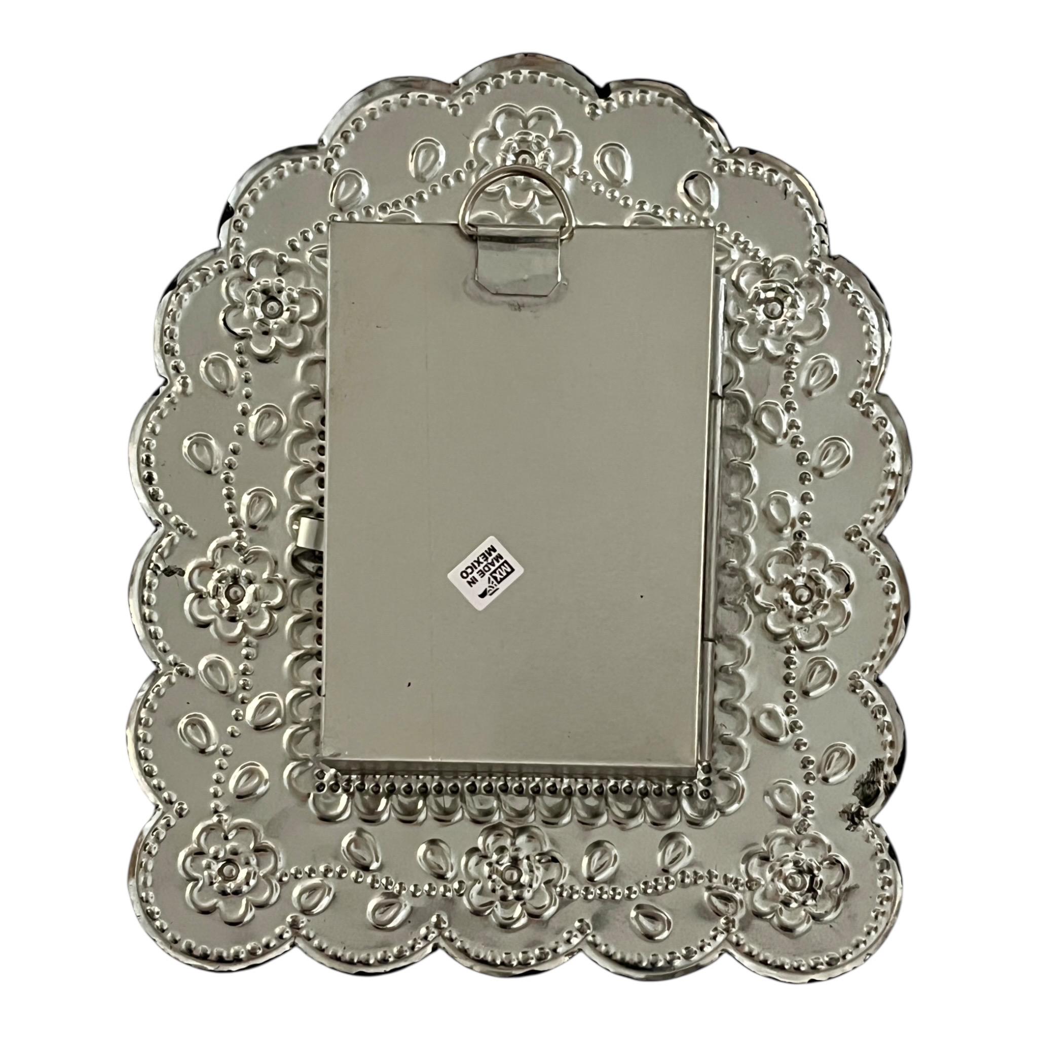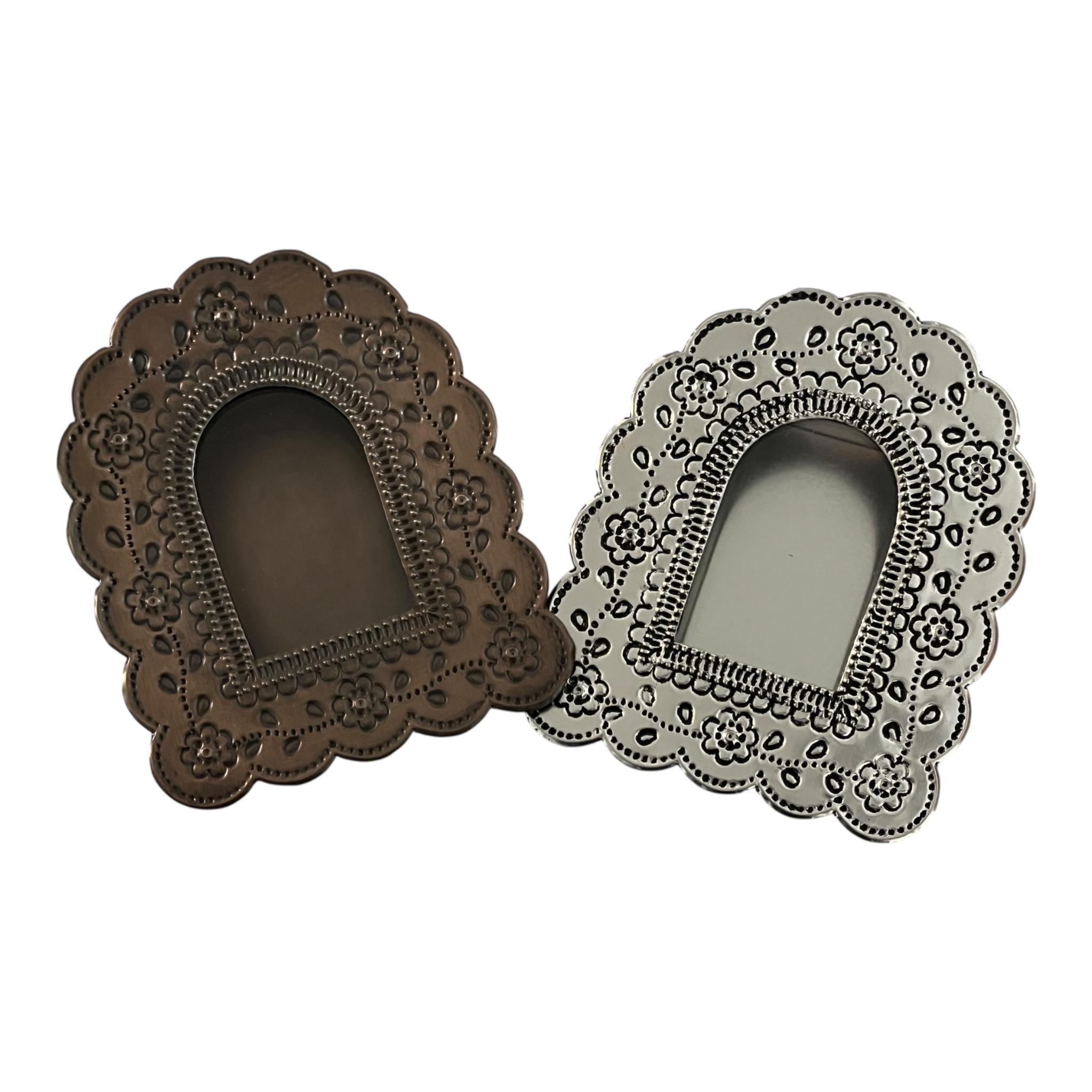 Arched tin nicho frame with pretty floral design and scalloped edge. There is an optional small tin Sacred heart magnet.