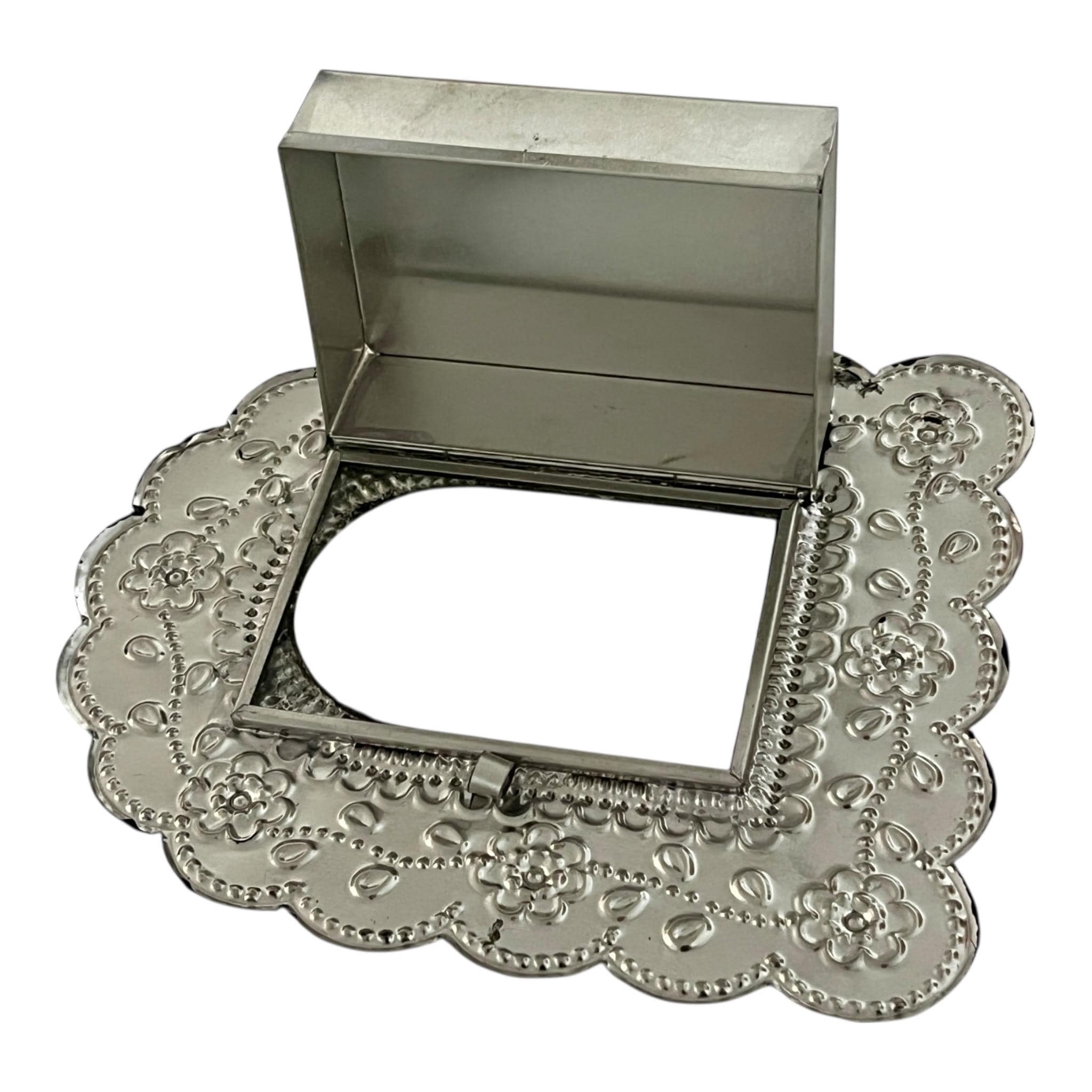 The Nicho has a hinged glass door with frame to add your own image or trinkets.