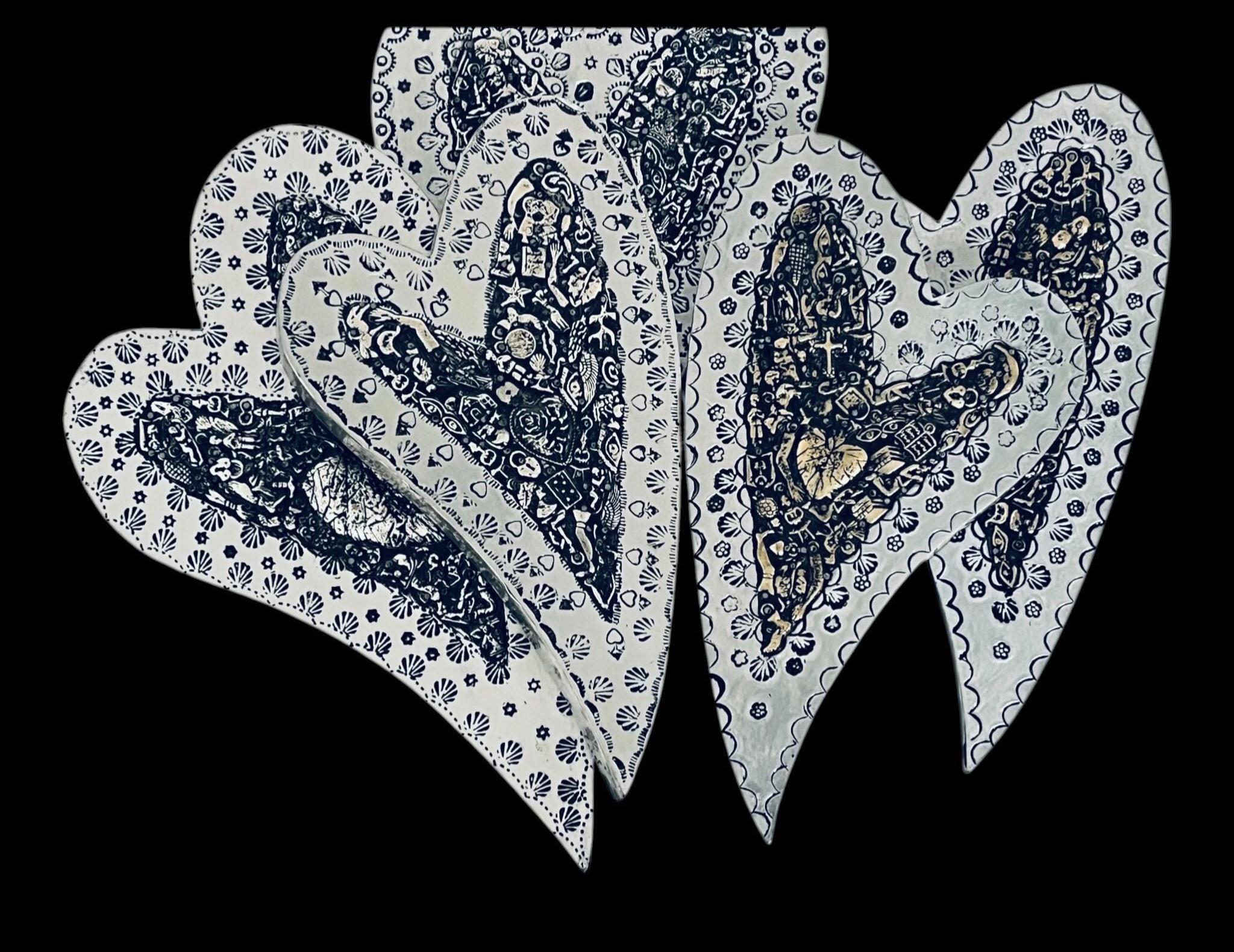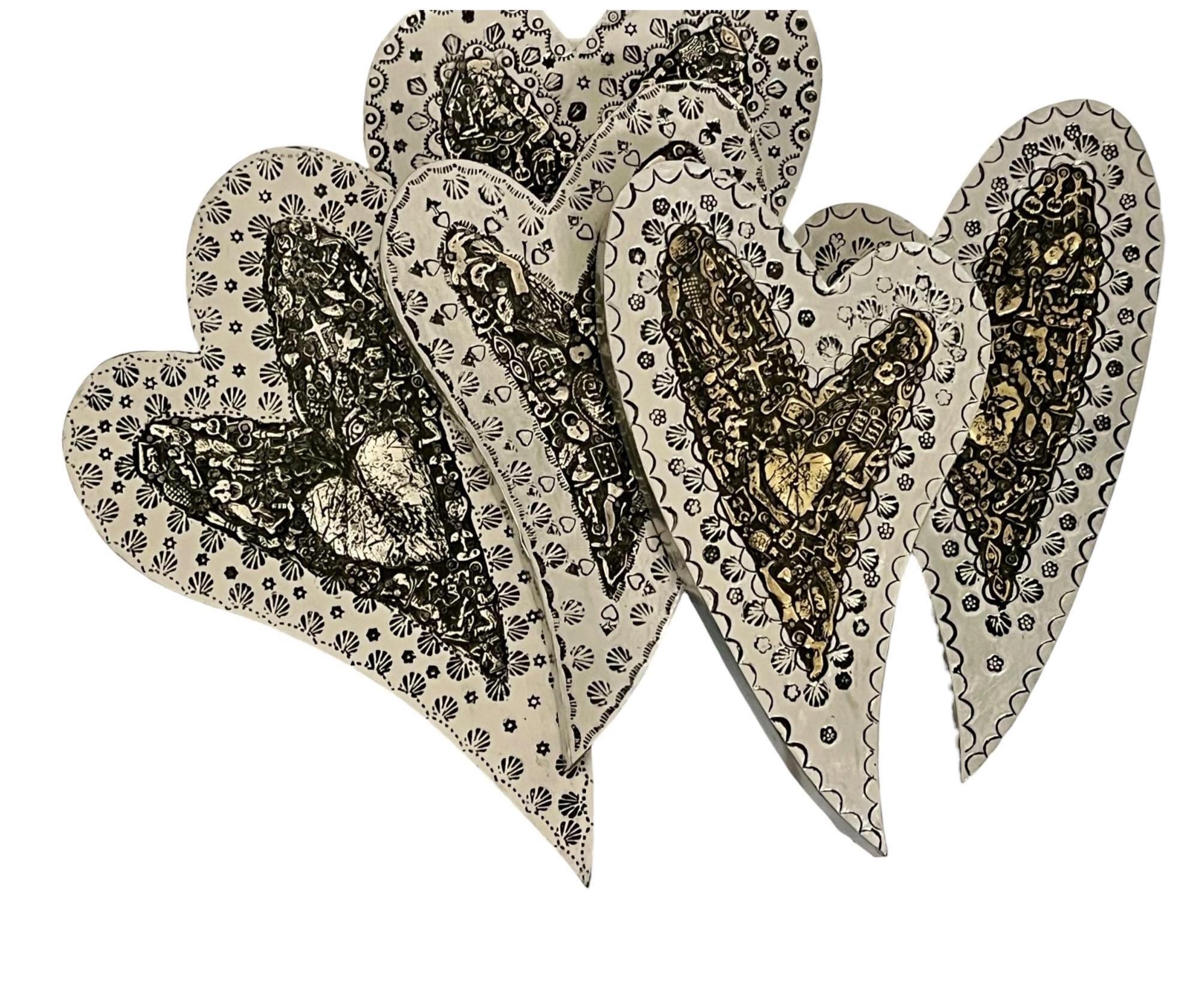 The center heart is painted black and covered in antiqued silver or gold toned Milagro charms.