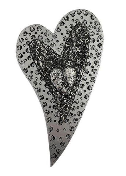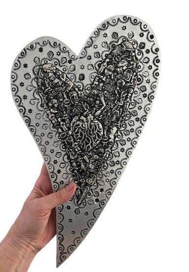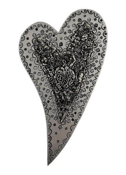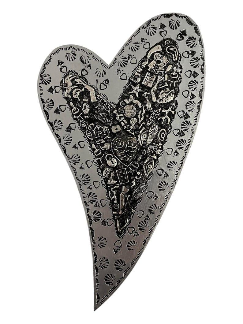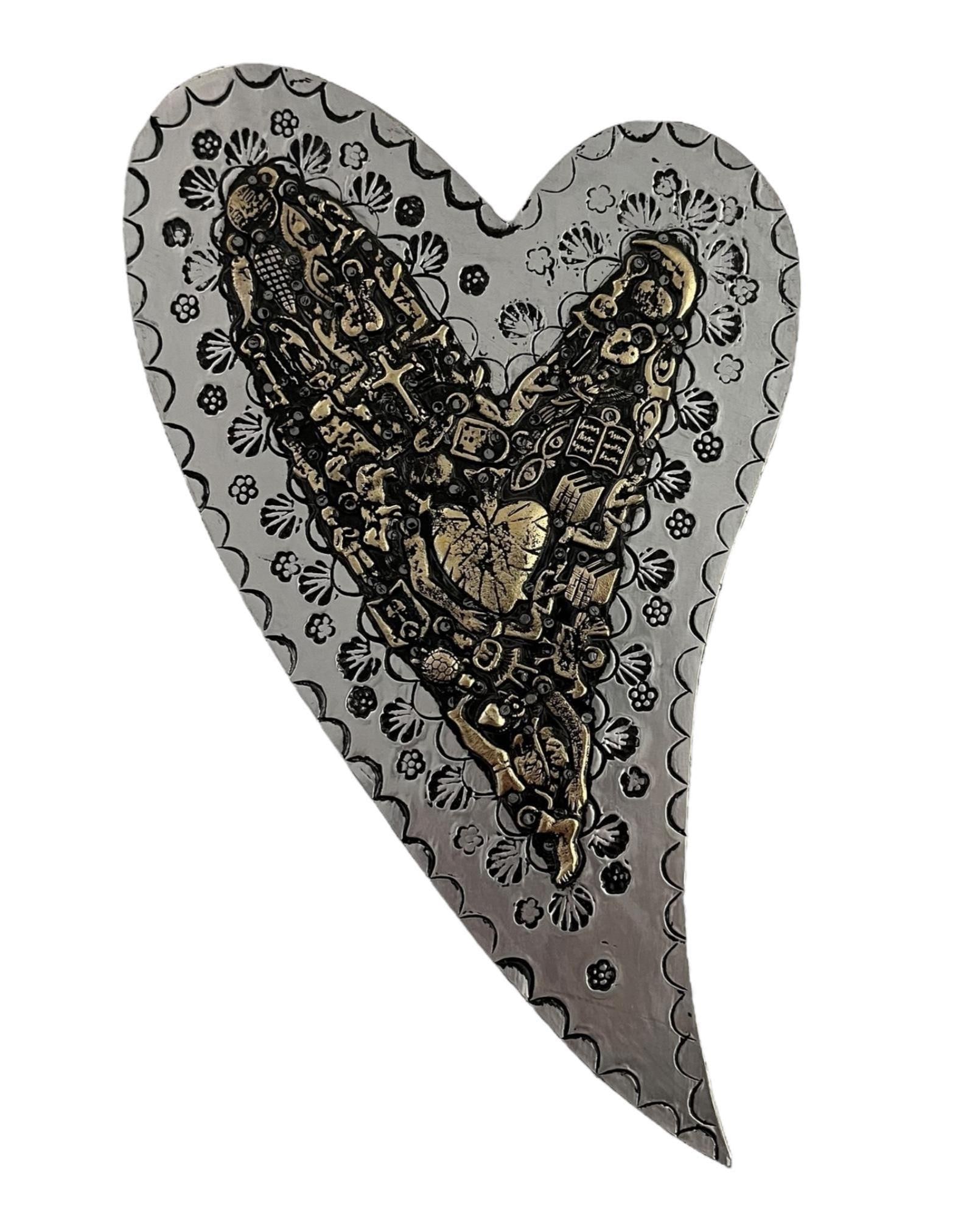 Carved wood heart with edges wrapped in embossed tin (repujado).