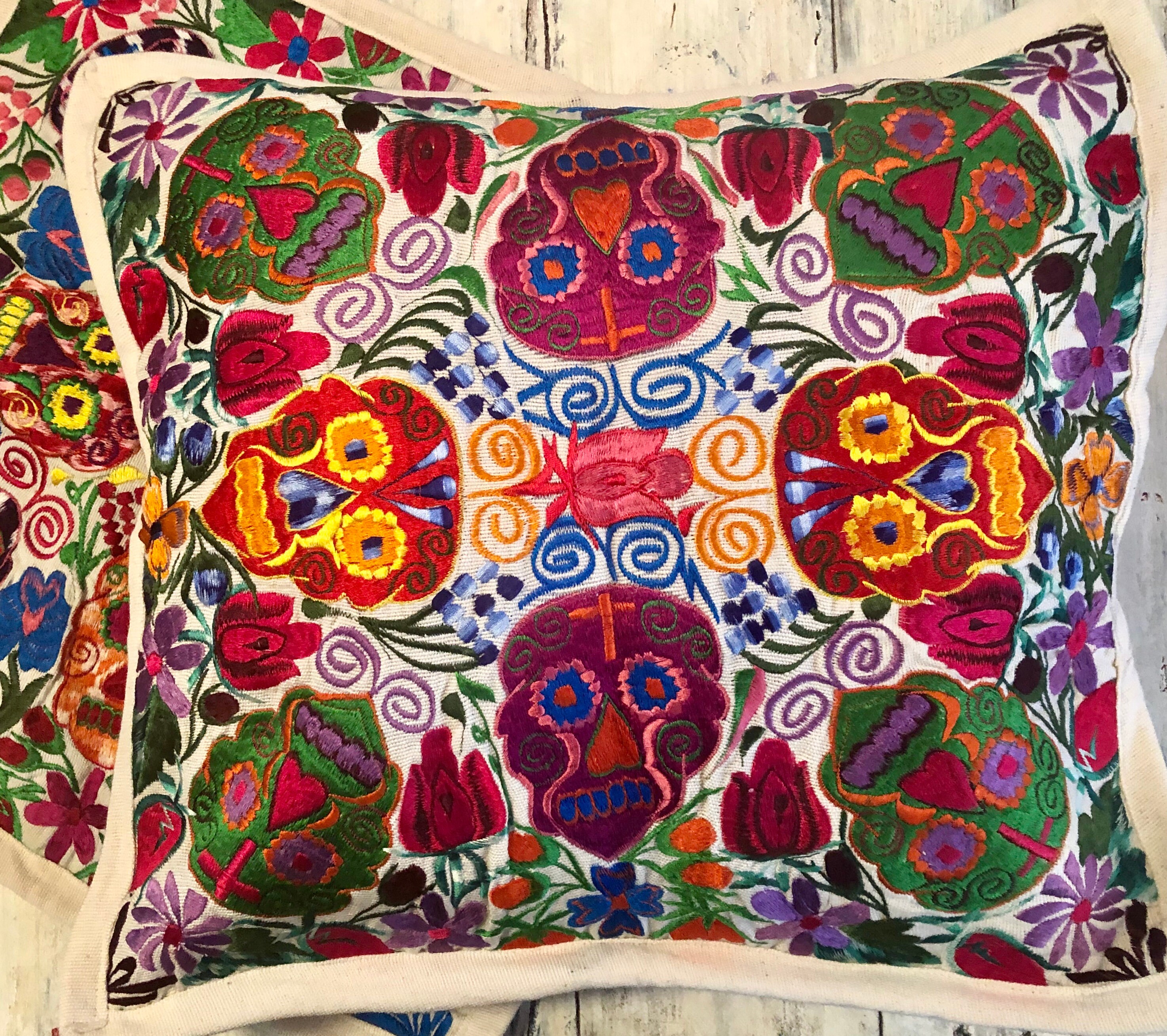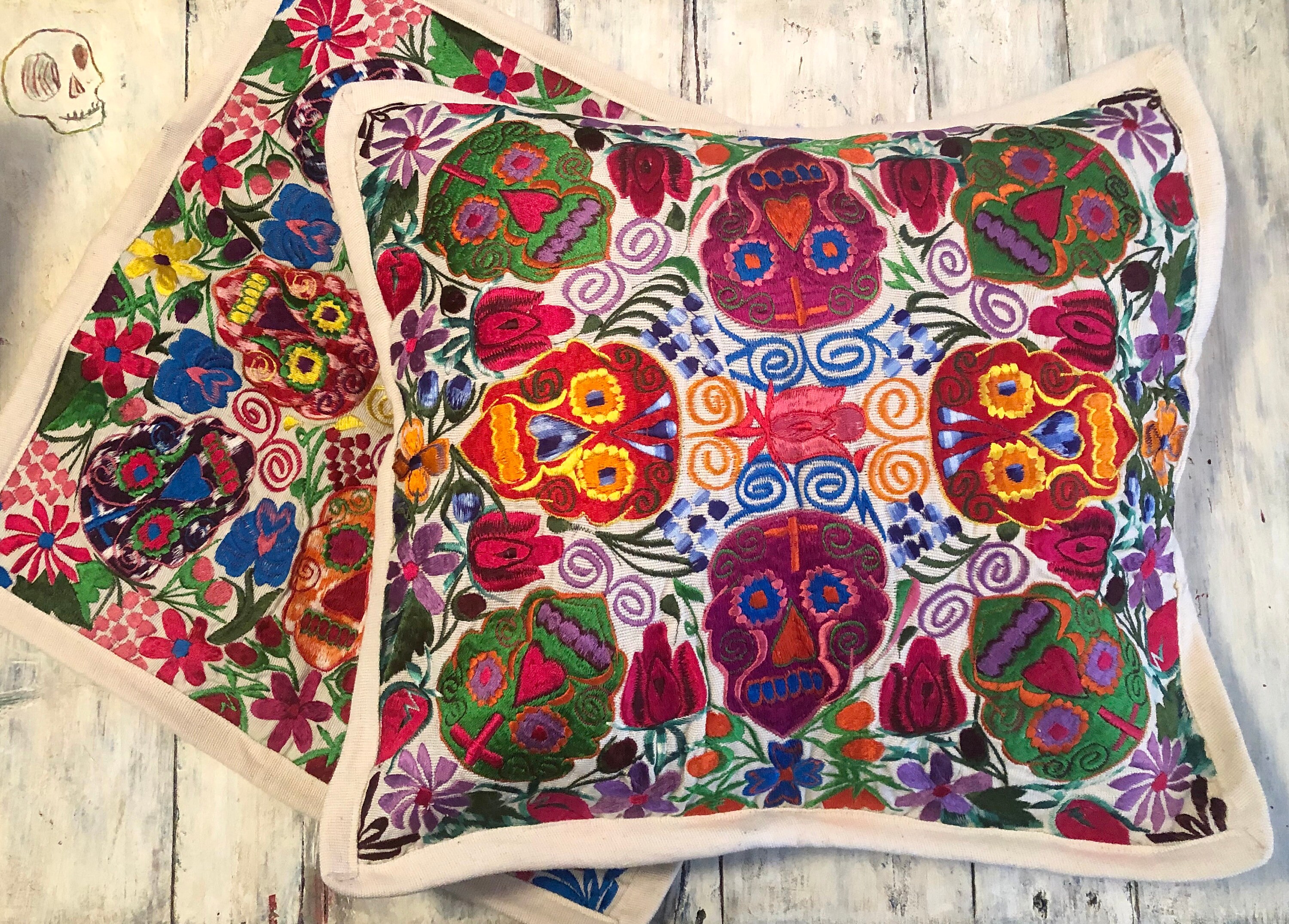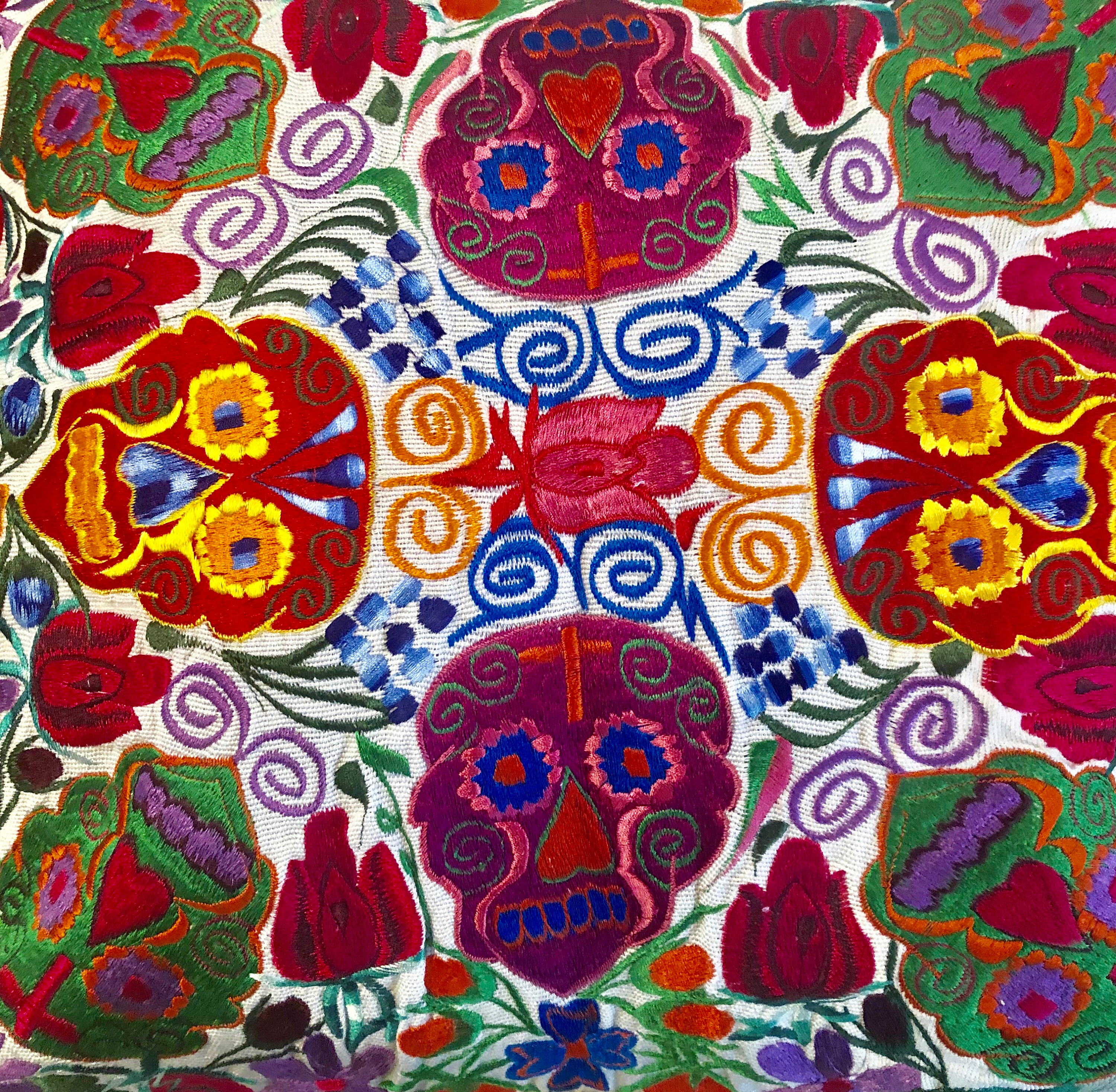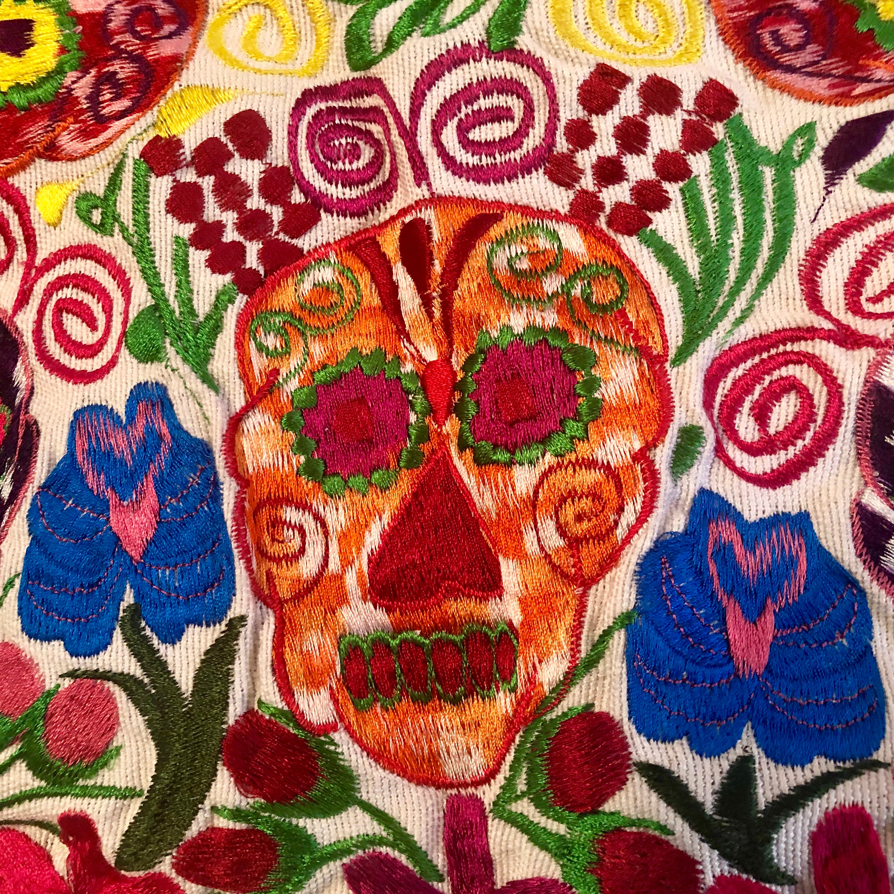 Fun embroidered Day of the Dead pillow covers. Off white background with cheerful bright multi color Sugar Skulls design.