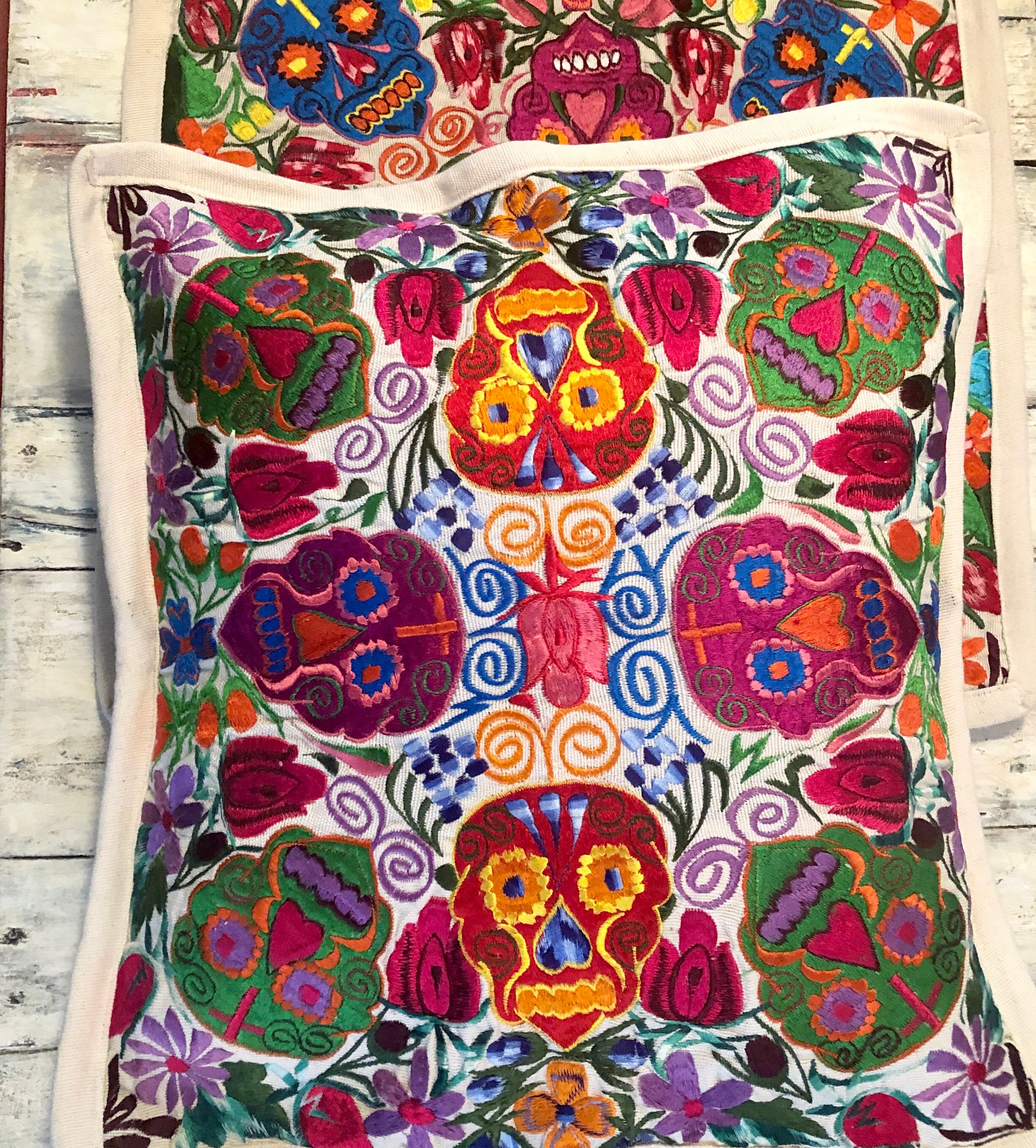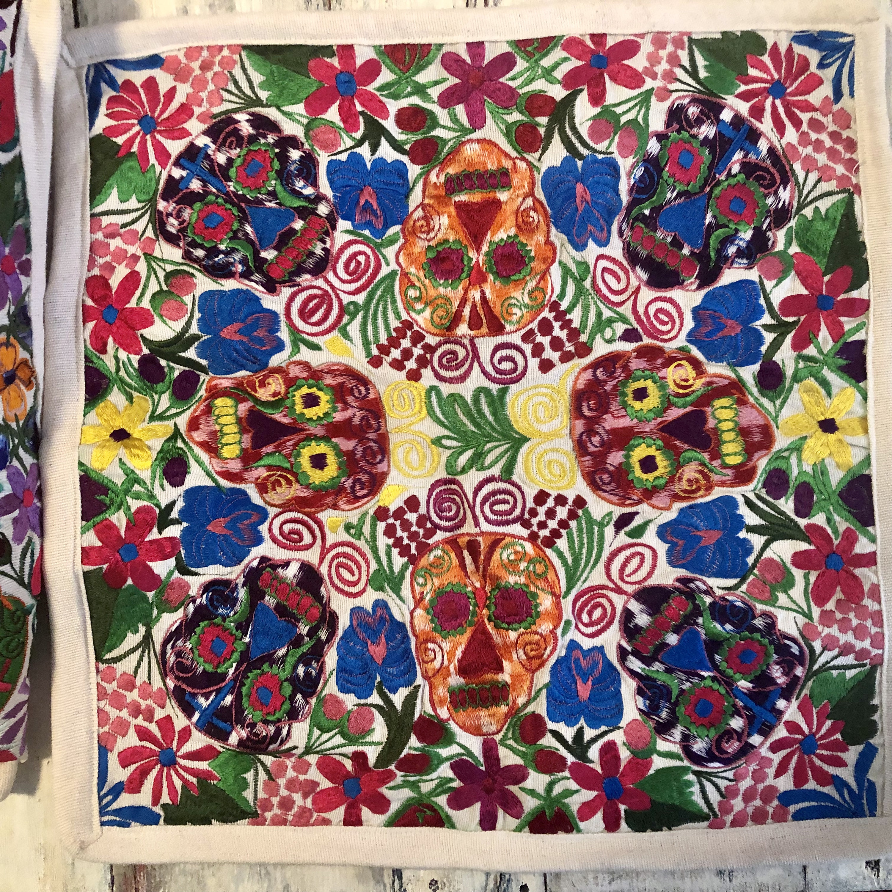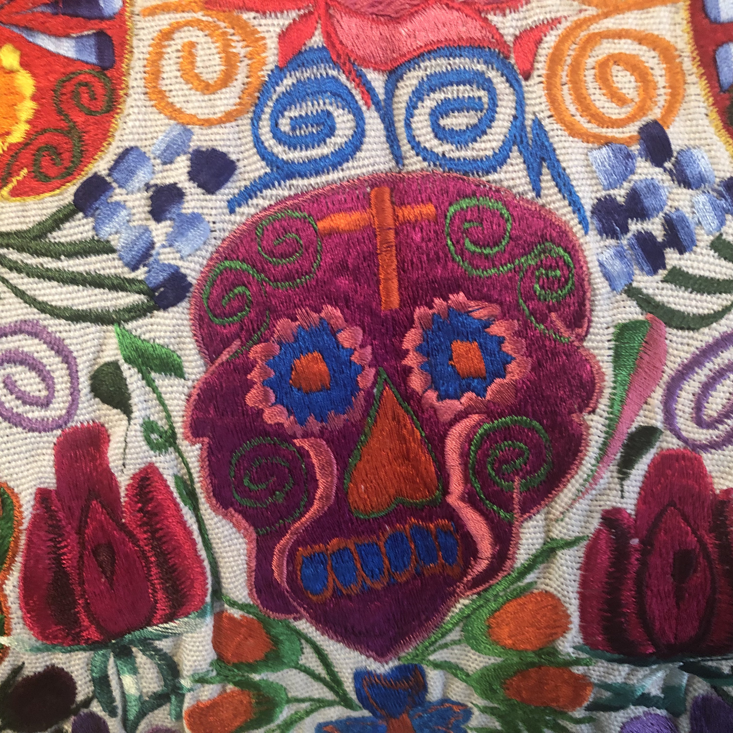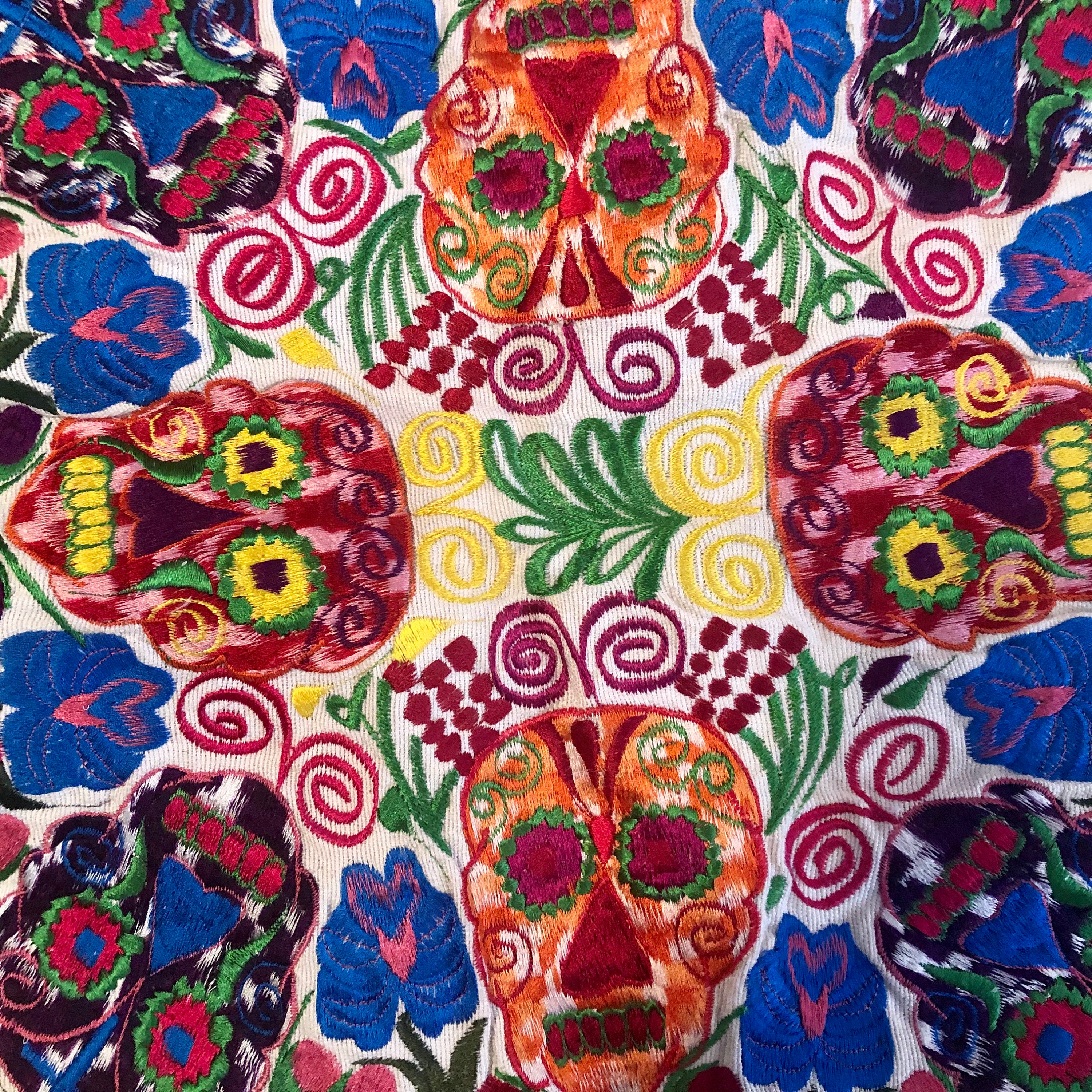 Fun embroidered Day of the Dead pillow covers. Off white background with cheerful bright multi color Sugar Skulls design.